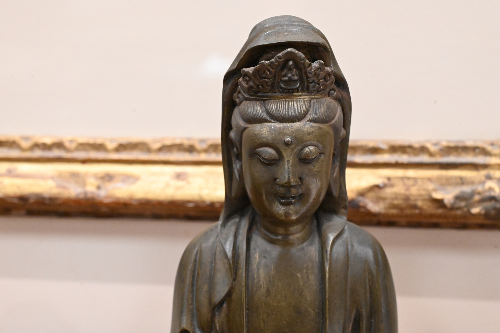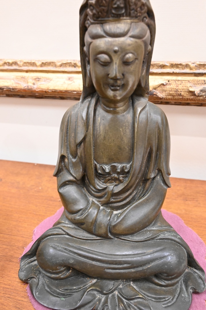 Lot 496: Bronze Guanyin Figure, wearing a robe and seated with legs crossed, 18th century or later, height 7 3/4 inches.