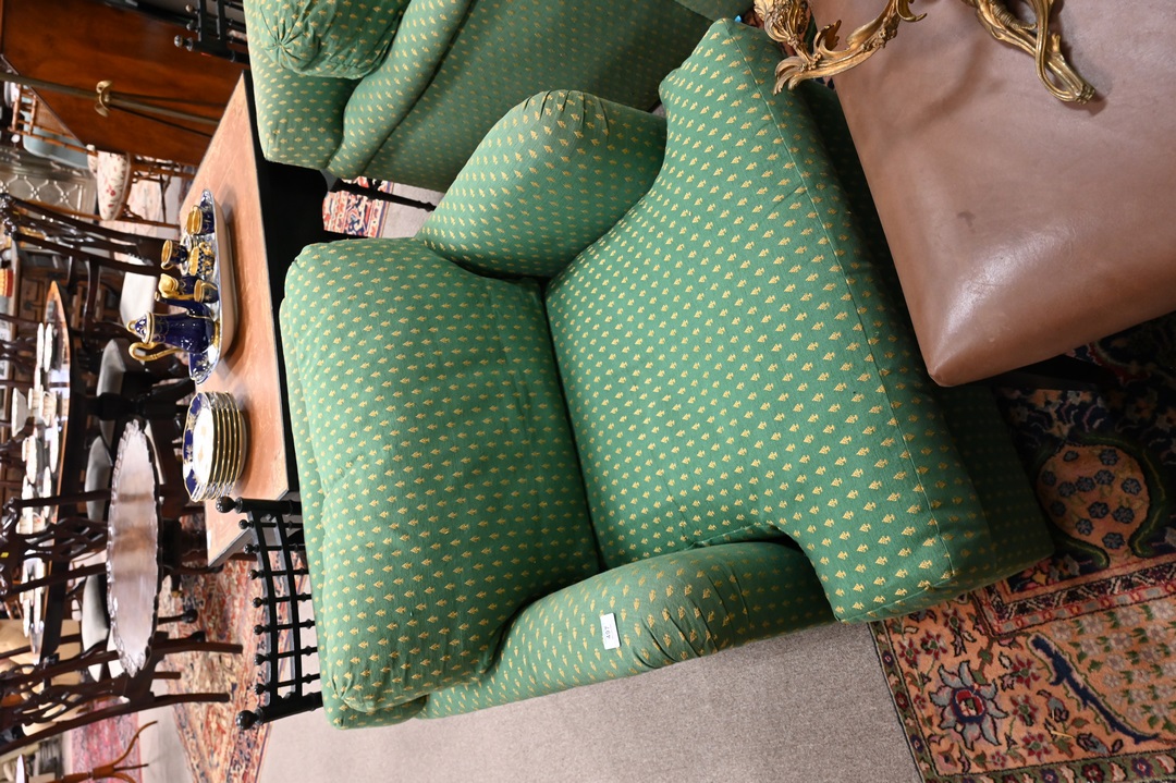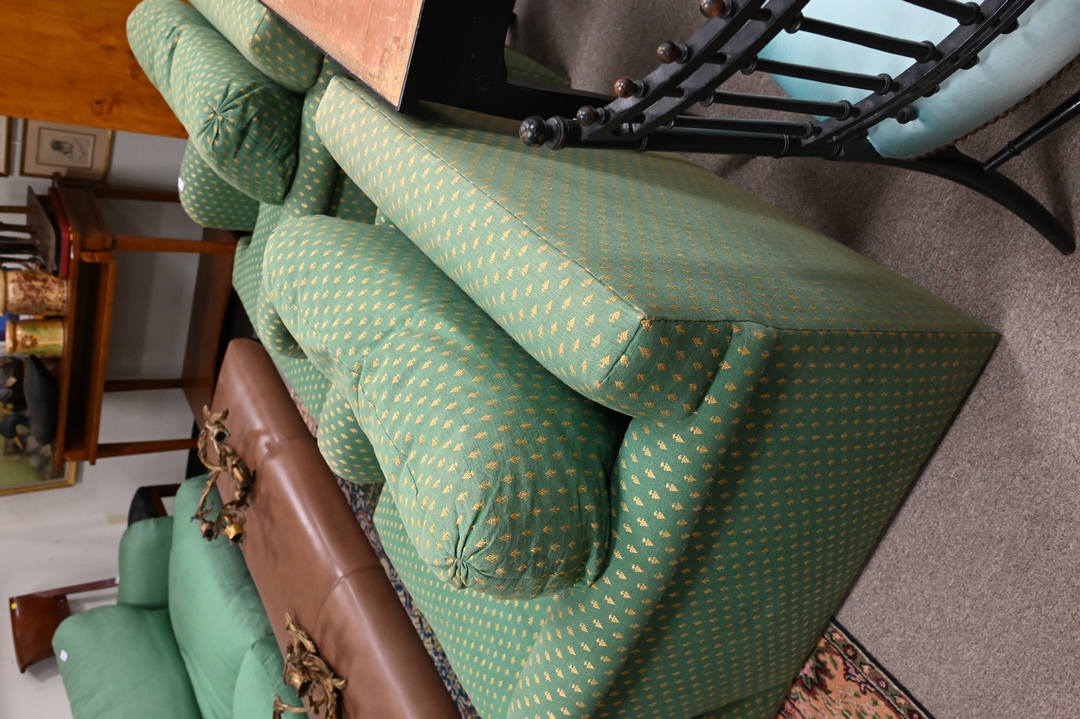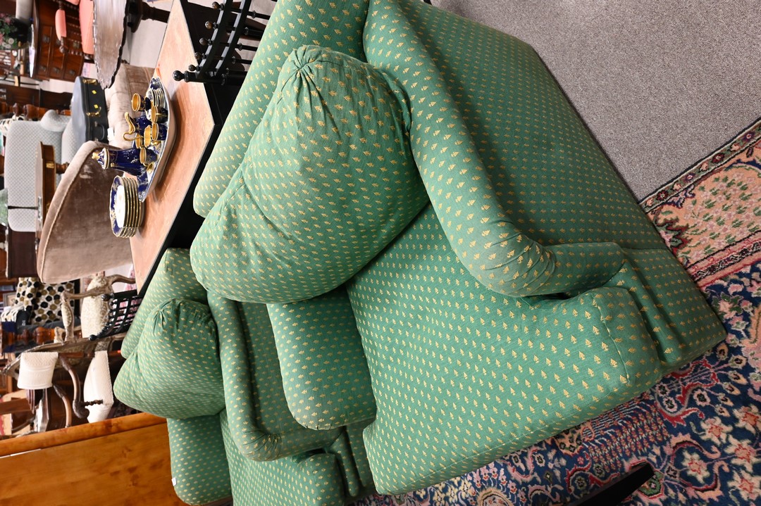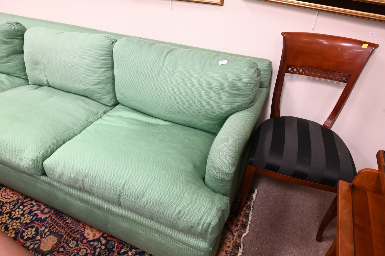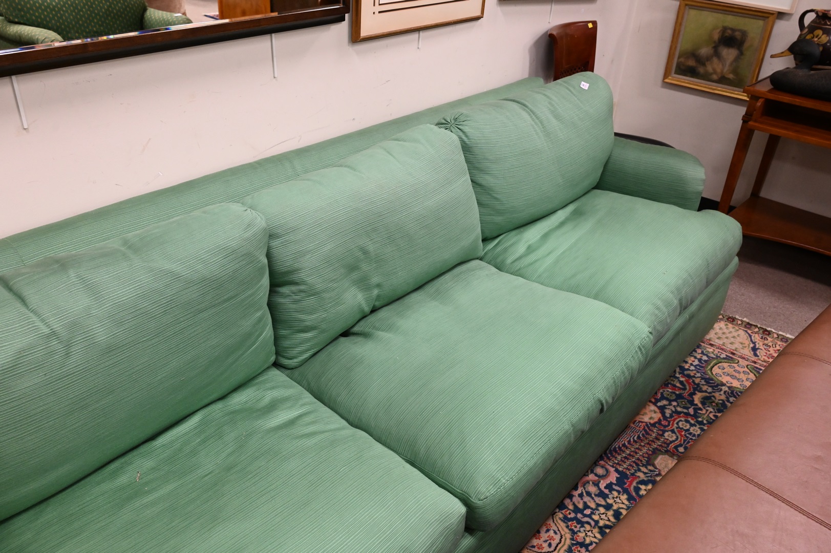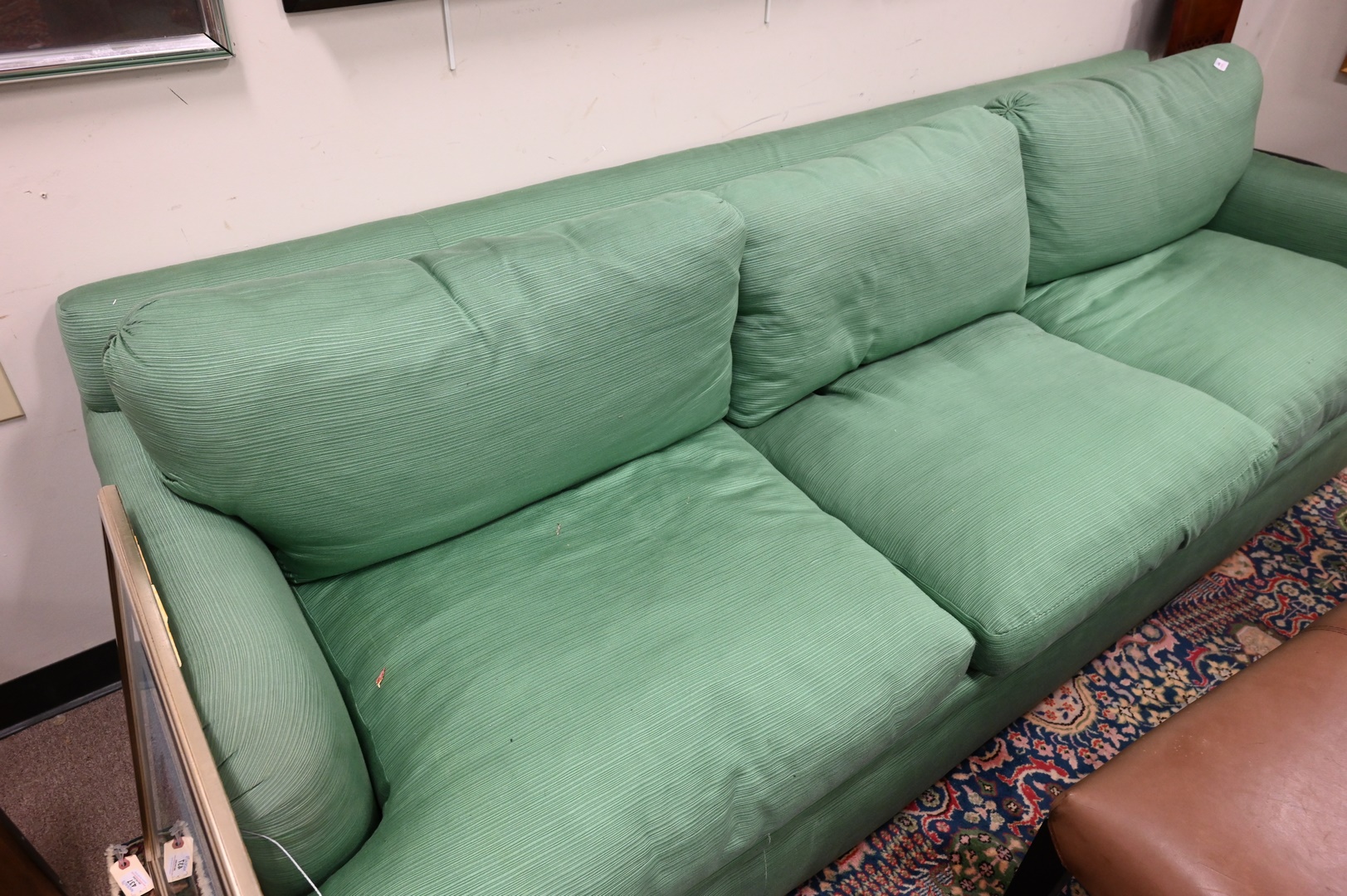 Custom Upholstered Sofa, having three cushion seating, height 30 inches, length 94 inches.