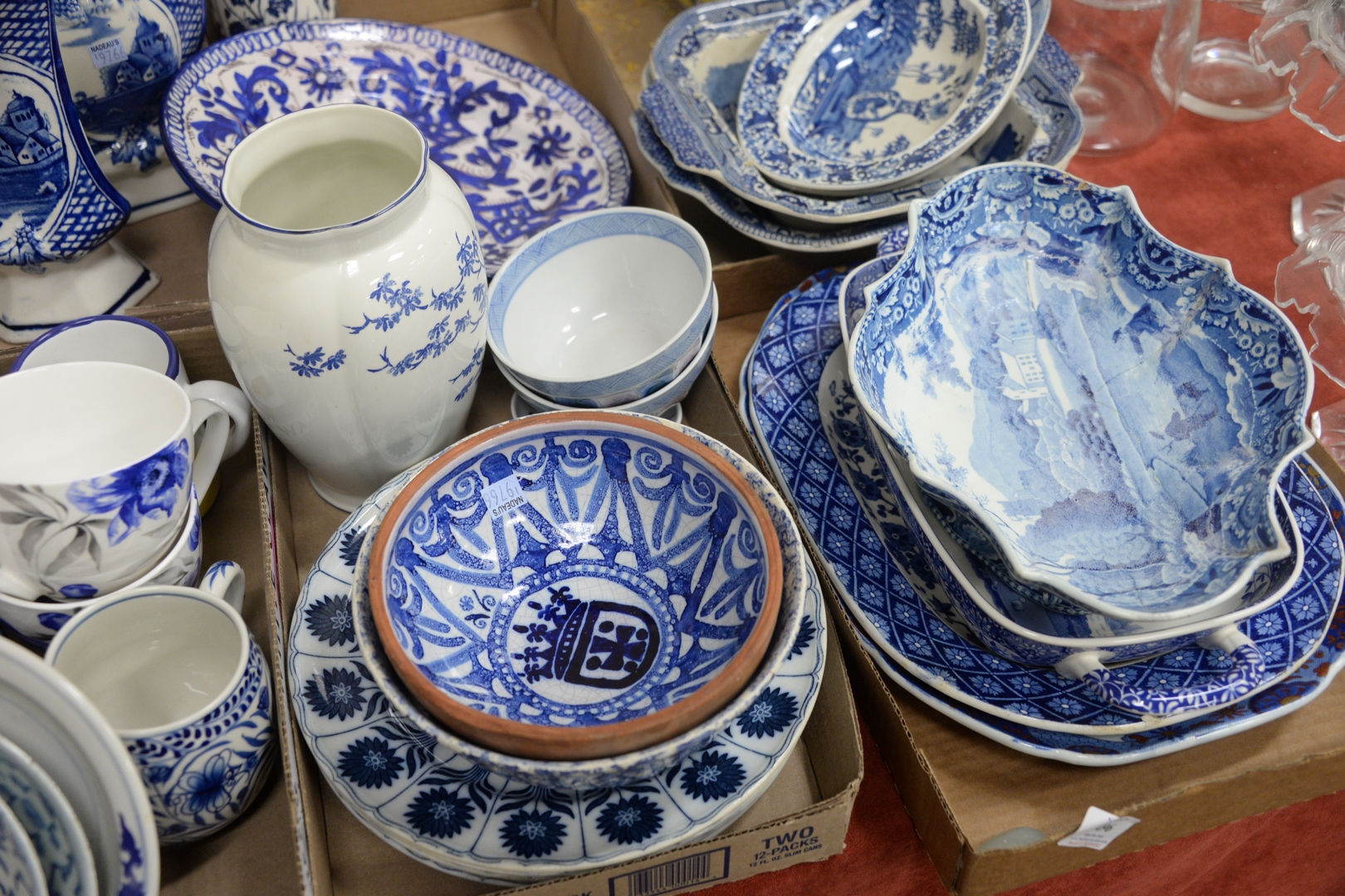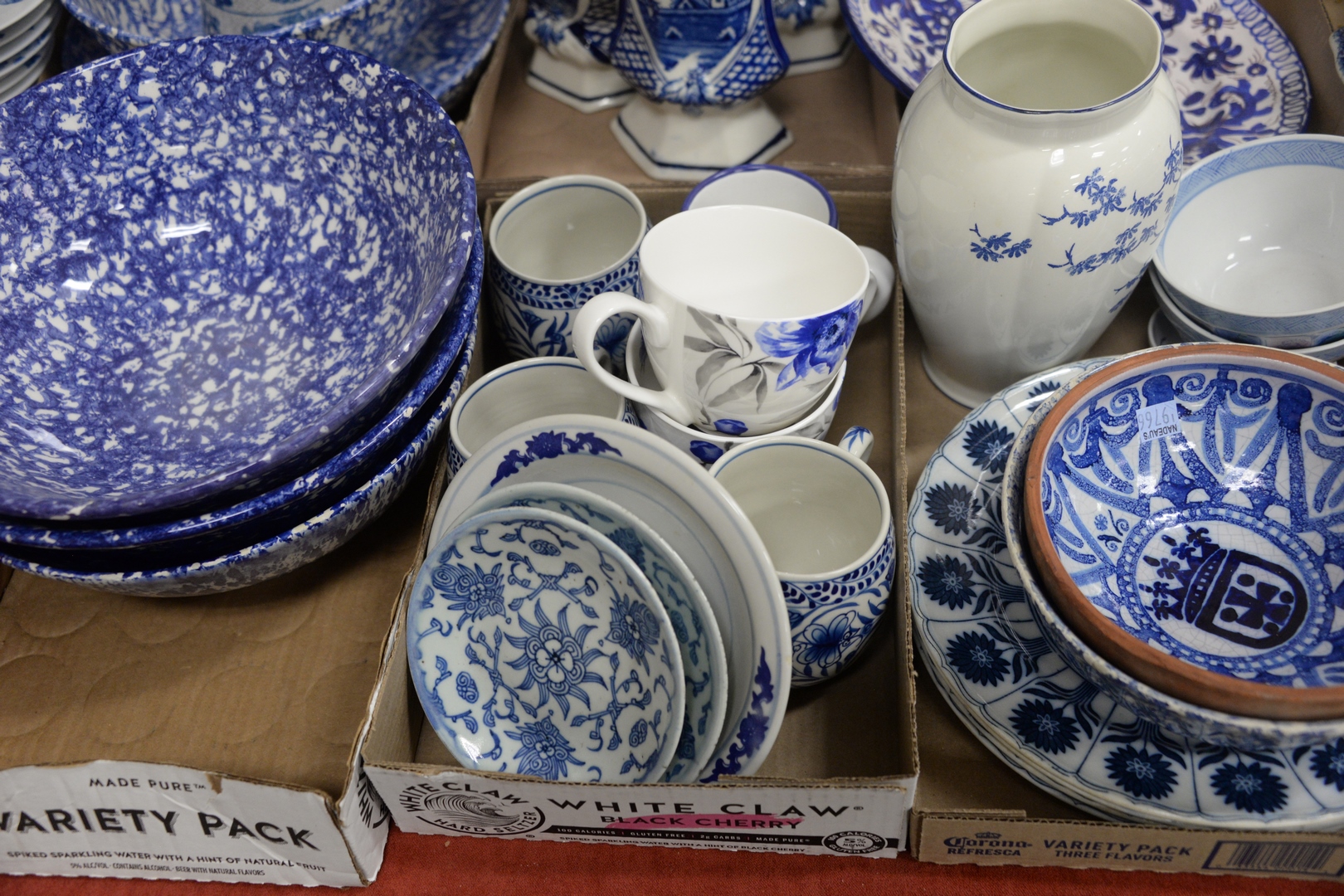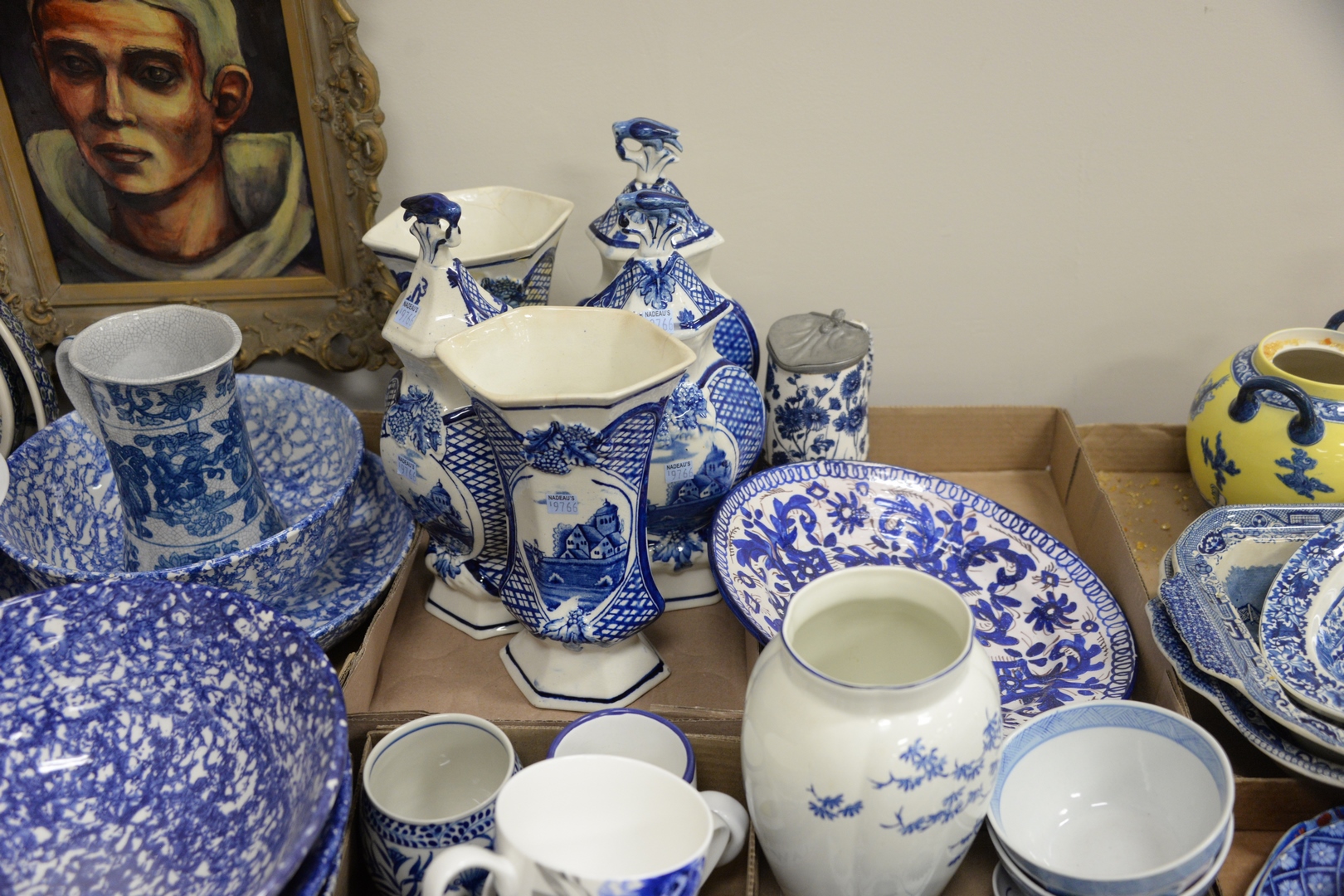 Lot 496: Eight Box Lots, to include 5 spatterware bowls 5 Delftware urns along with blue and white porcelain mugs.