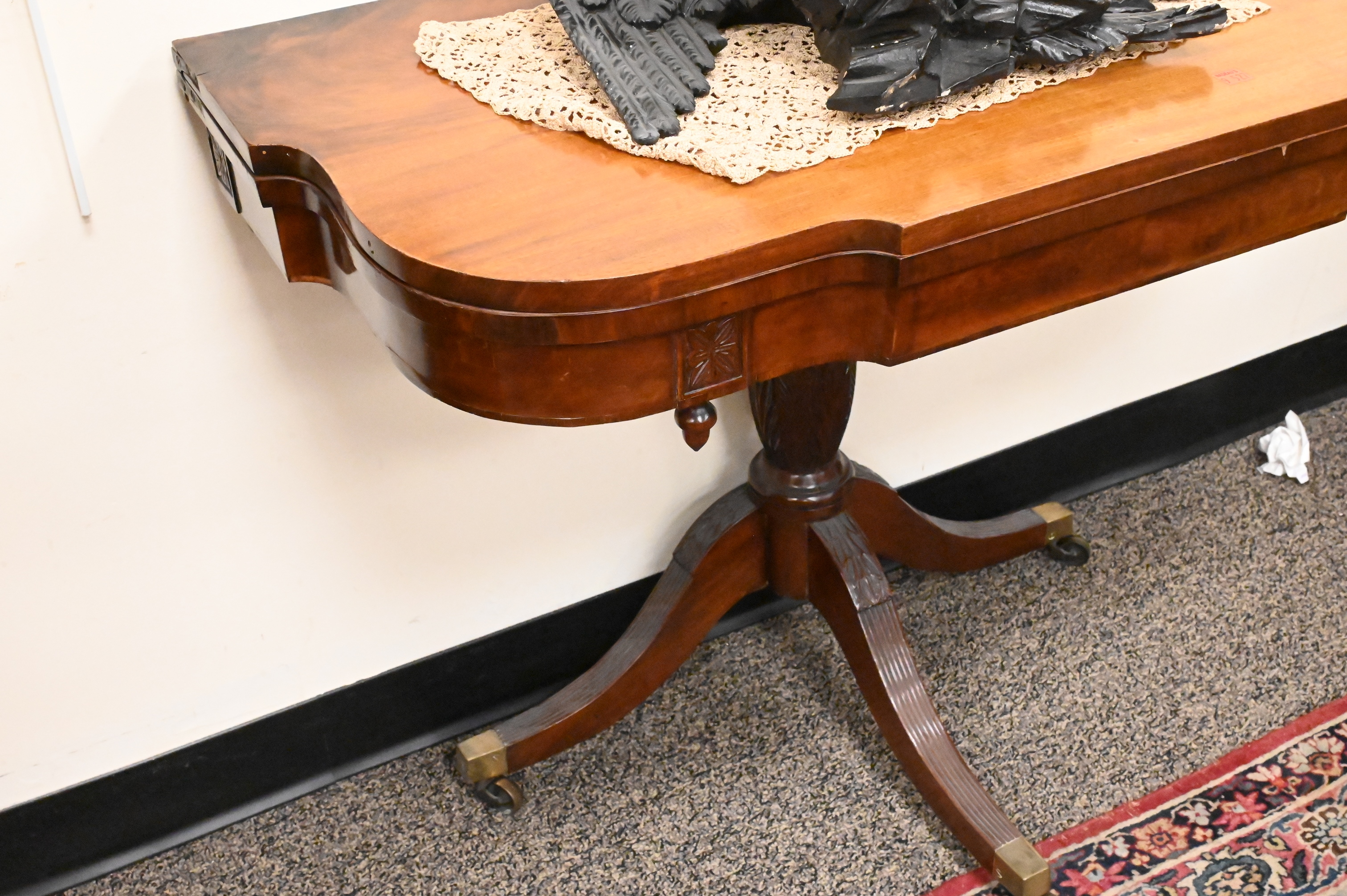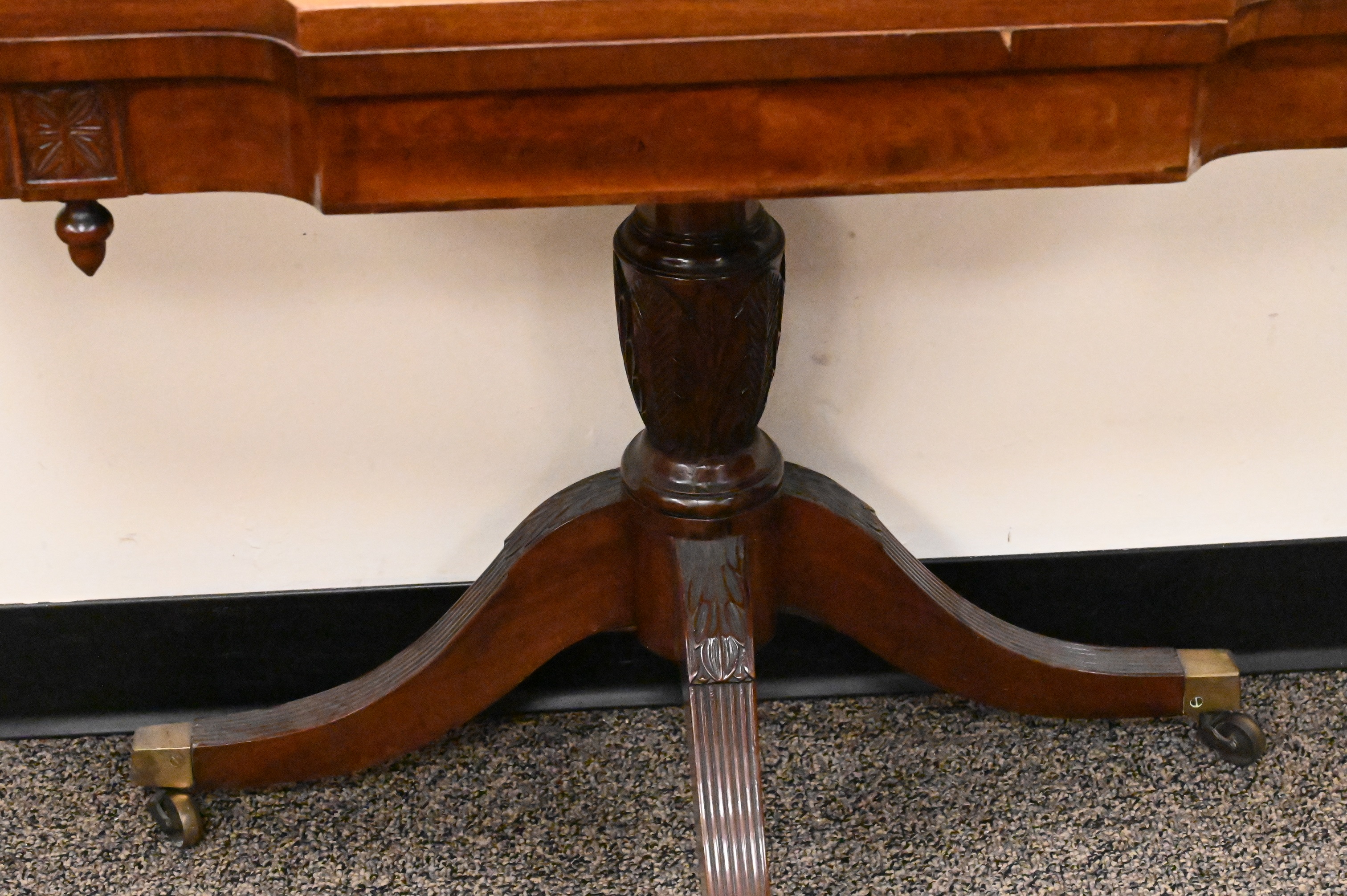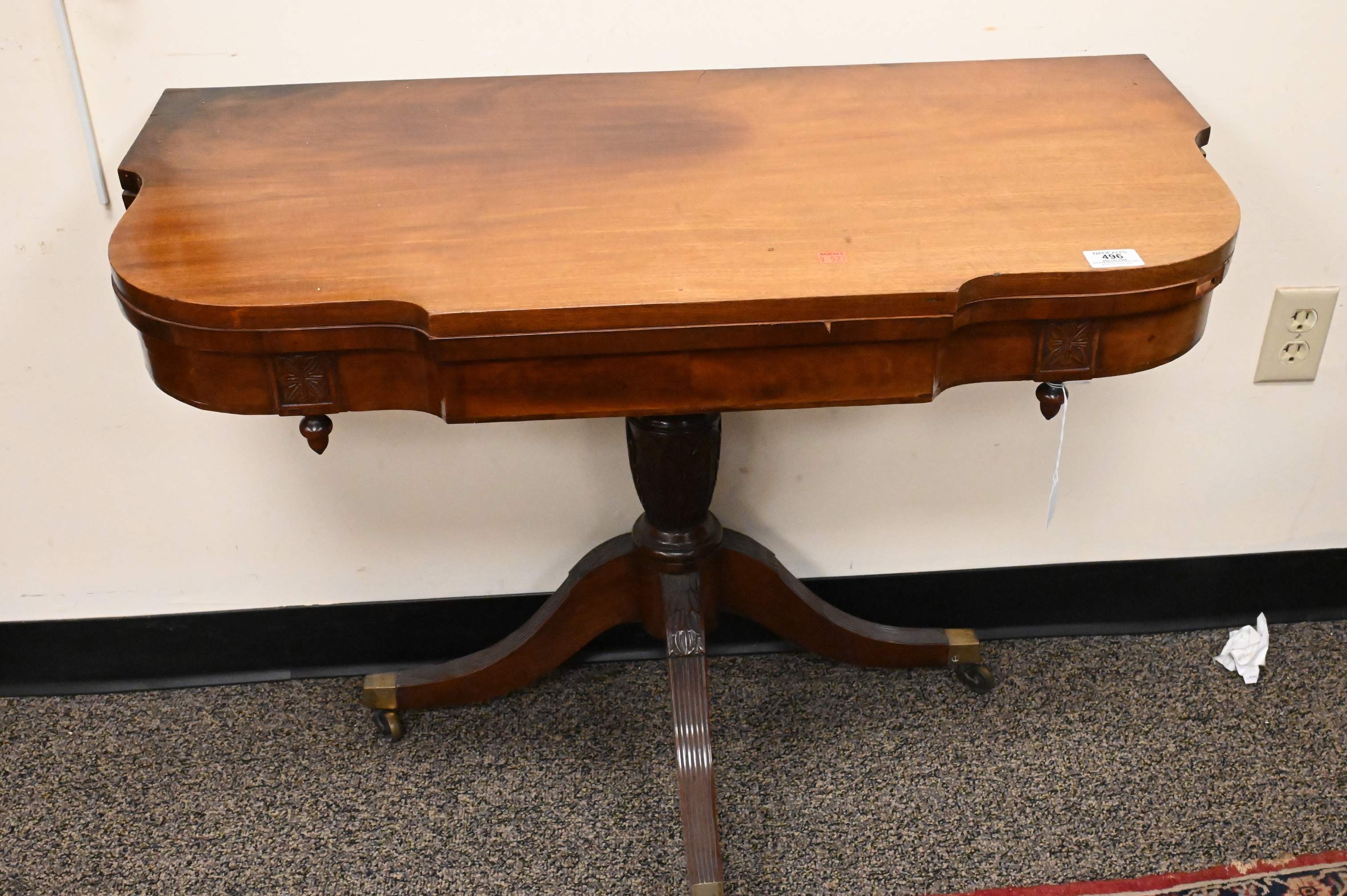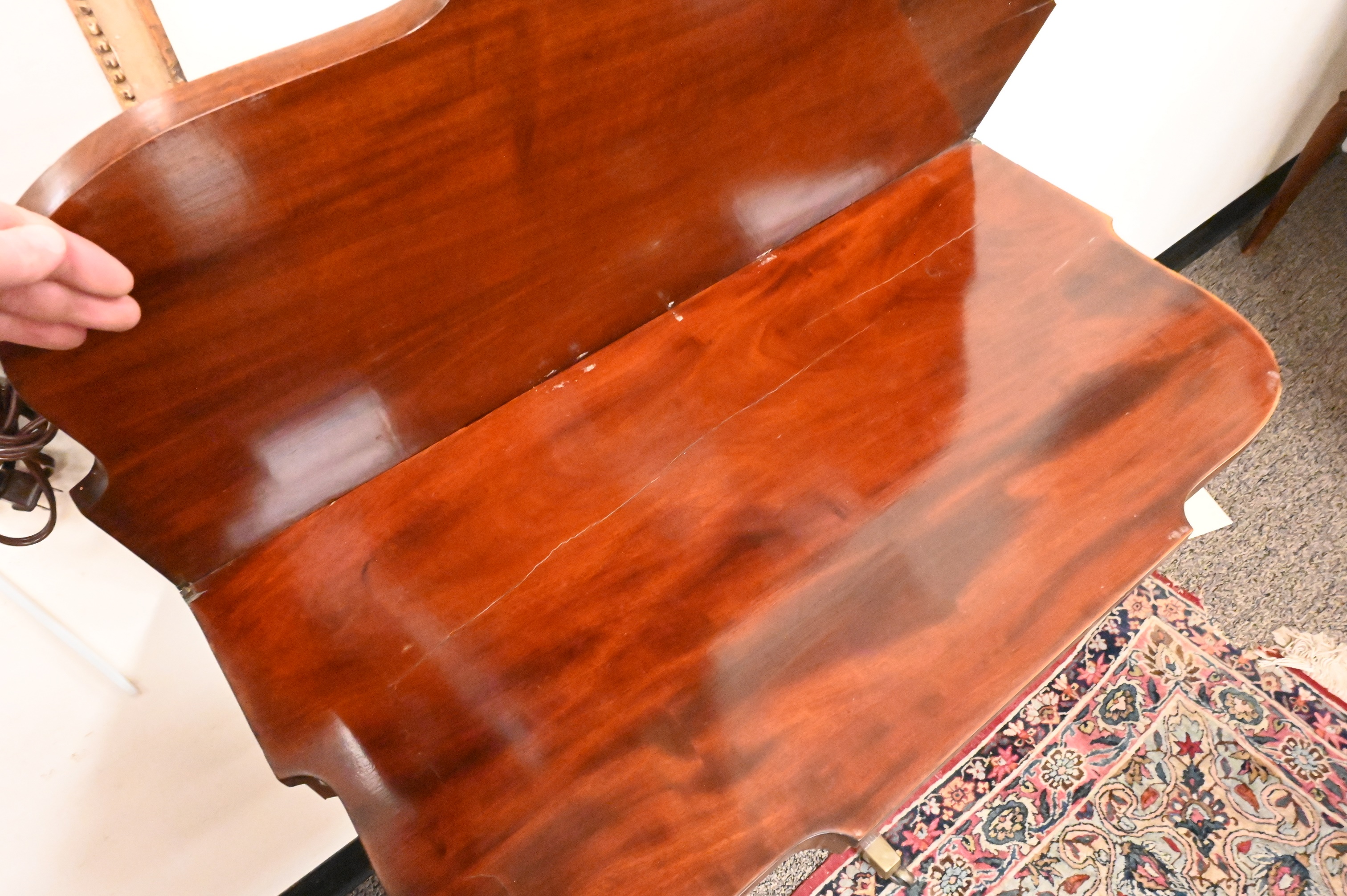 with shaped top on carved shaft and tripod base, circa 1820, sun faded and veneer missing front left edge