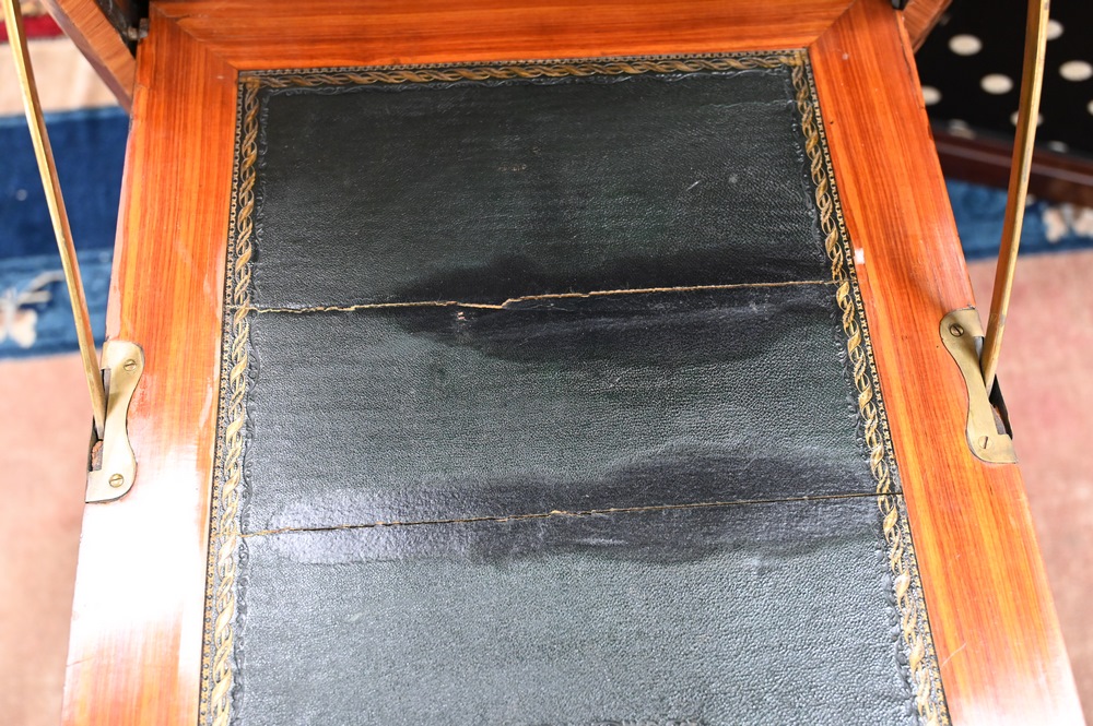 Louis XVI Rosewood and Kingwood Commode, having a marble top over two drawers with parquetry inlaid center panel and sides set on turned and fluted legs, (marble professionally repaired on corner), 18th century, height 32 1/2 inches, top 19 1/2 x 35 1/2 inches.