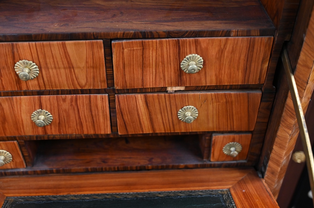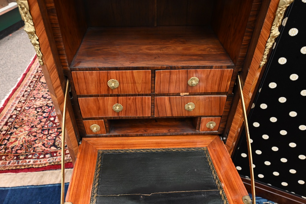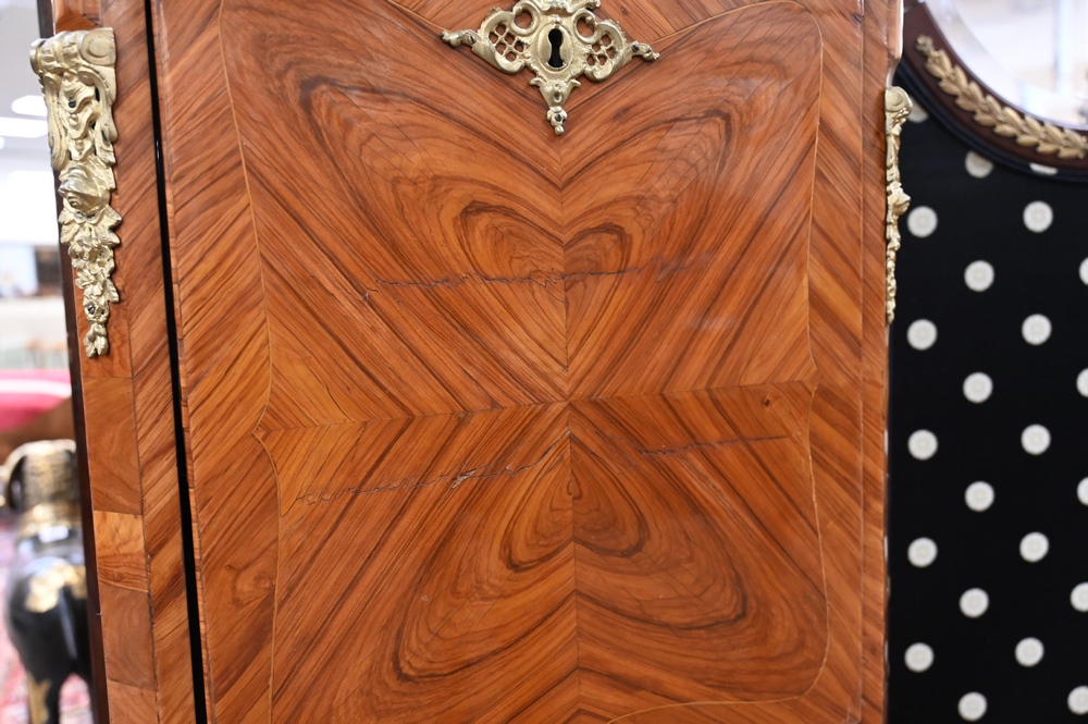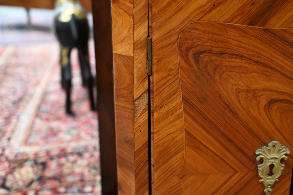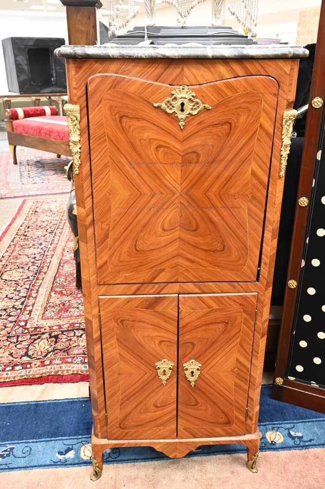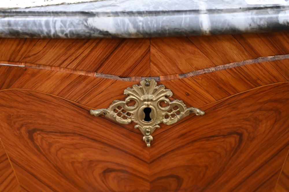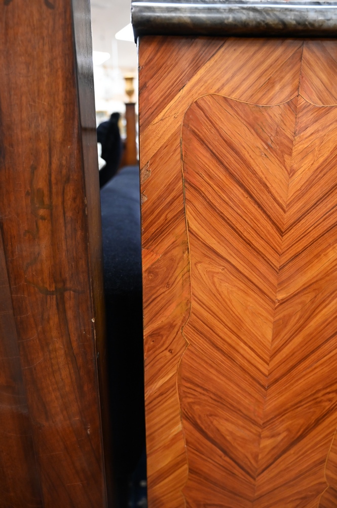 Lot 496: Louis XVI Rosewood and Kingwood Commode, having a marble top over two drawers with parquetry inlaid center panel and sides set on tu…