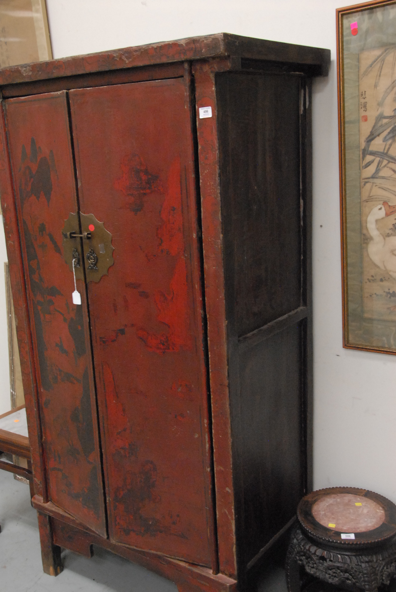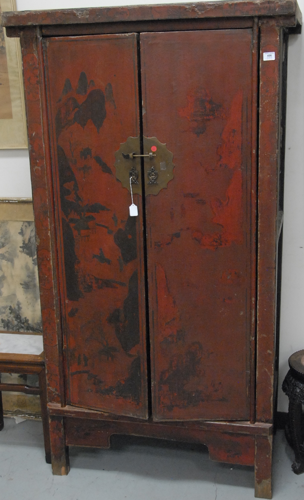 Lot 496: Provincial red lacquer armoire double door, painted with landscape and four interior shelves, China, 19th centuryback panel drilled. opening 31 1/2in. ht. 74 1/2in. wd. 37in. dia. 21in.