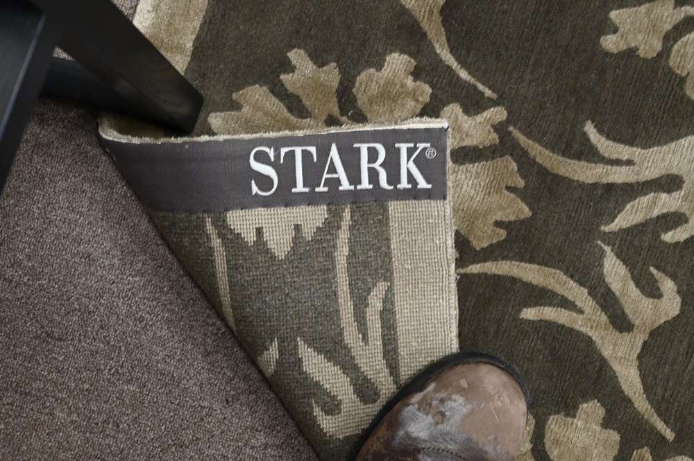 Stark Custom Room Size Carpet with tan and brown floral relief, 11′ 2″ x 15′ 4″.