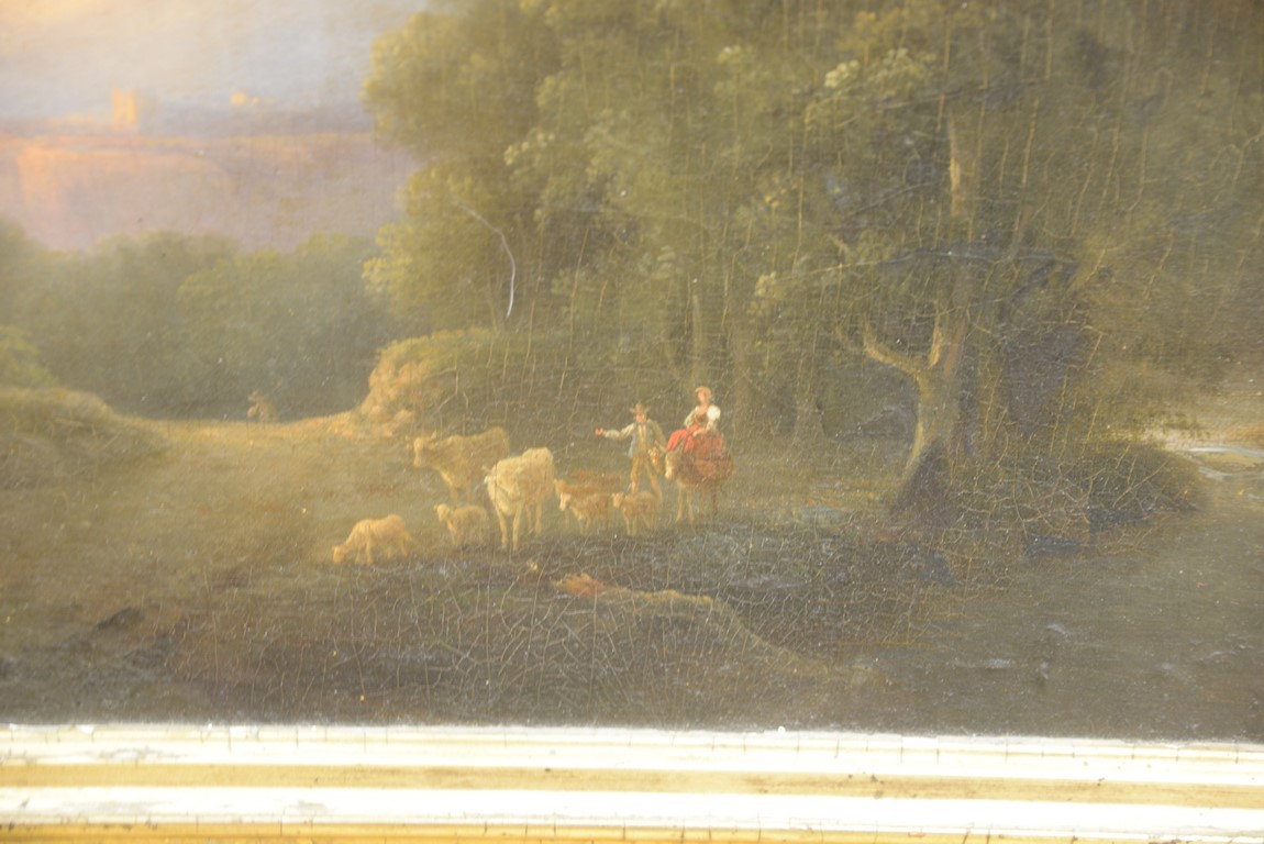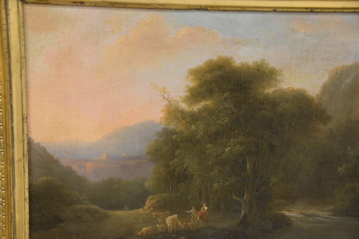 Lot 496: Style of Thomas Cole 1801-1848 Shepherdess in Sunset Landscape oil on canvas mounted on masonite unsigned restored 1…
