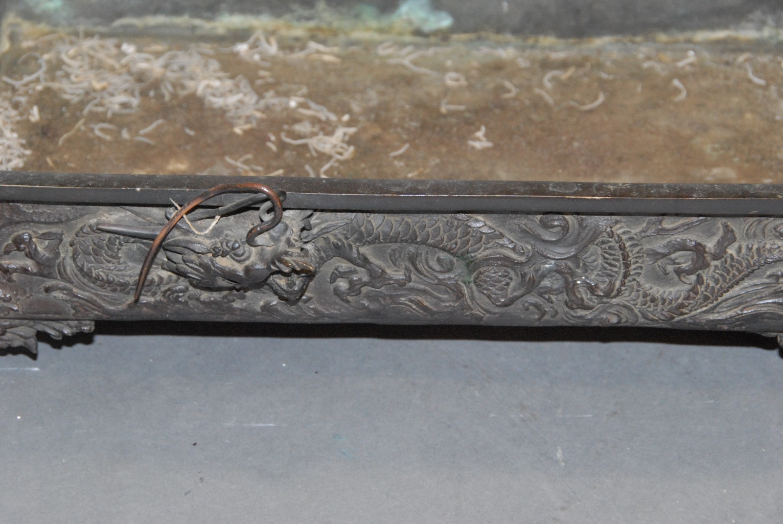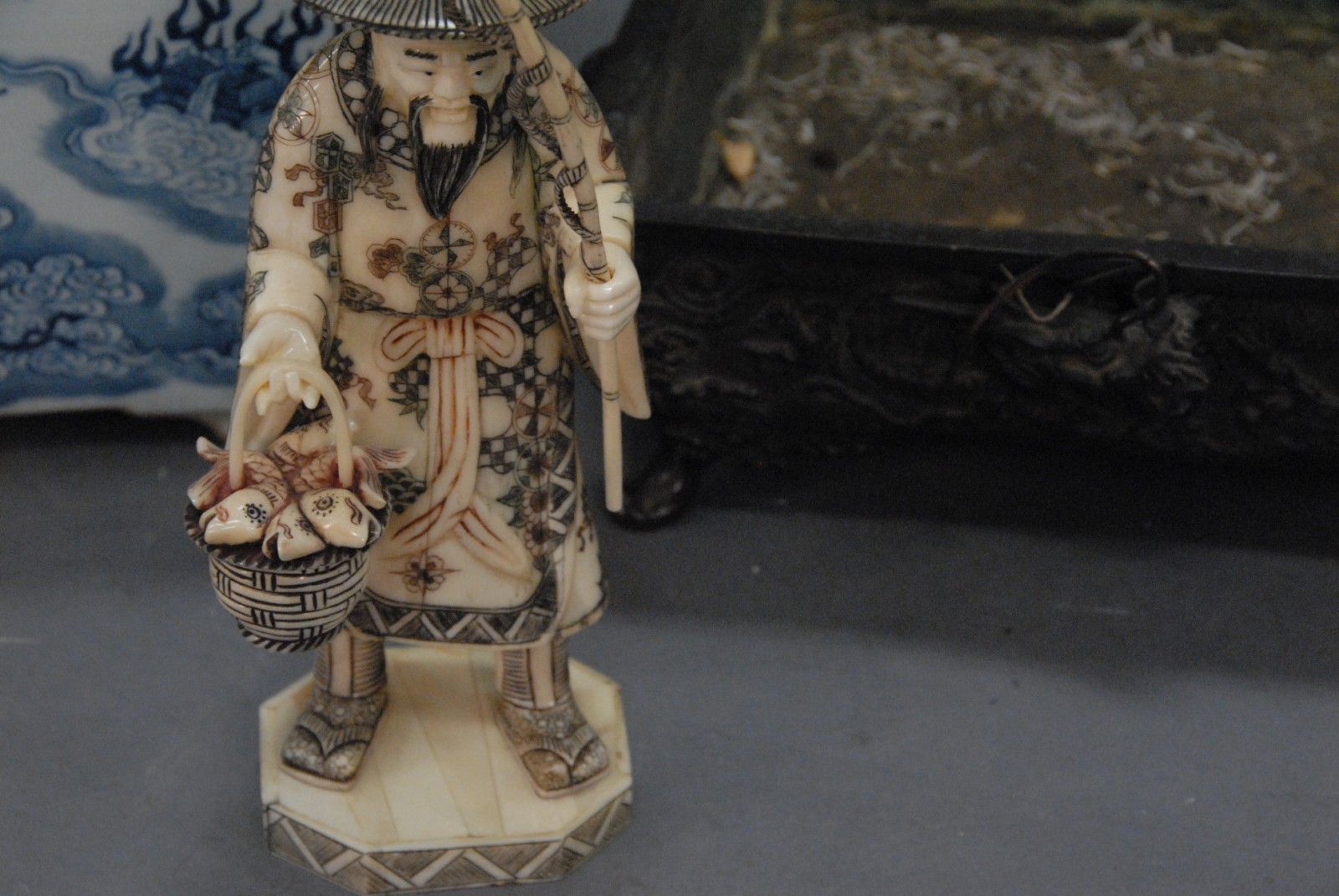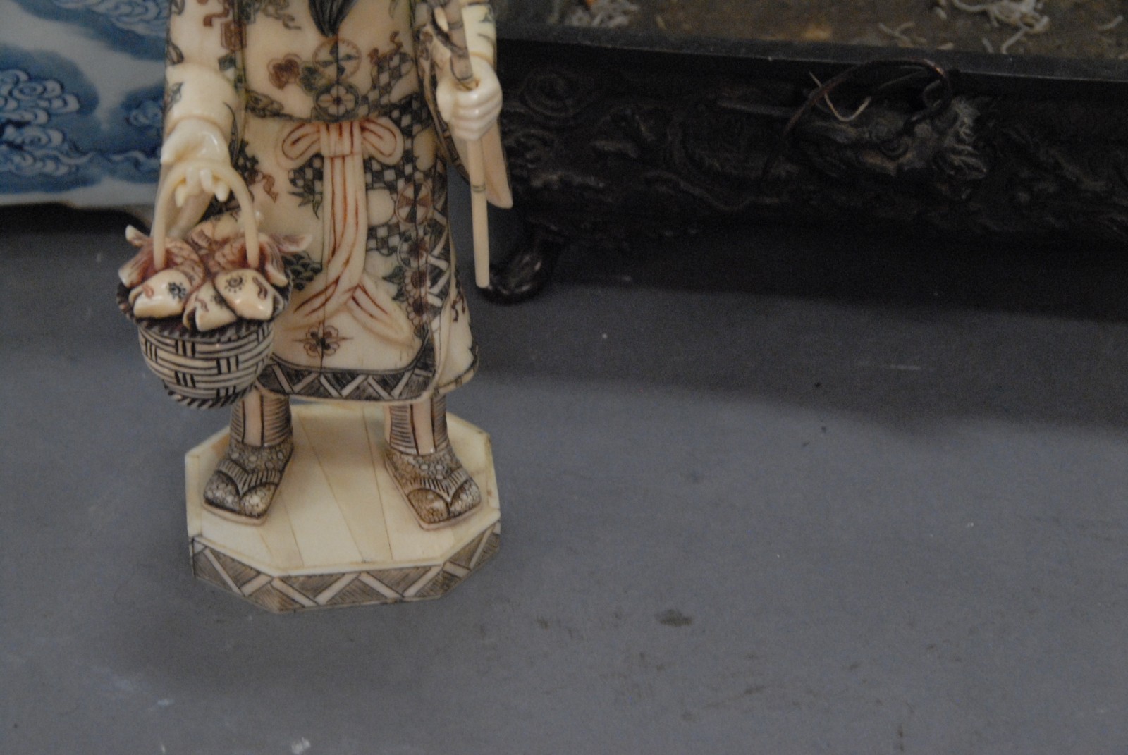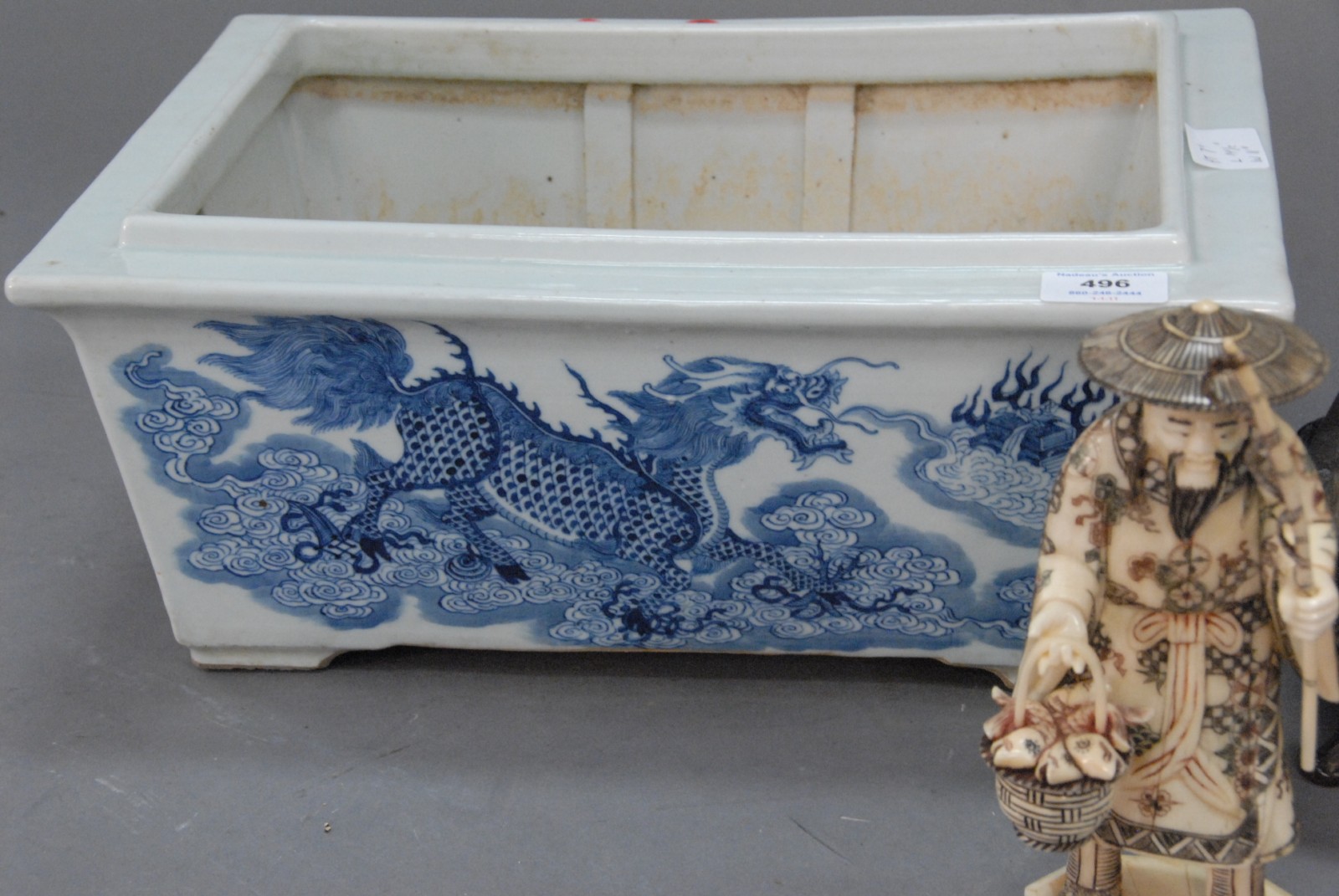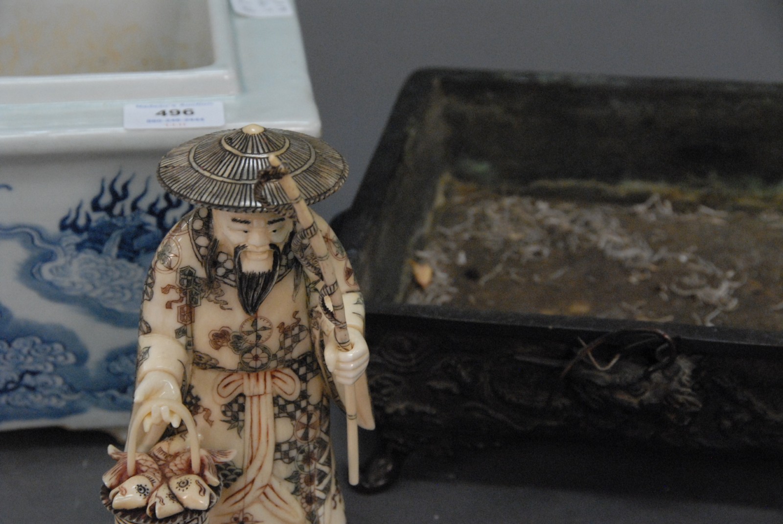 Three piece lot to include rectangular Oriental porcelain planter, bone figure and a bronze planter.
