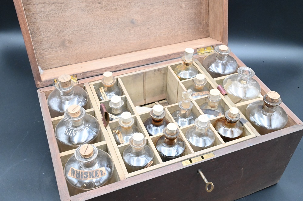Lot 497: Apothecary Box, having lift top opening to glass bottle and decanters, height 9 inches, top 15″ x 9 1/4″. Provenance: Estate of Florence Yannios, Cheshire, CT.