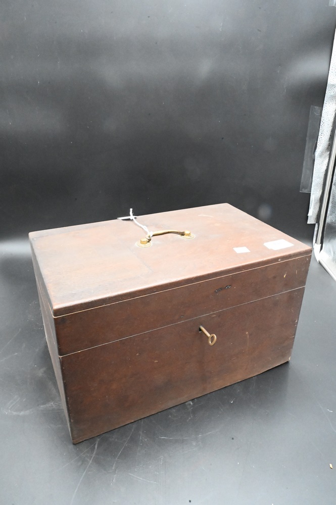 Apothecary Box, having lift top opening to glass bottle and decanters, height 9 inches, top 15″ x 9 1/4″. Provenance: Estate of Florence Yannios, Cheshire, CT.