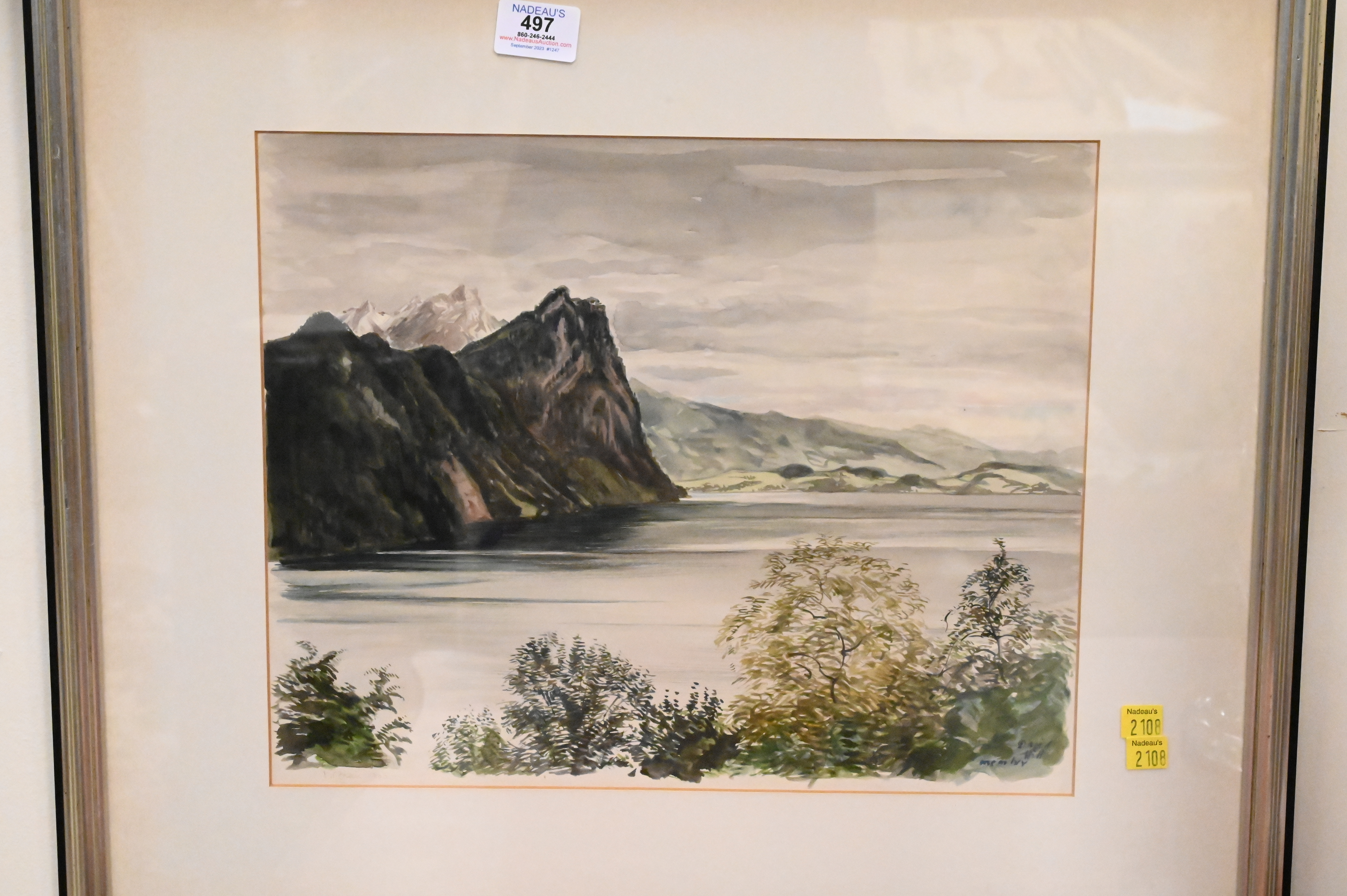 David Hill (American 1914-1977) mountainous landscape with lake watercolor on paper signed, dated “1965” in Roman numerals, inscribed indistinctly and dated “1965” again sight 12 1/2″x15 1/4″