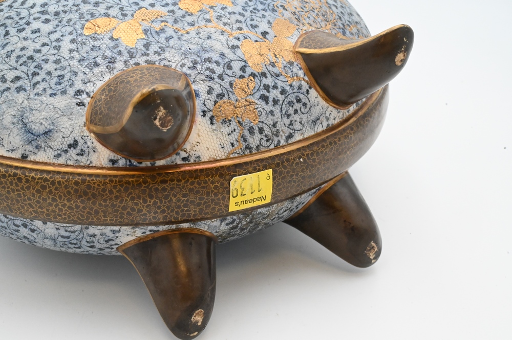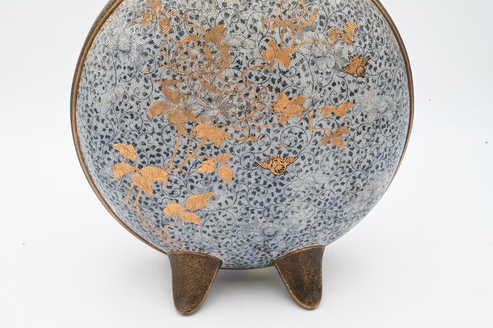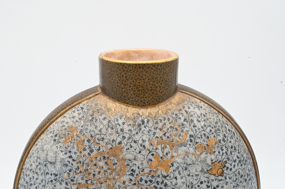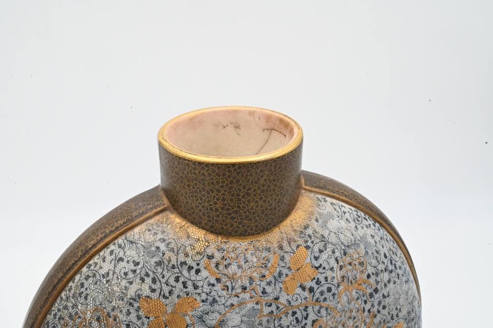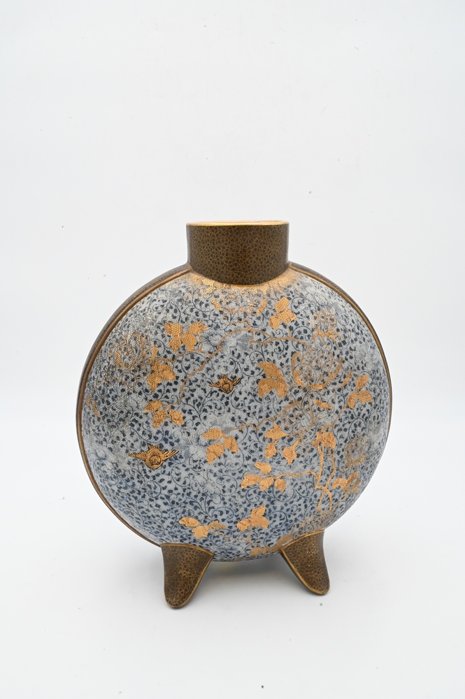 Lot 497: Japanese Satsuma Footed Pilgrim Bottle Vase, 19th century Meiji Period, intricate raised netting of gilt and vine decoration, height 12 inches.