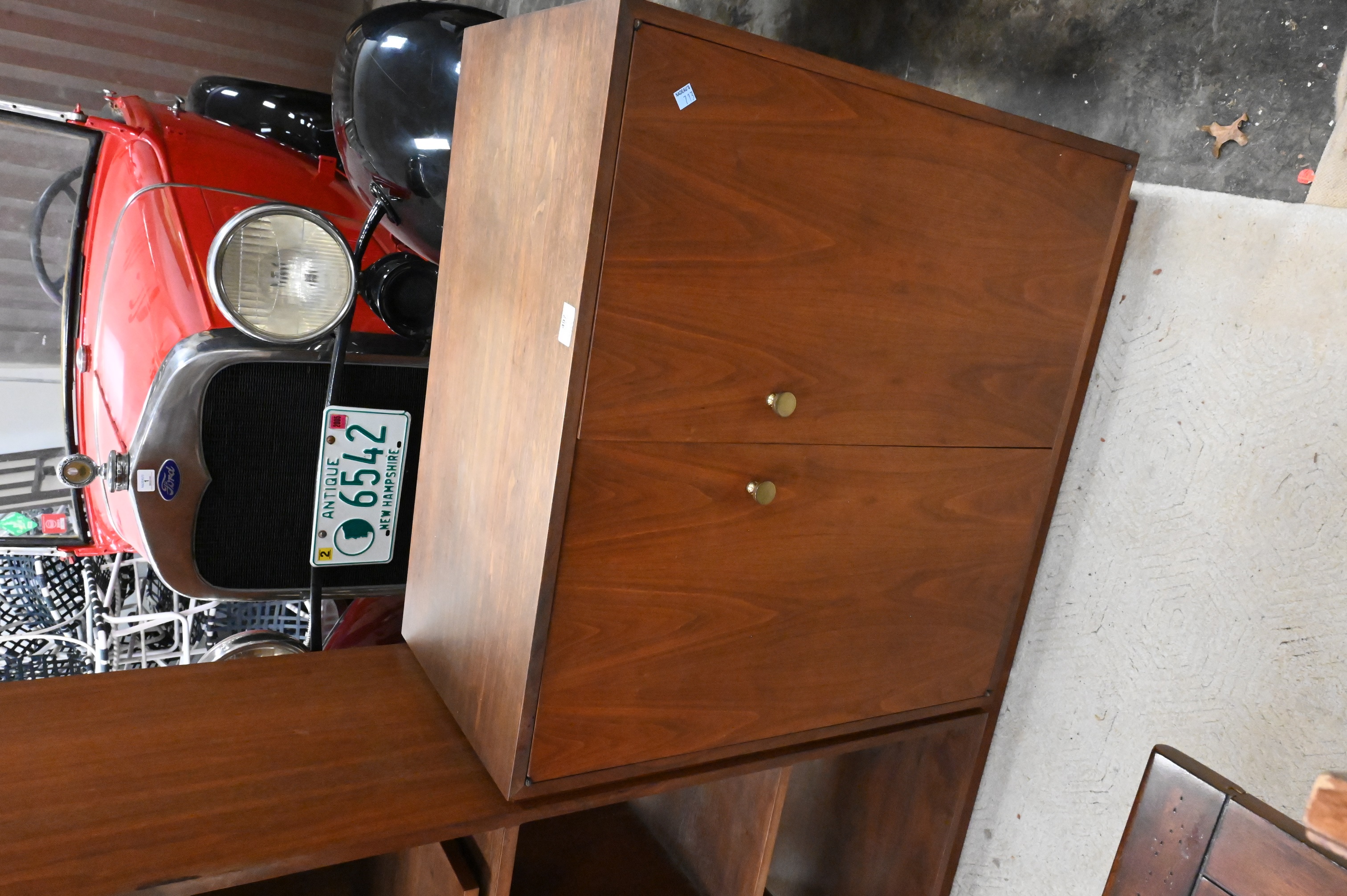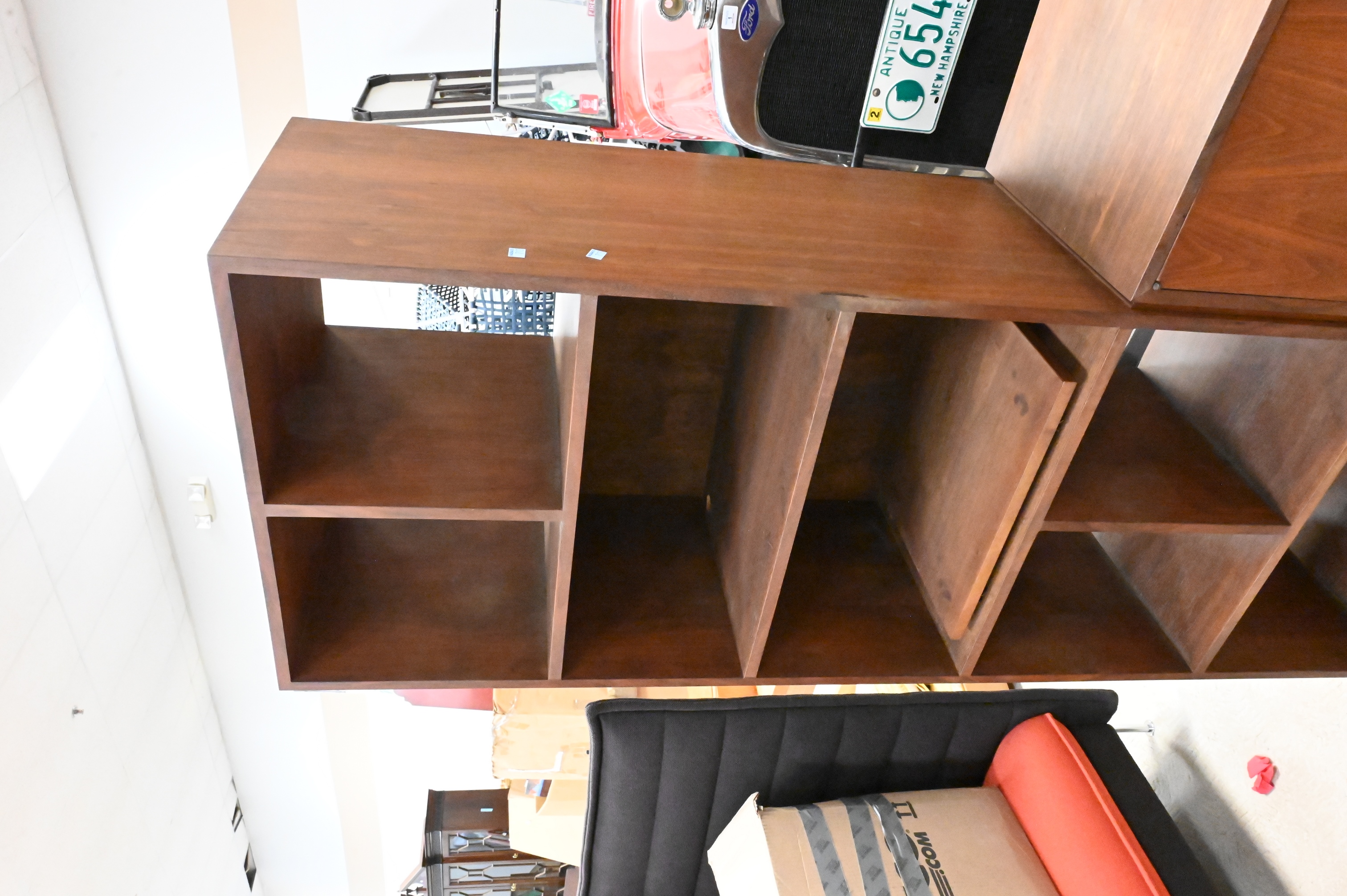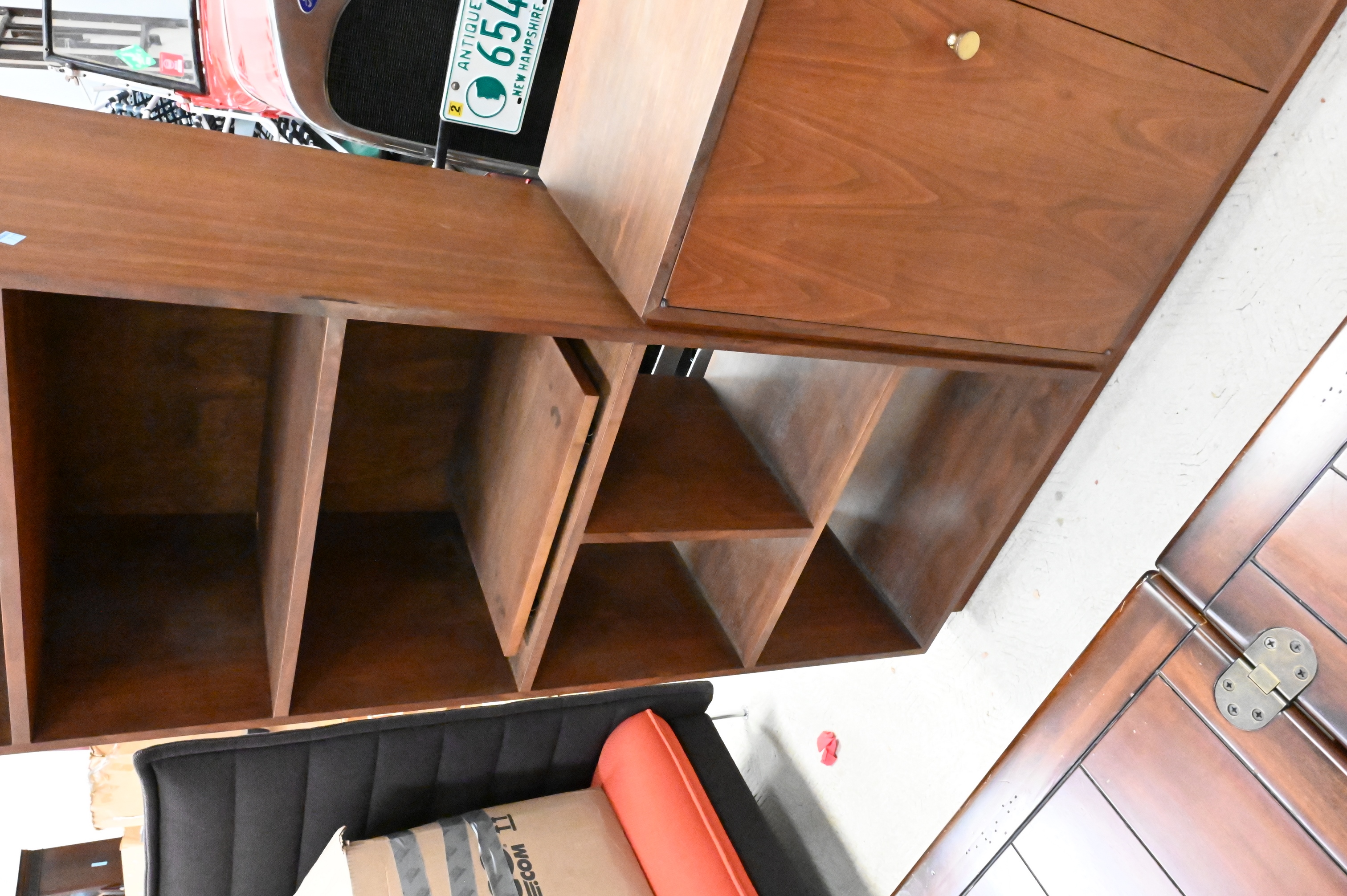 Lot 497: Mid-Century Modern Walnut Partitioned Bookshelves with Attached Cabinet