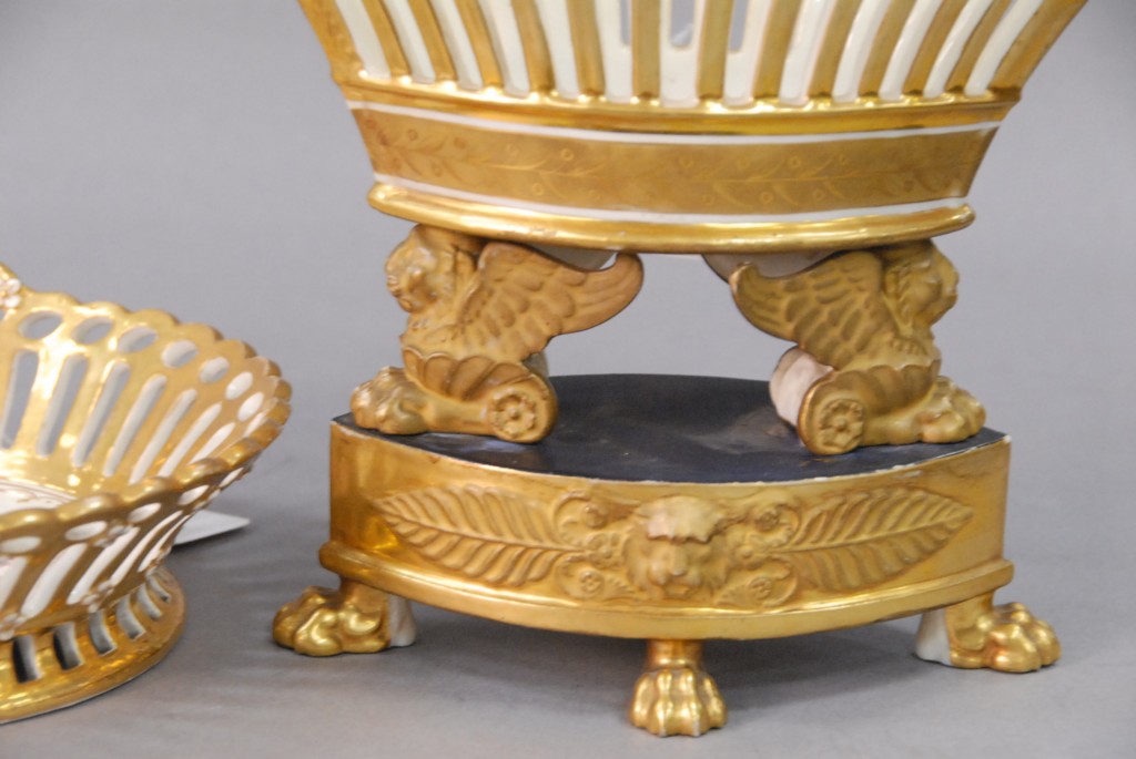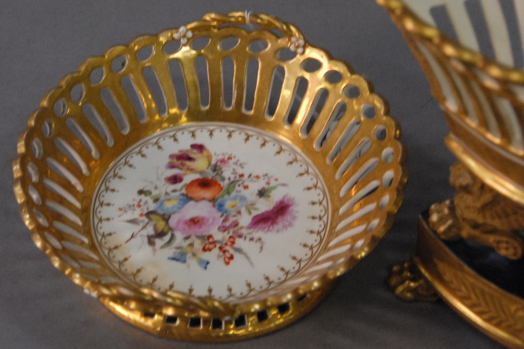 Two piece lot porcelain gilt decorated compote having winged griffins and paw feet and gilt decorated basket, 19th century. height 8in.