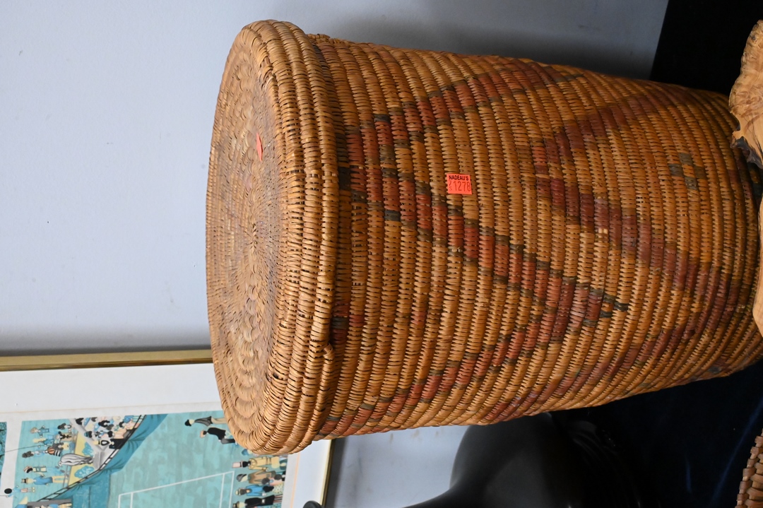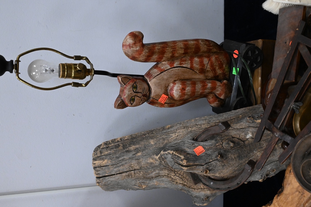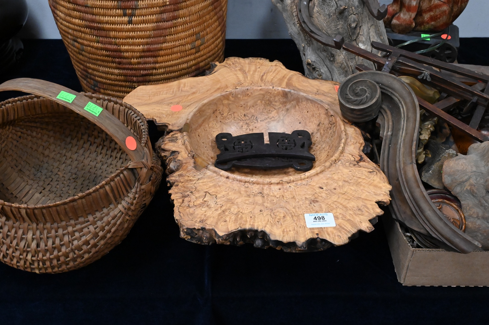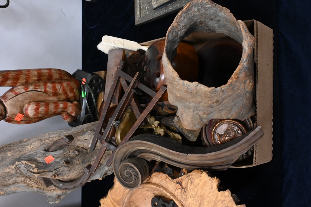 Assorted Group of Items, to include a burl bowl with rough edges, a melon basket, lamp, along with a carved wood bust of a Victorian woman, etc. Provenance: Estate of Peter Tillou, Litchfield, Connecticut.