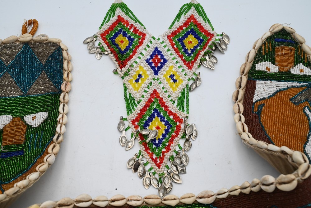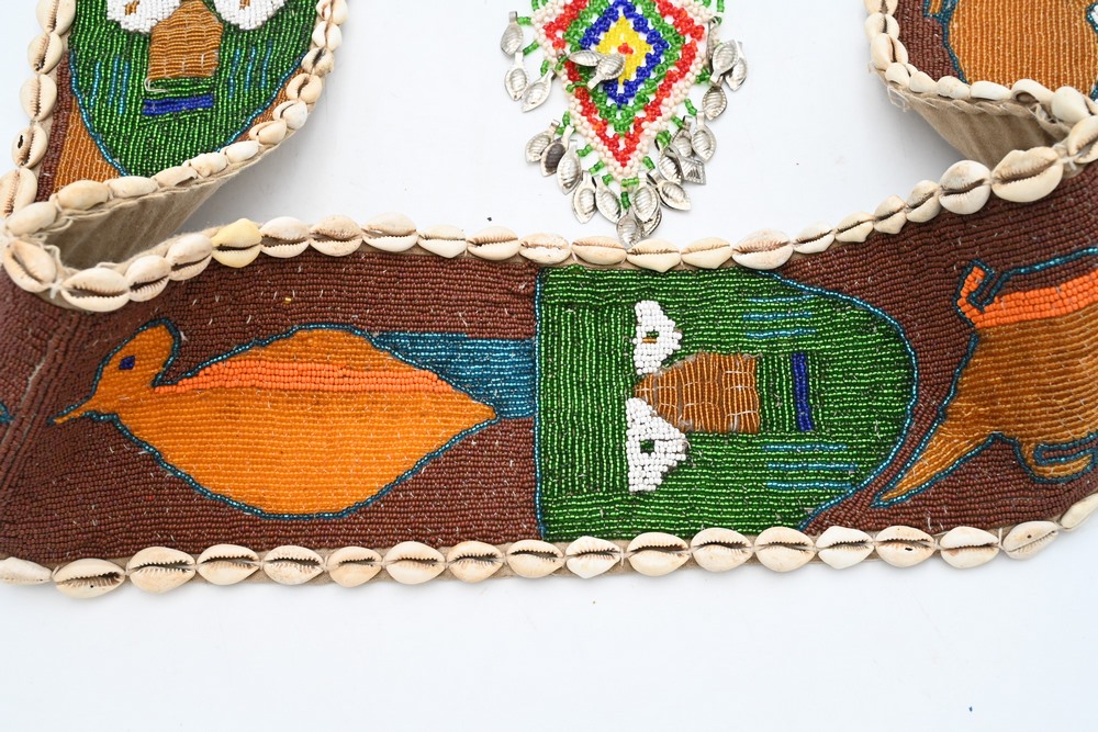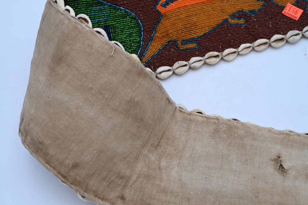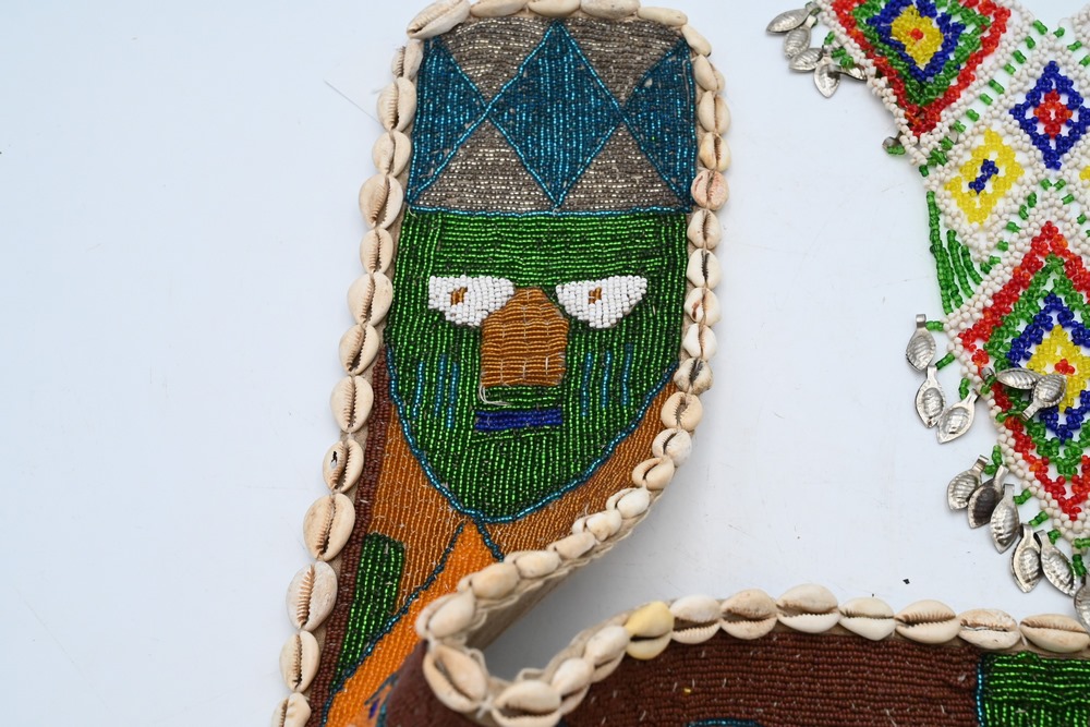 Lot 498: Bead and Shell Decorated Wall Hanging having faces, birds, and animals length 44 inches