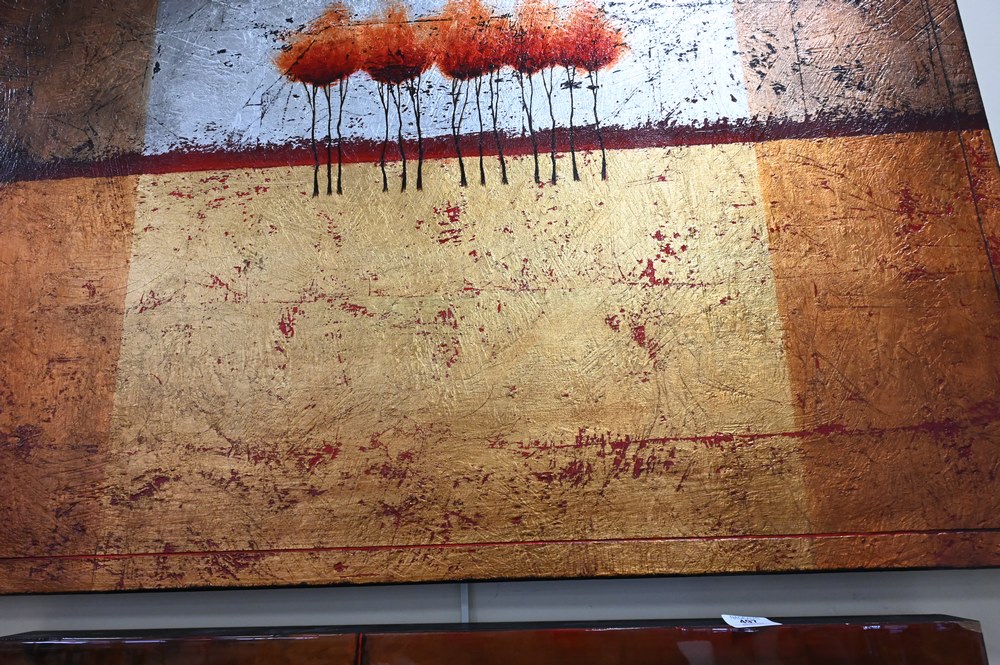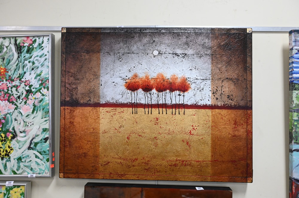 Lot 498: Dorothy Cochran, oil on canvas, trees, titled on verso “Silver Sky” from Full Moon Series #8, dated 10/09, signed on verso Cochran, …