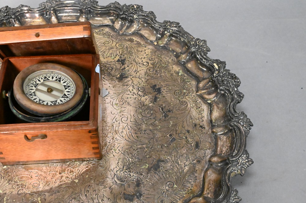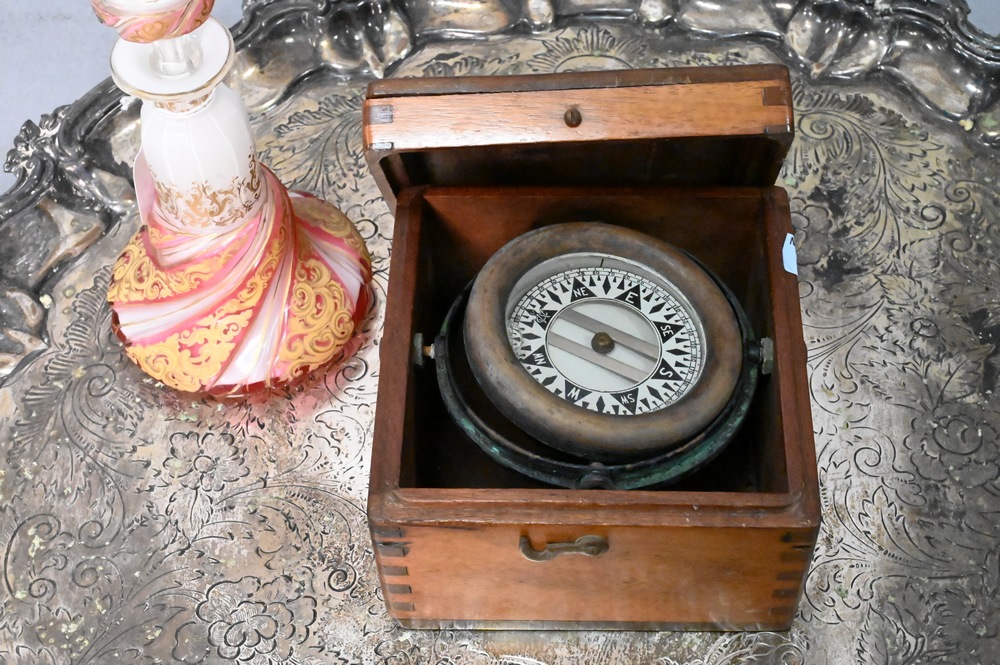 Lot 498: Five Piece Lot, to include ships compass; two sterling silver footed small trays; cut overlay bottle, height 9 inches; along with a large round silver tray, diameter 22 inches. Provenance: Estate of Florence Yannios, Cheshire, CT.