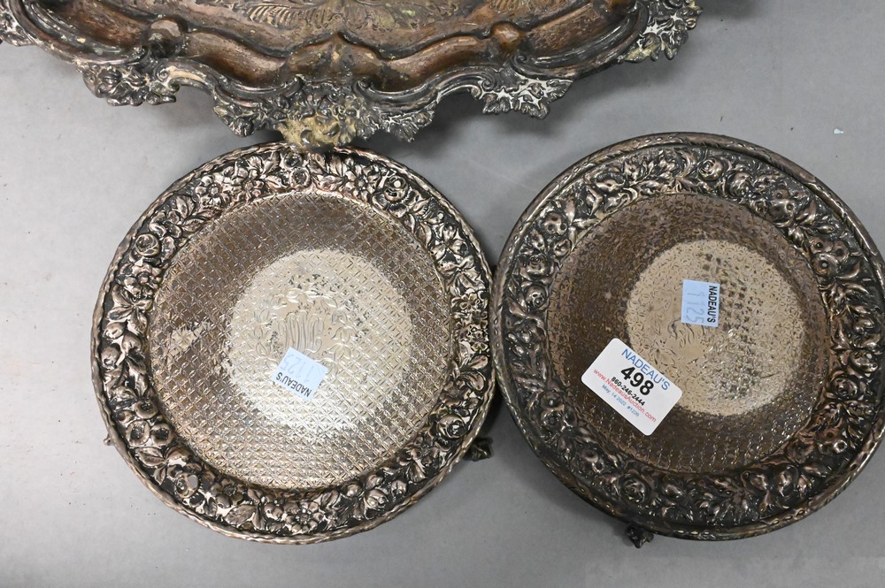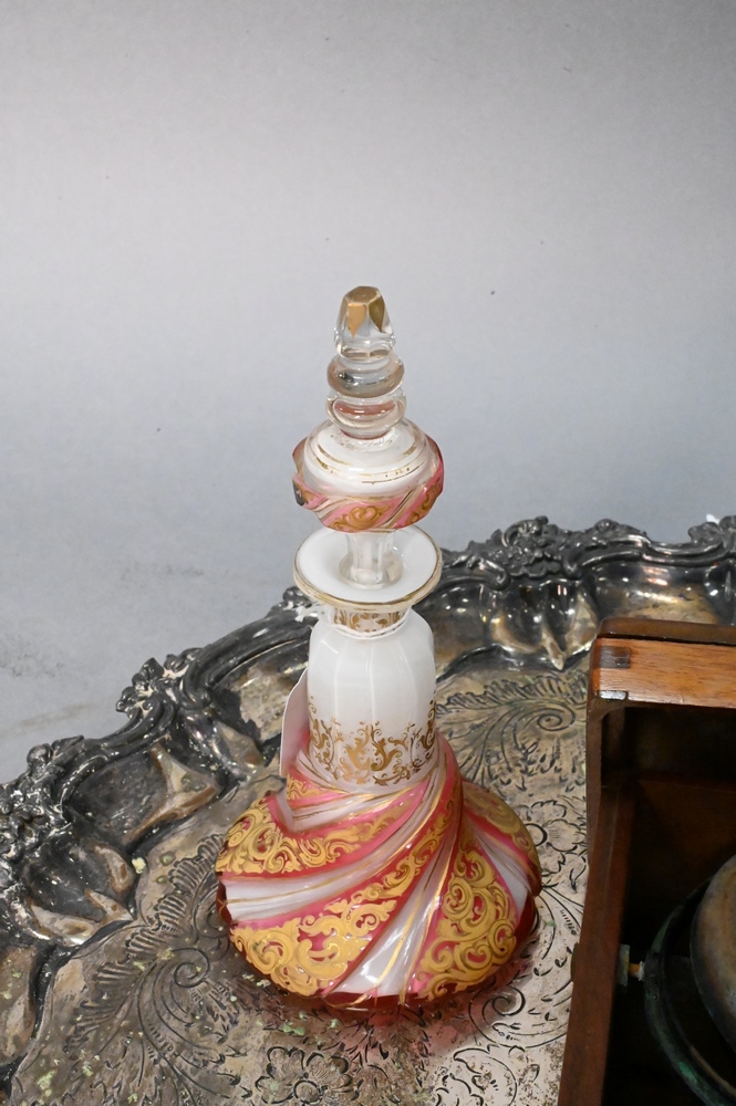 Five Piece Lot, to include ships compass; two sterling silver footed small trays; cut overlay bottle, height 9 inches; along with a large round silver tray, diameter 22 inches. Provenance: Estate of Florence Yannios, Cheshire, CT.