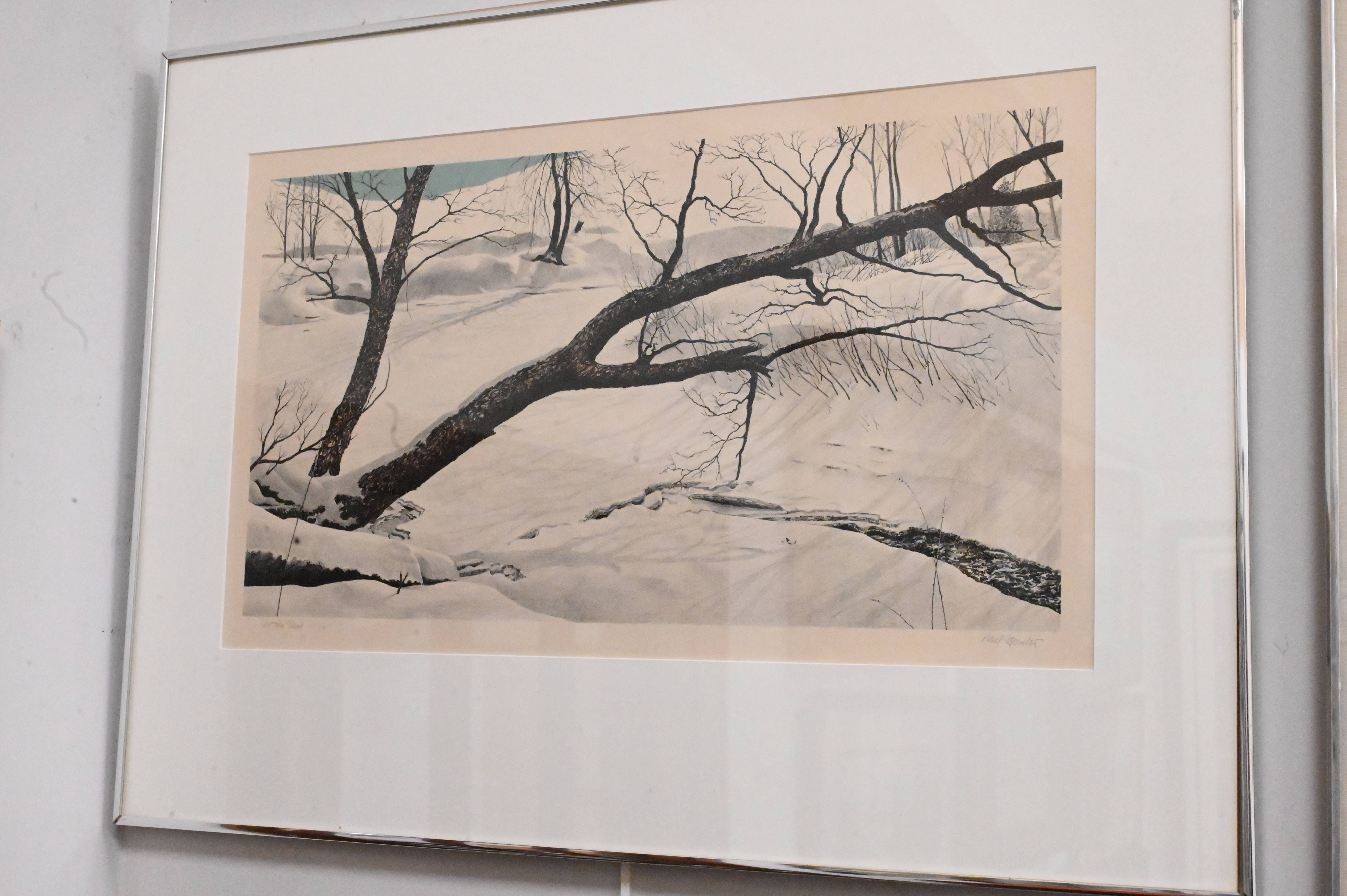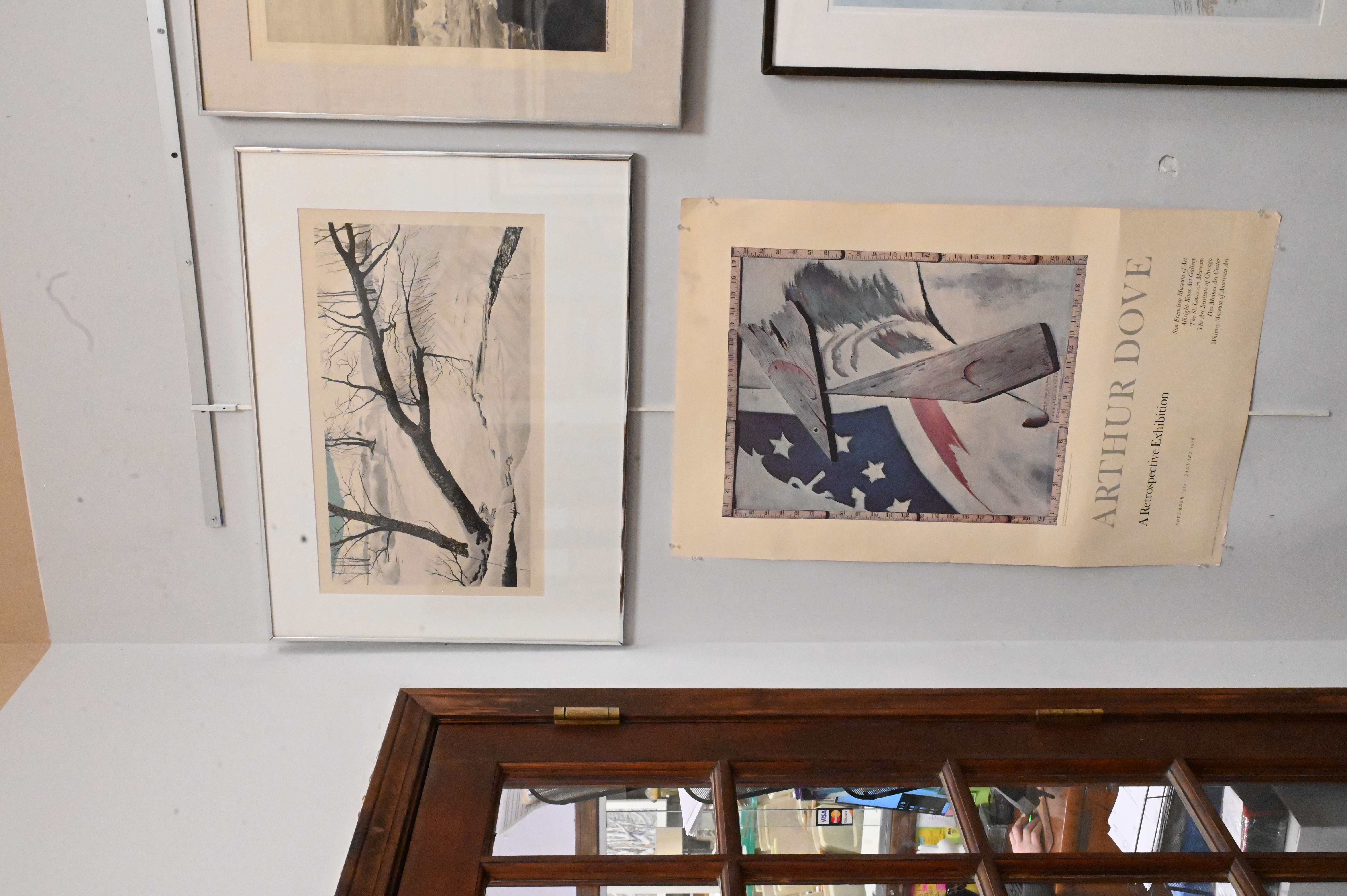 Four Piece Art Group, to include Vicente Denigris (Argentinian, 1938 – 1984), etching, ‘Snow Dream’, frame size 35″ x 27 1/2″, image size 34″ x 26″; Mel Hunter (American, 1927 – 2004), lithograph on paper, ‘At the Bend’, paper size 15″ x 25 1/2″; Henry Gottlieb, print, ‘Sympathy of the Sea’, image size 20 1/2″ x 26 1/2″, copyright Henry Gottlieb, publisher, New York; along with Arthur Dove (1880 – 1946), poster, ‘A Retrospective Exhibition, 1975’, damaged, torn, dirty, 37 1/2″ x 23 1/2″.