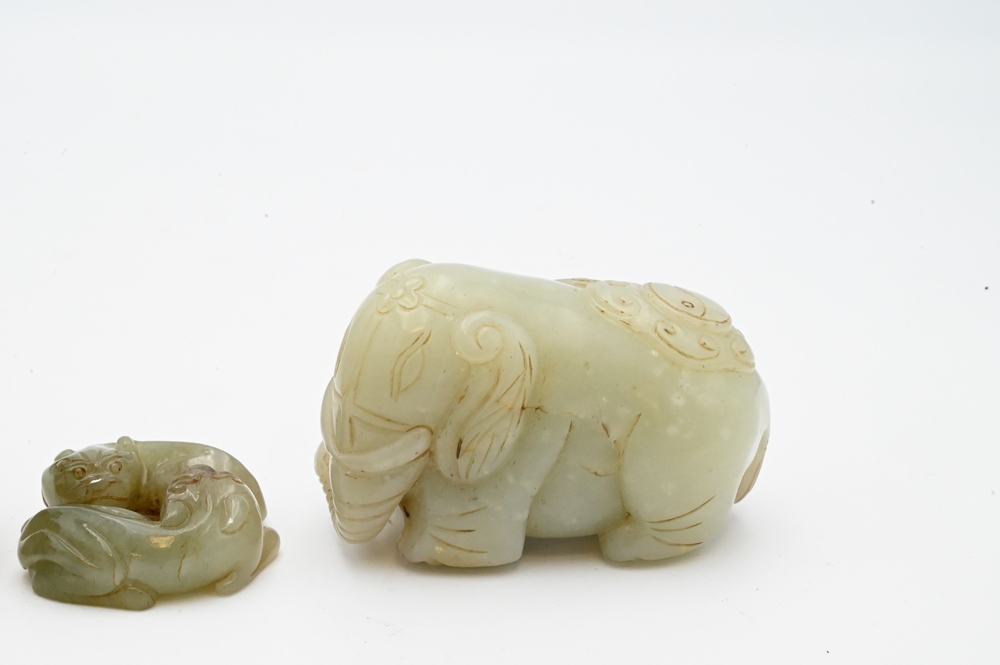 Lot 498: Four Piece Group, to include two carved jade figures, elephant with boy carved from russet celadon jade, a double foo dog figure, along with two soapstone seals, tallest 3 inches.