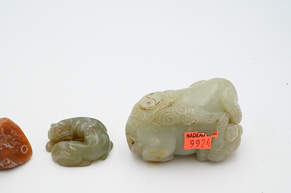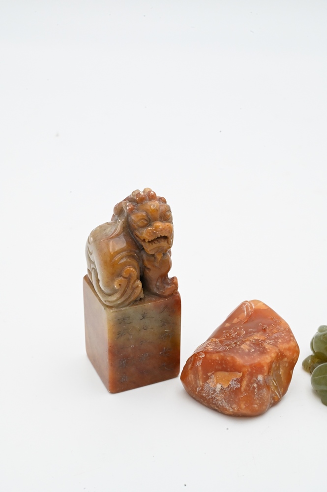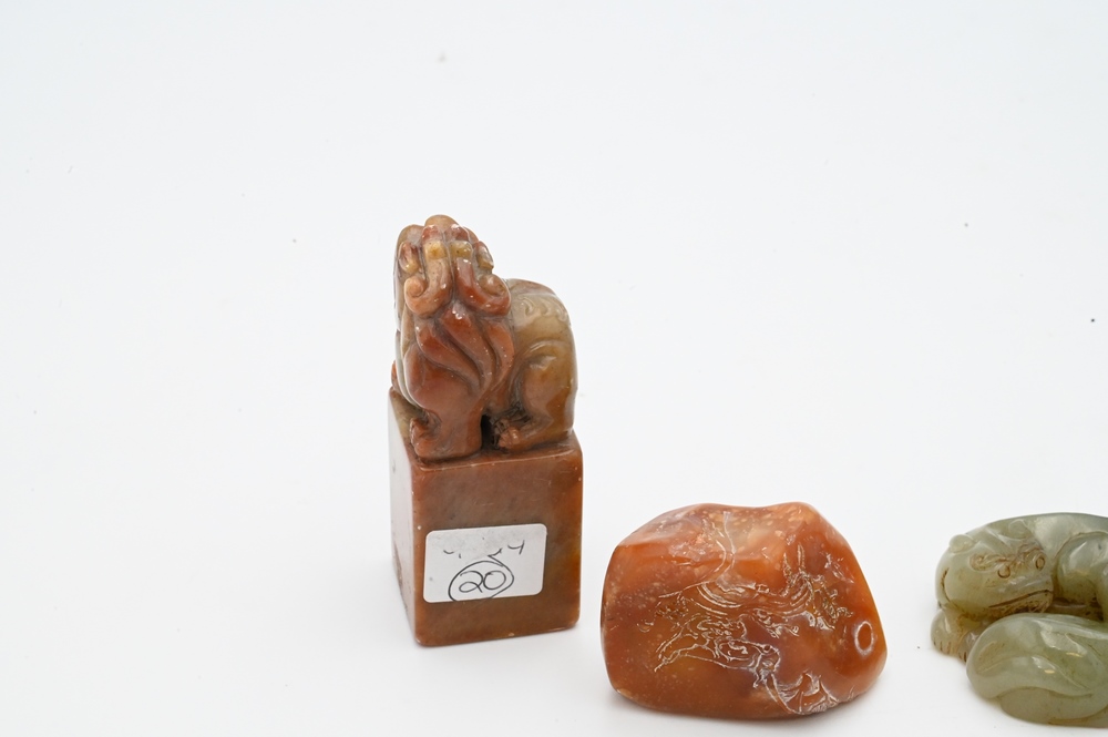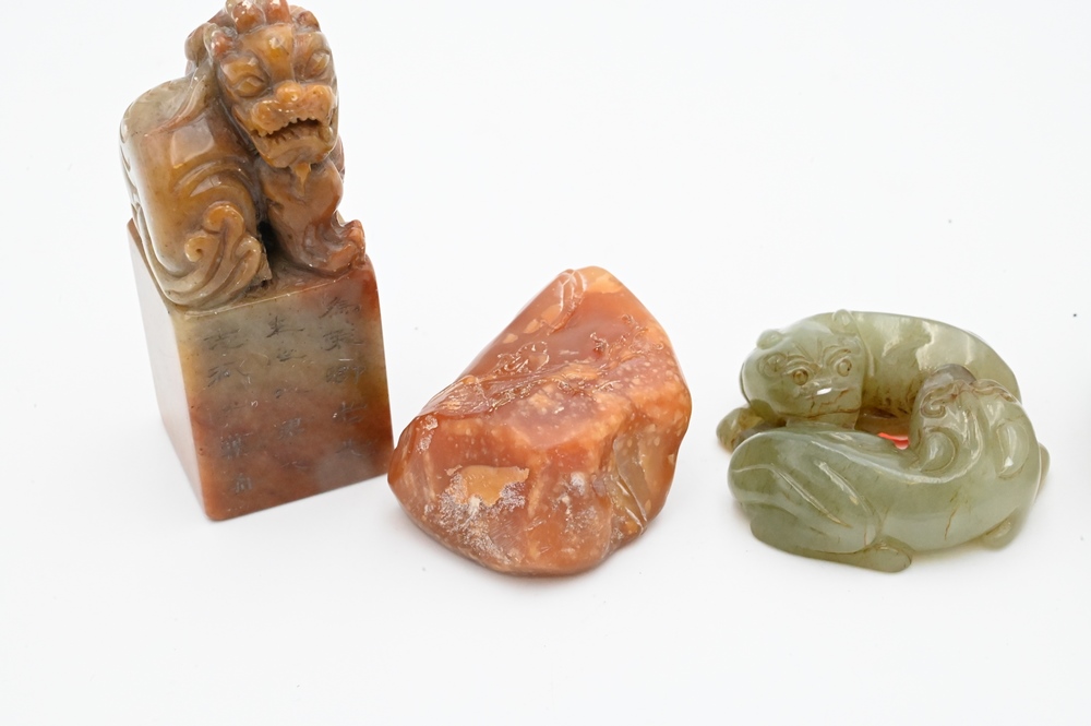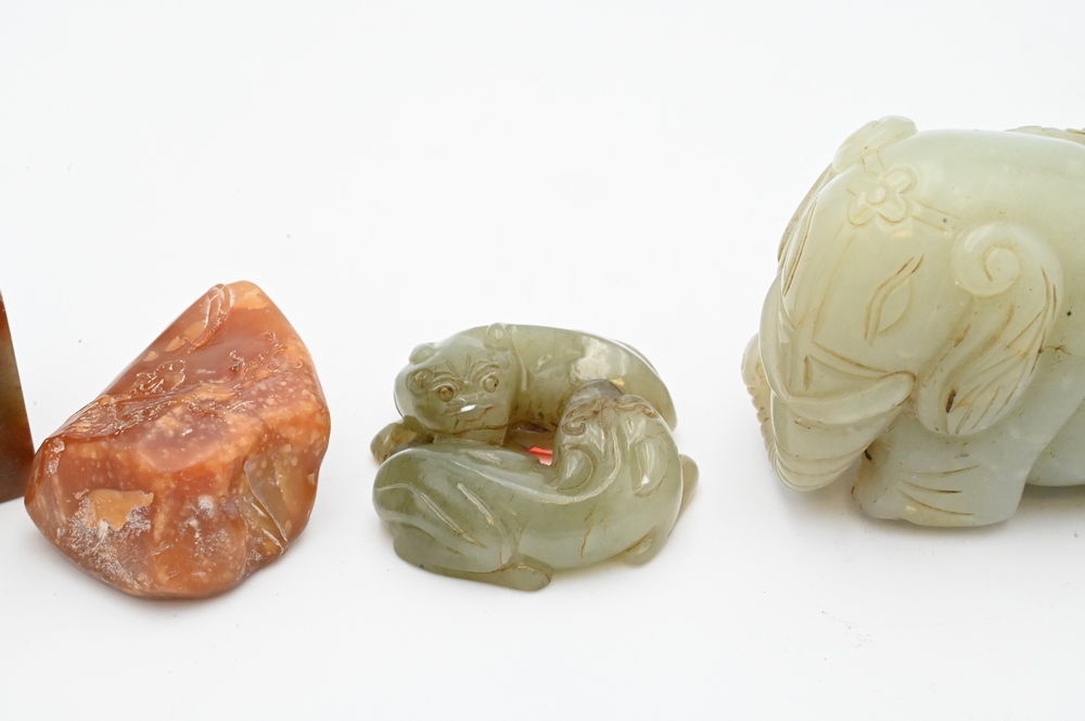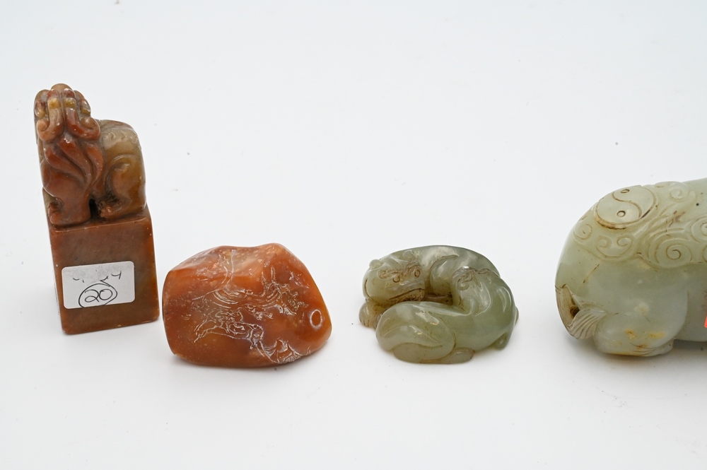Four Piece Group, to include two carved jade figures, elephant with boy carved from russet celadon jade, a double foo dog figure, along with two soapstone seals, tallest 3 inches.