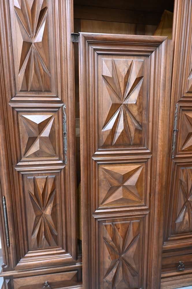 Large Three Drawer Cabinet, having carved doors over three drawers, as is, middle door missing support, currently not attached, height 98 inches, width 74 inches.