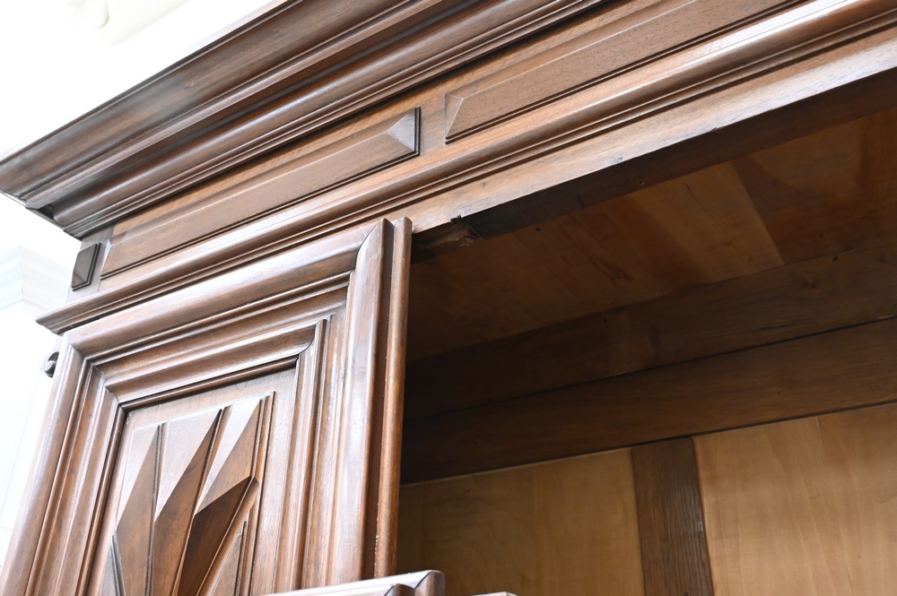 Lot 498: Large Three Drawer Cabinet, having carved doors over three drawers, as is, middle door missing support, currently not attached, height 98 inches, width 74 inches.