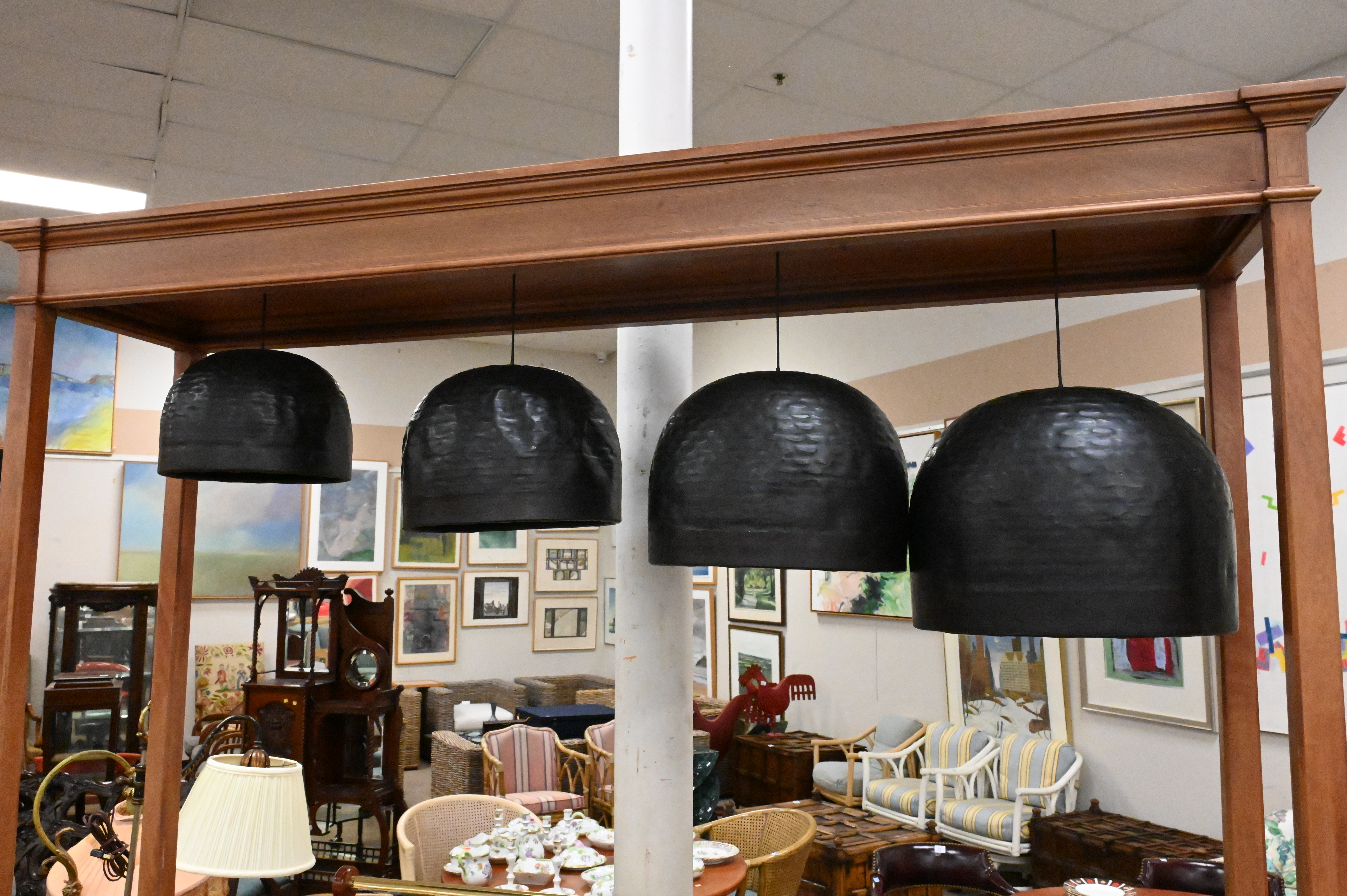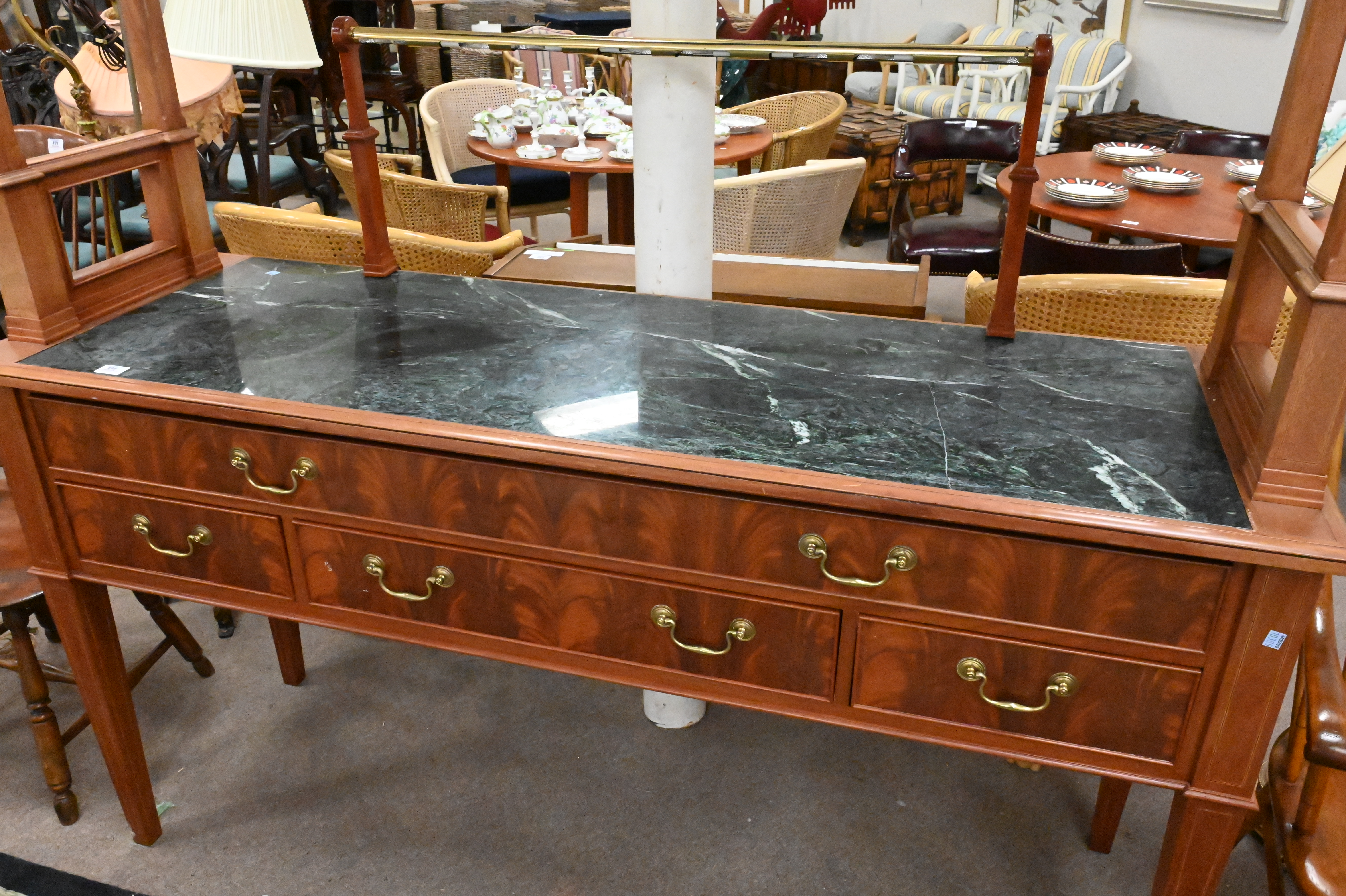 upper section with four bronze gongs and lighted rail over granite top and four drawers