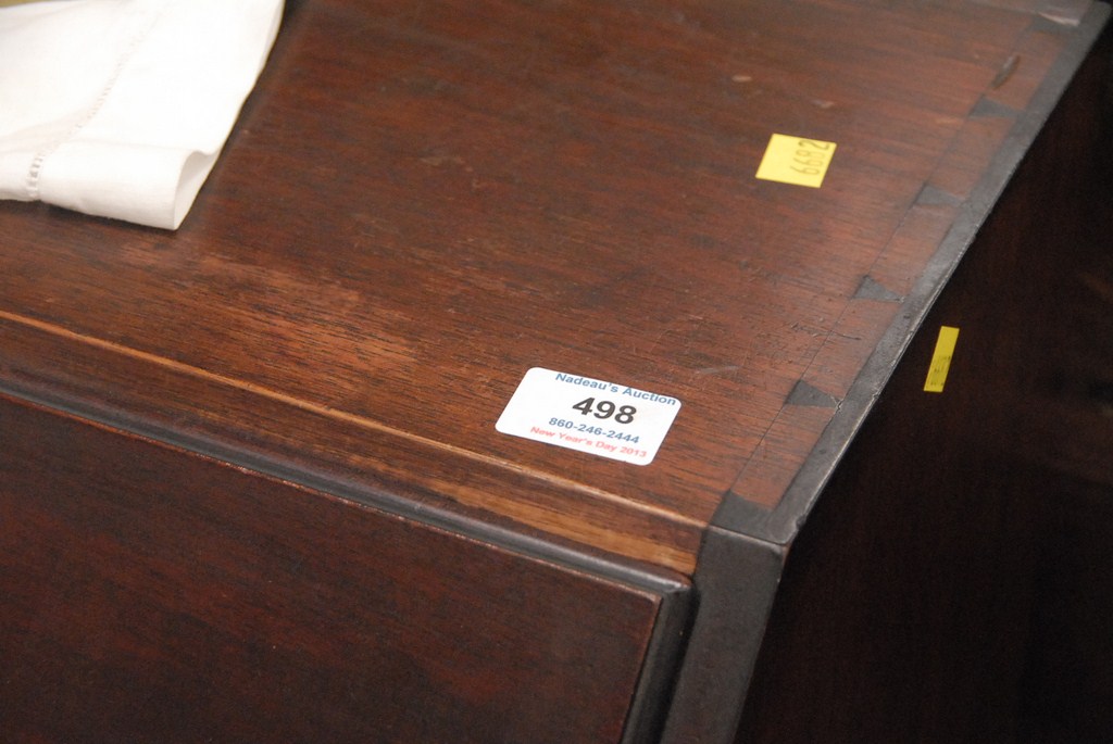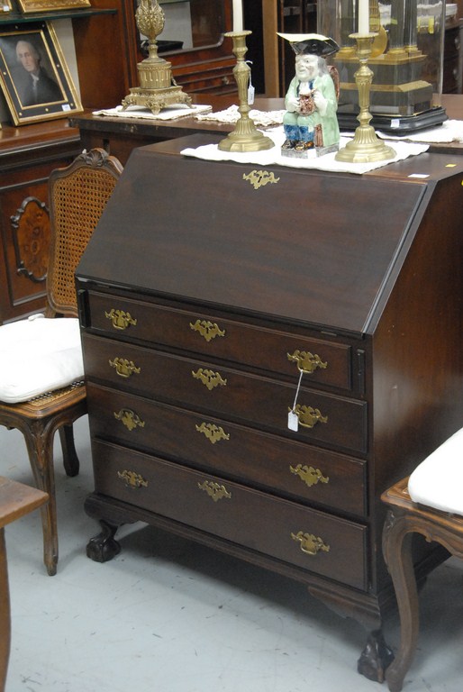 Lot 498: Margolis mahogany desk with slant lid over four graduated drawers all set on carved ball and claw feet, interior drawer signed Natha…