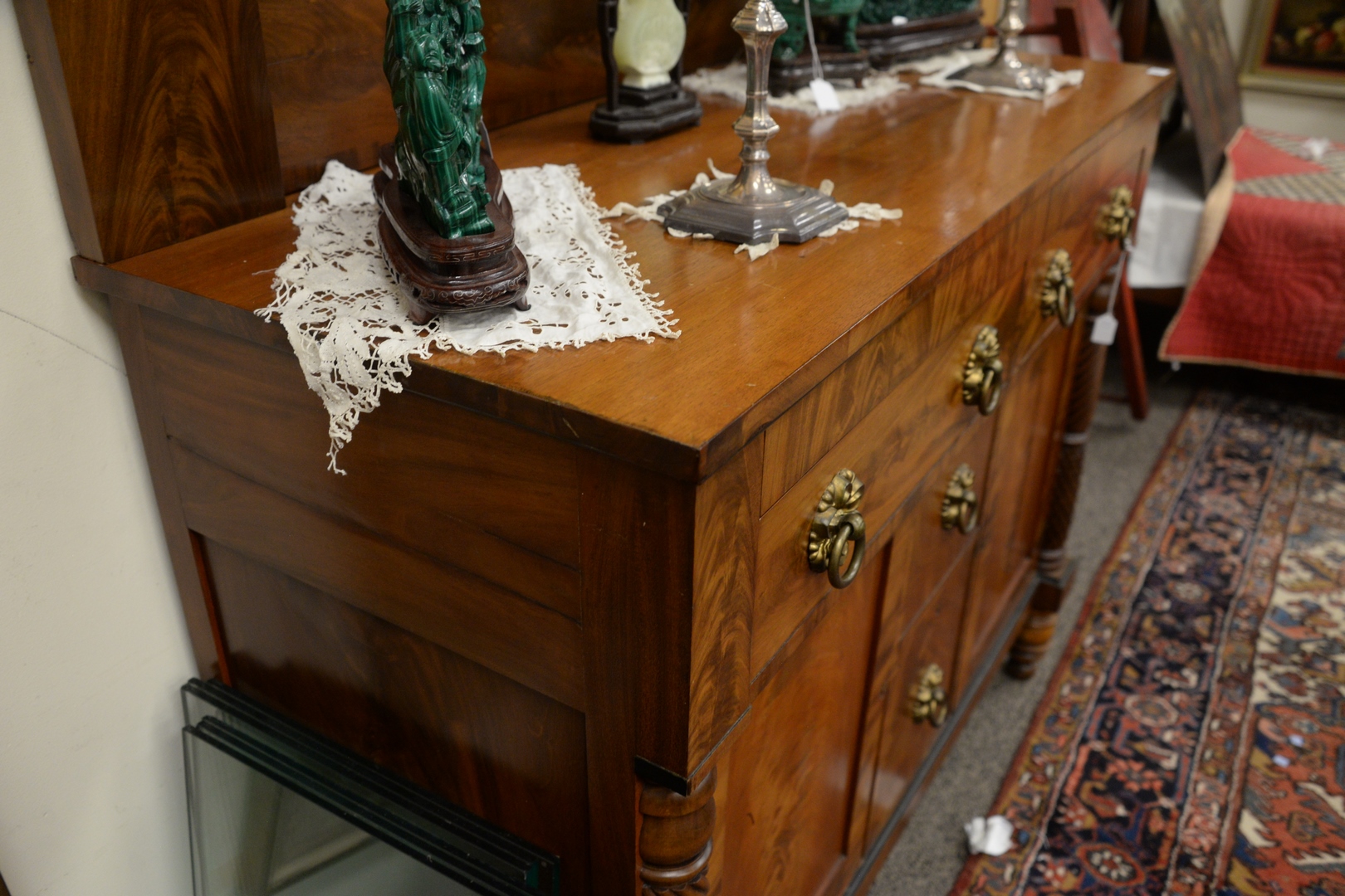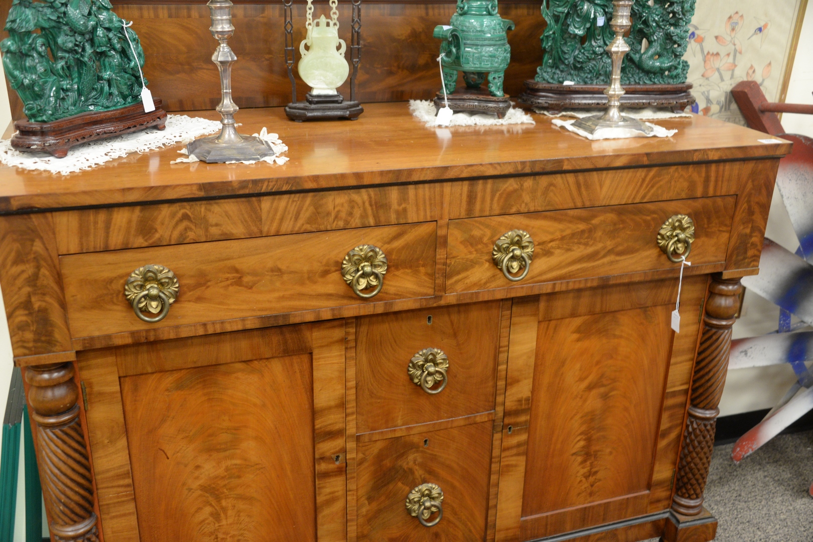 Lot 498: Sheraton Mahogany Sideboard, with backsplash over two drawers over doors flanking drawers all with embossed with original brass hardware, c.1820, total height 66 1/2 inches, top 22 1/2 x 55 1/2.