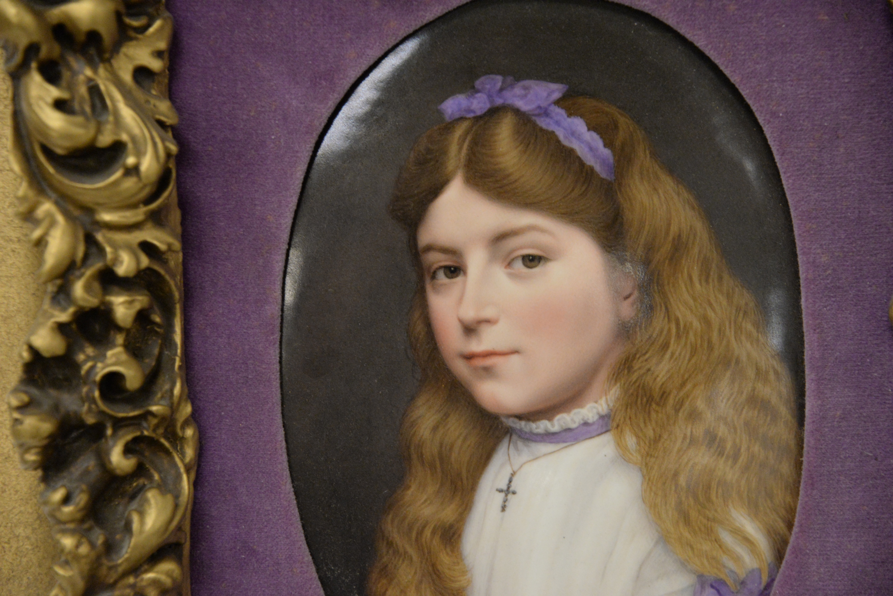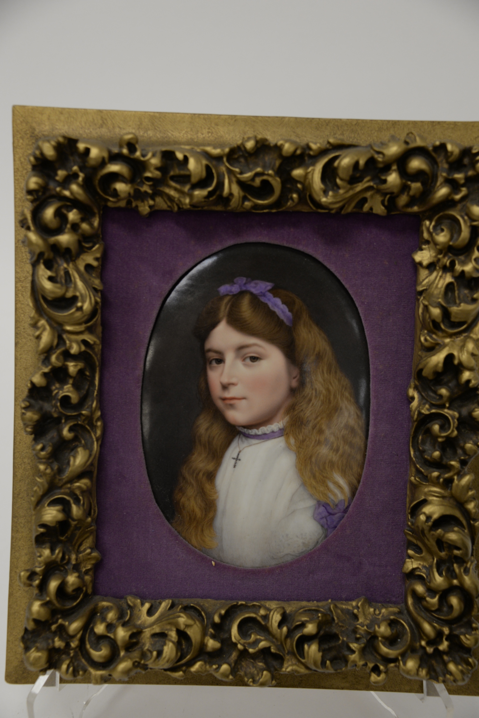 Three Framed Porcelain Portrait Plaques, to include a small plaque “Louise” in shadow box frame, 3 1/2″ x 2 1/2″; a reproduction K.P.M. plaque, 7″ x 5″; along with a painted portrait plaque, 8 1/2″ x 6″.