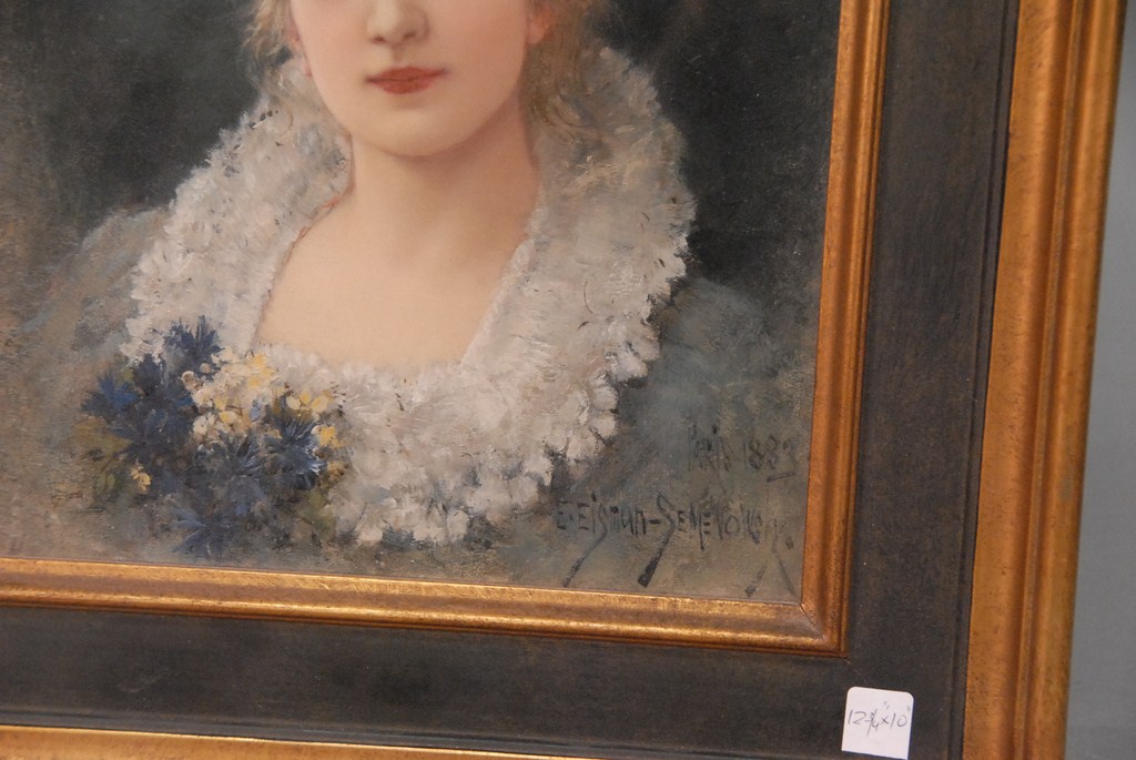 Emile Eisman Semenowsky 1857-1911 PAIRS – GIRL WITH FLOWERS oil on panel signed lower left E. Eisman Semenowsky Paris 1883 10 x 12