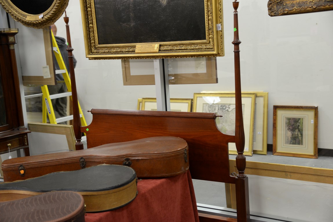 Lot 499: Fineberg four post bed having fluted tall post with finial tops, double size, made by Fineberg, Hartford, Connecticut one finial ch…