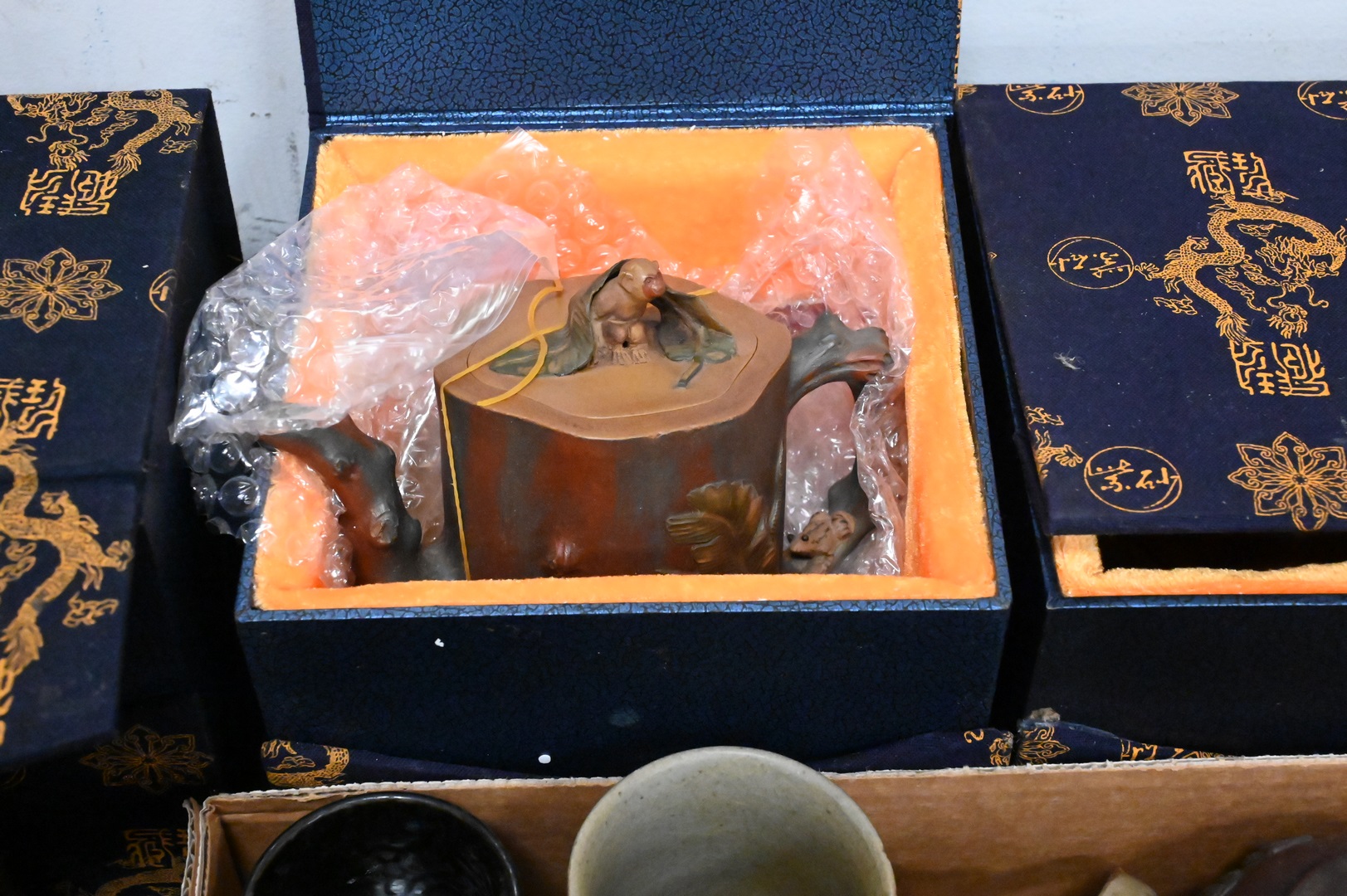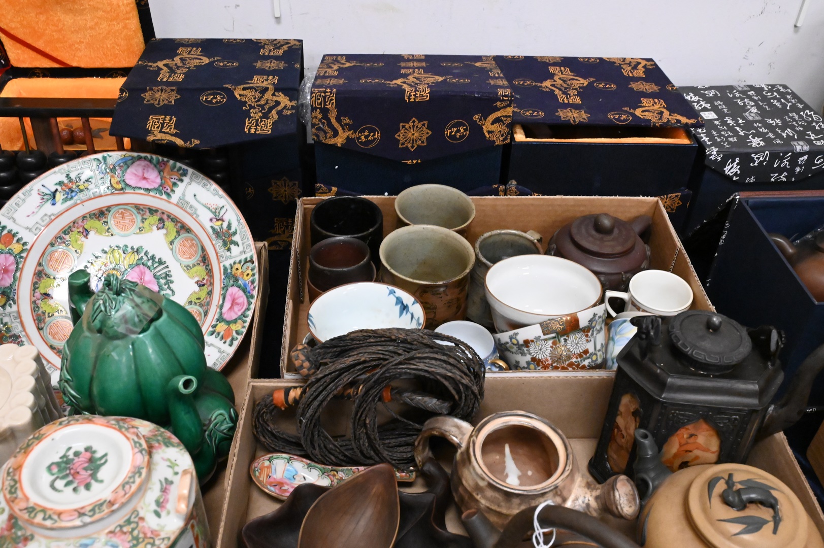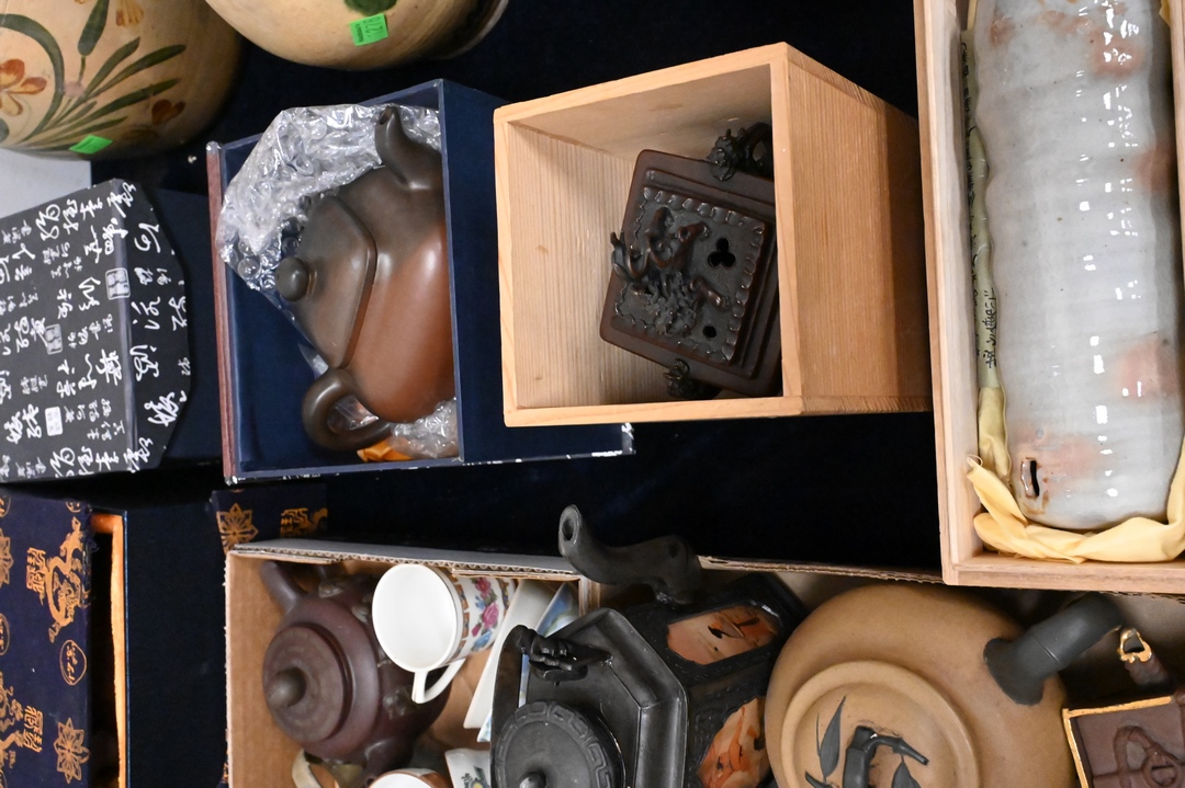 Group of Chinese Porcelain and Pottery, to include pottery teapots, blue and white porcelain cups and saucers, bronze, etc. Provenance: Estate of Peter Tillou, Litchfield, Connecticut.