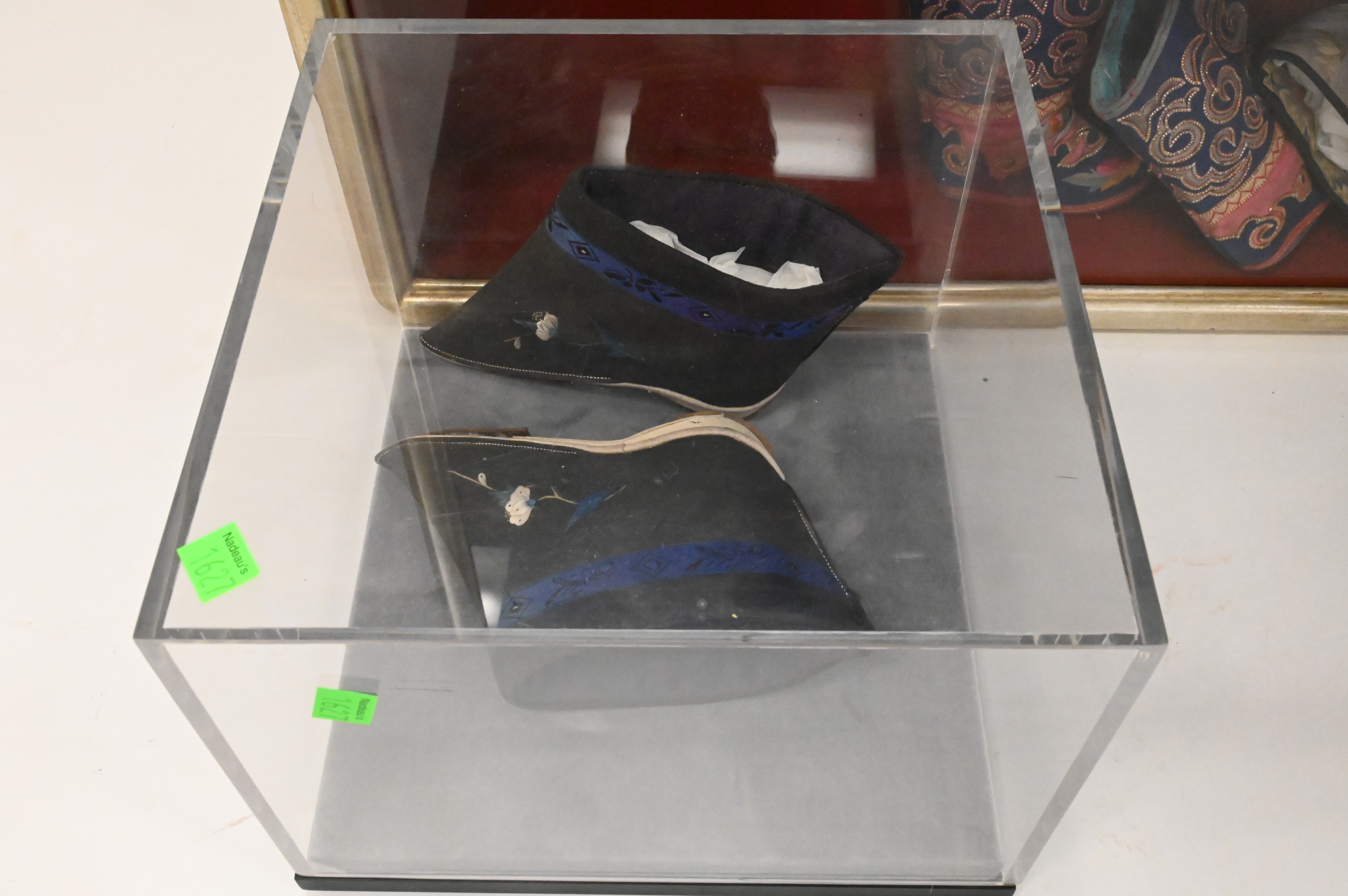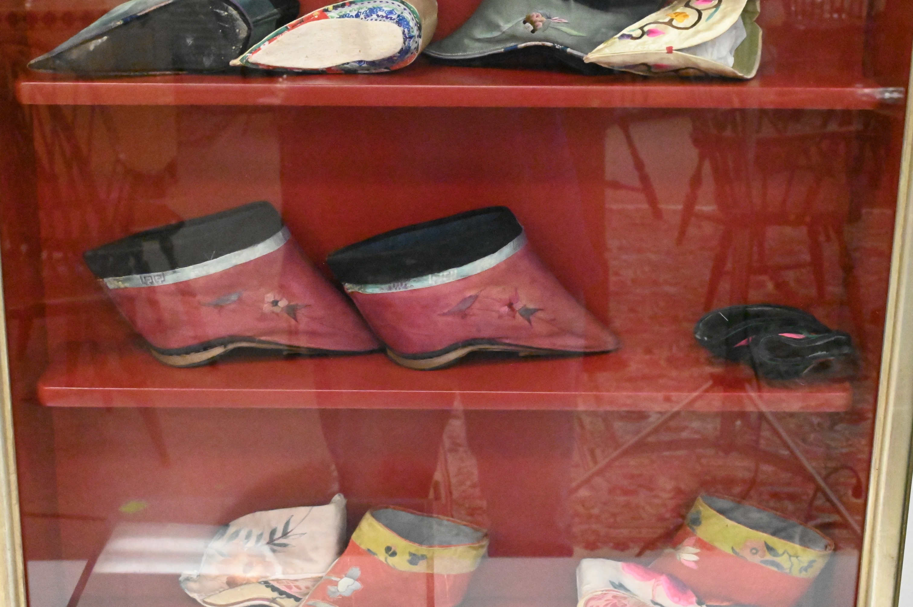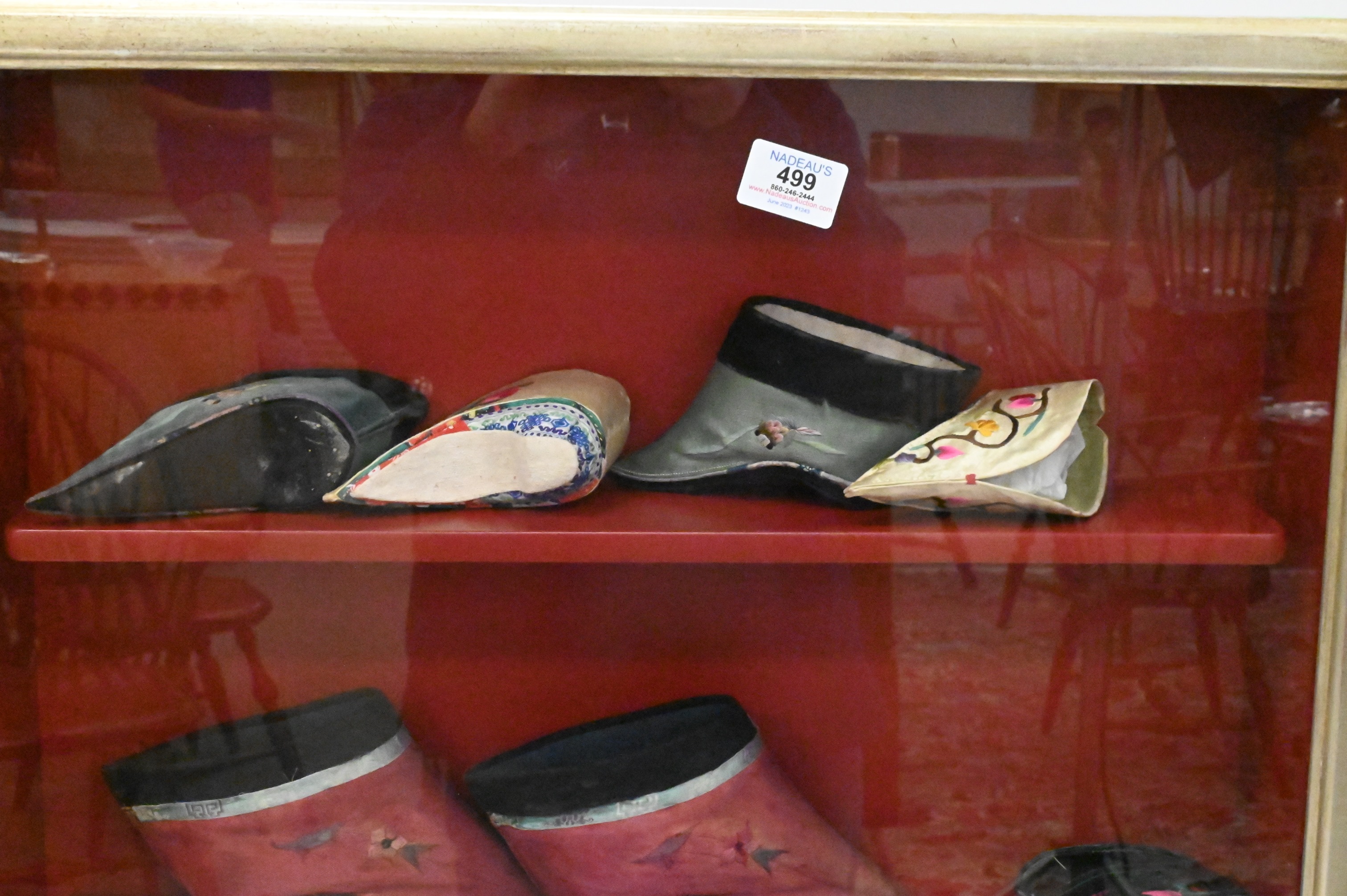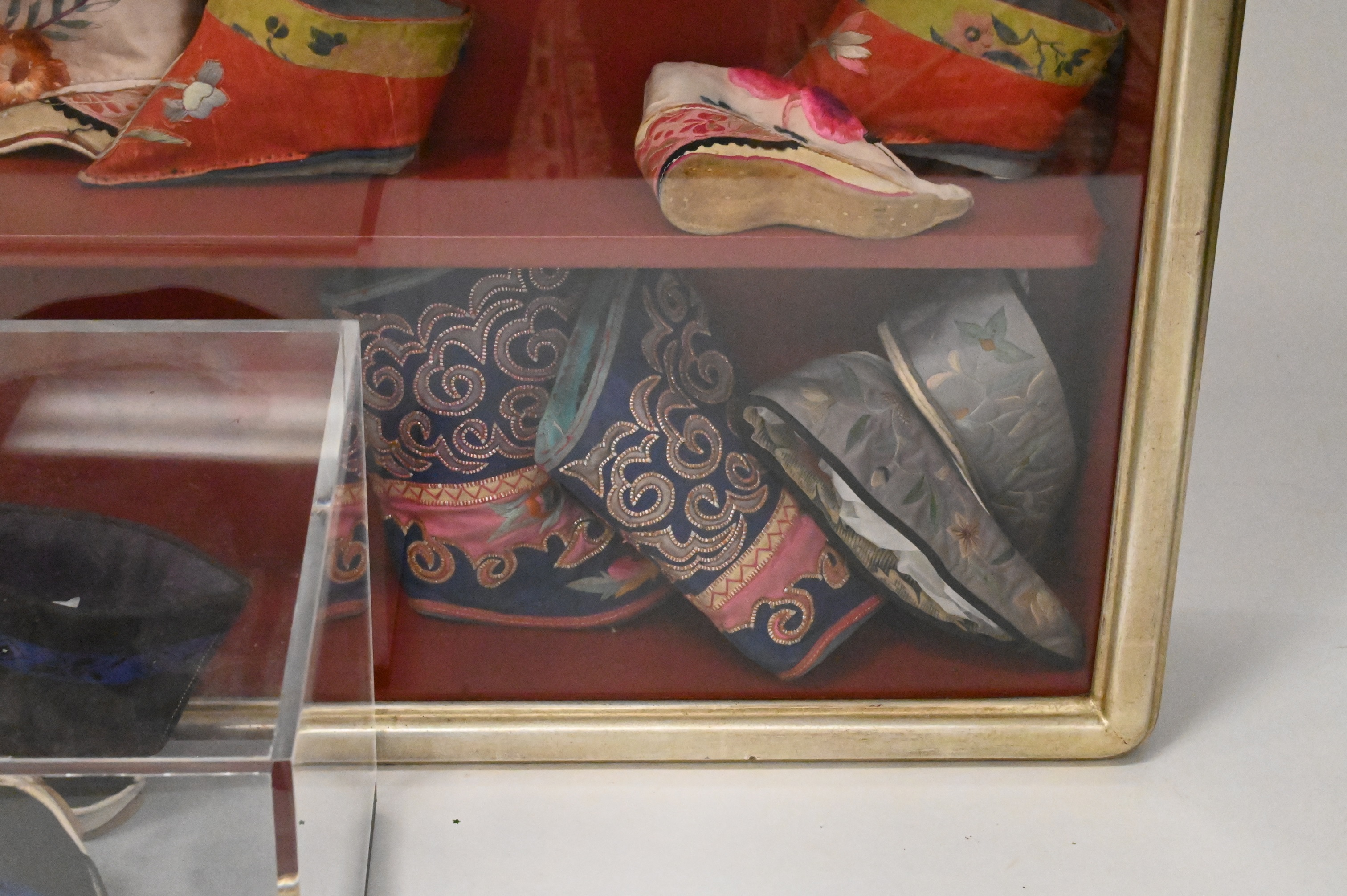Nine Pairs of Chinese Footbinding Silk Slippers, some embroidered, 8 inches, large case 32 inches x 23 inches.
