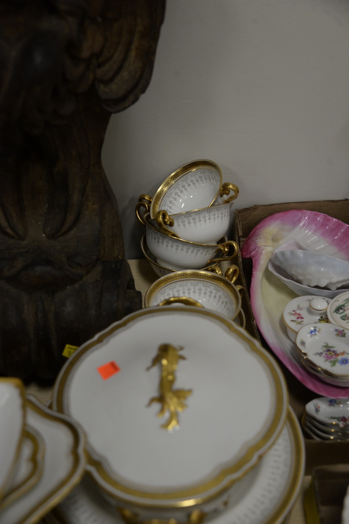 Porcelain Dinnerware Lot, to include 8 Royal Doulton dinner and dessert plates, 8 Royal Doulton saucers 6 Royal Doulton tea cups 2 Limoge covered serving dishes 3 Limoge serving plates a shell plate diameter of dinner plates 9 1/2 inches along with a Royal Worcester serving platter with fruit motif.