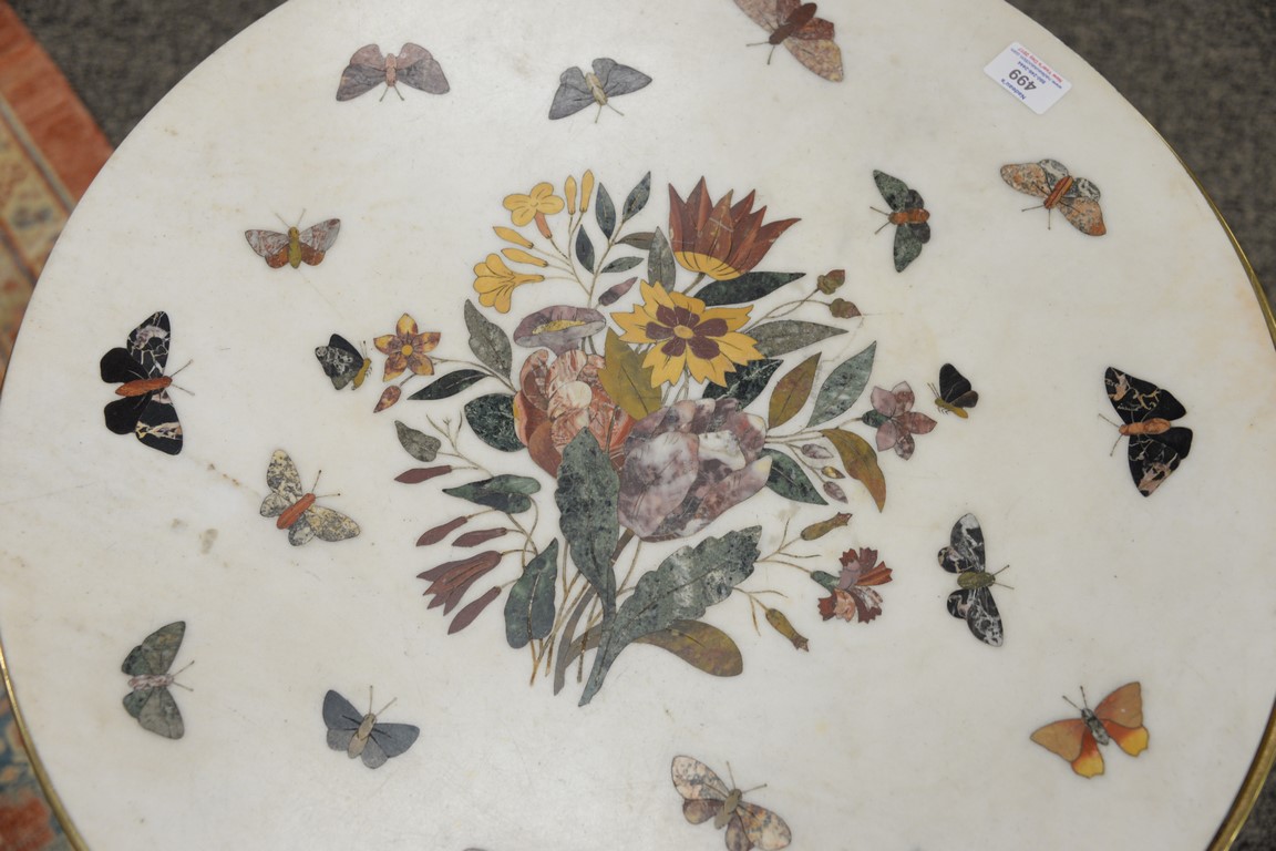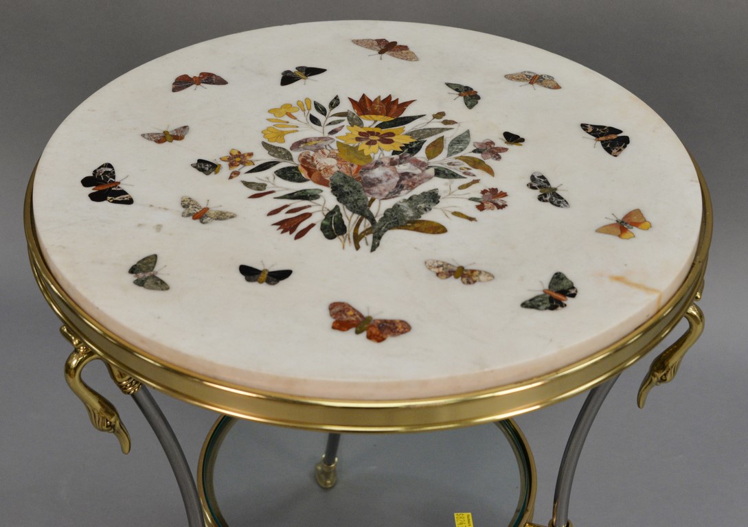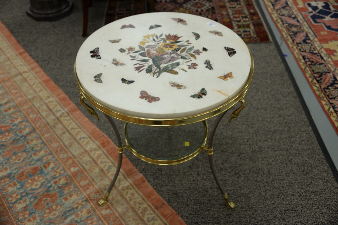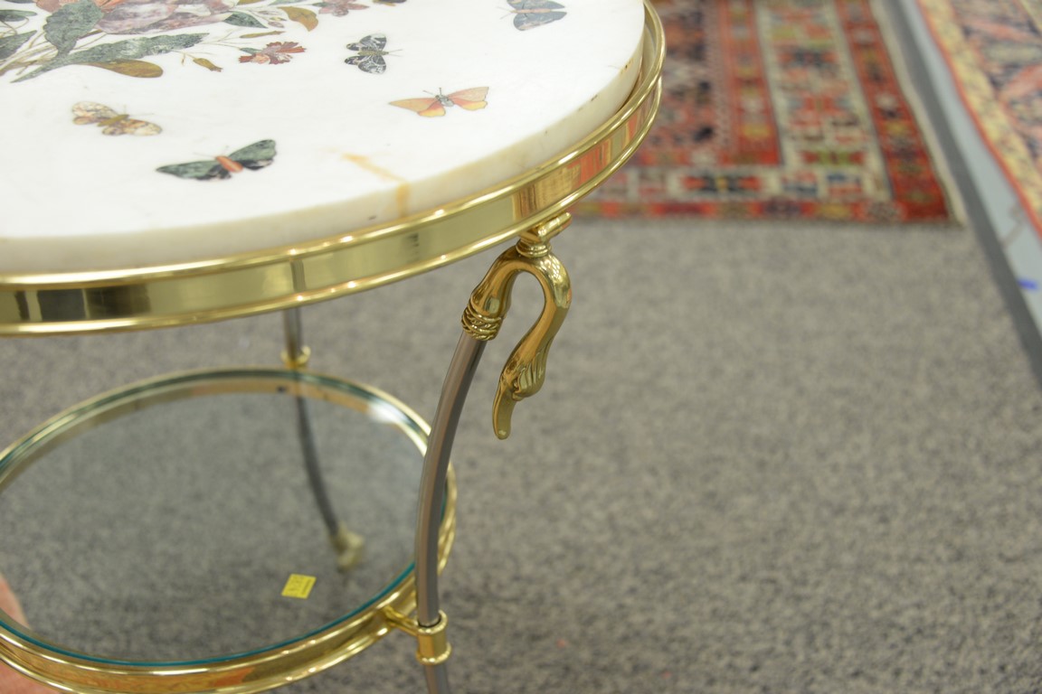 Lot 499: Round Pietra dura top table on brass and steel base with remedial glass shelf, top having white marble with butterflies around bloss…