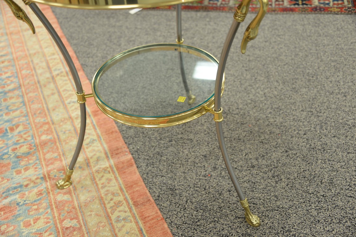 Round Pietra dura top table on brass and steel base with remedial glass shelf, top having white marble with butterflies around blossoming flower center. ht. 27in., dia. 23 1/2in.