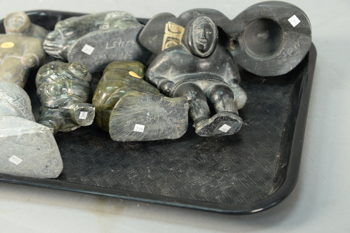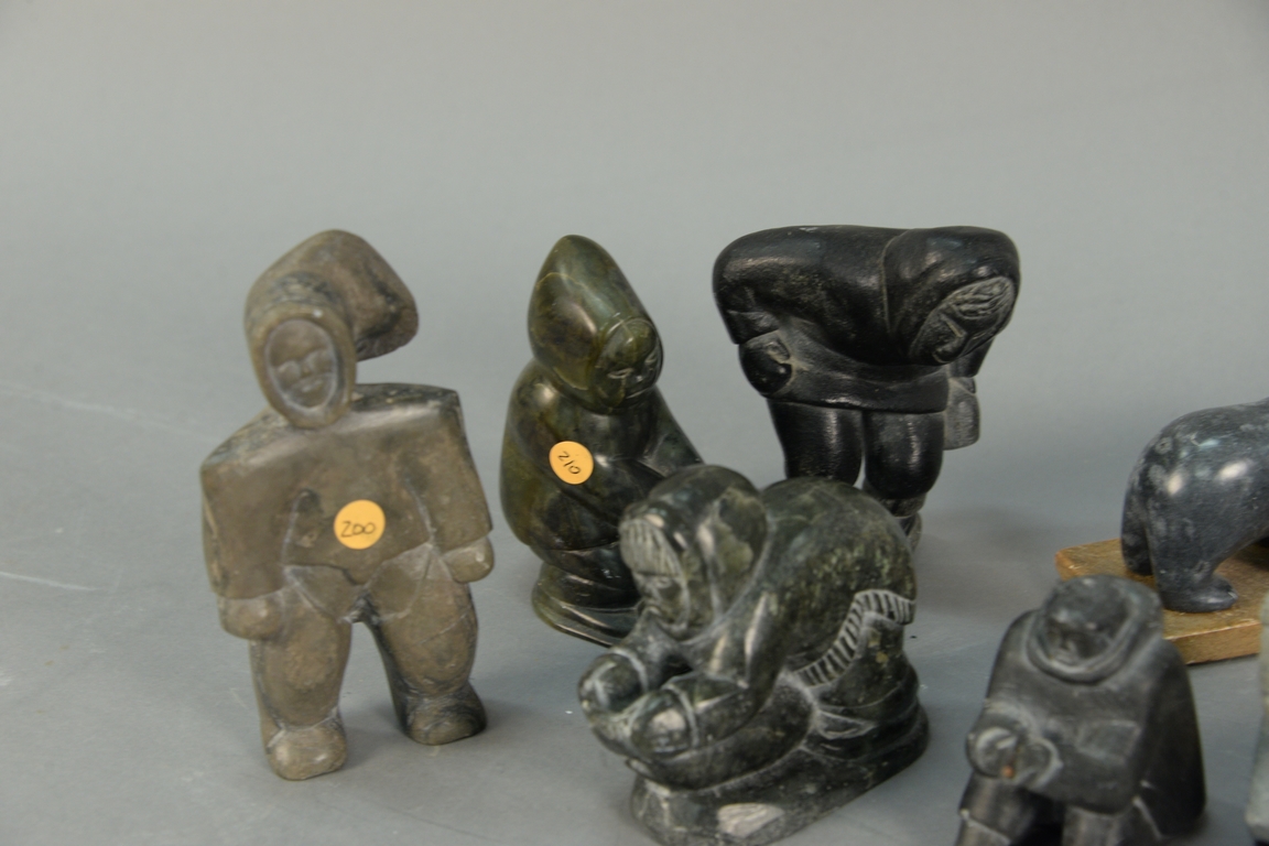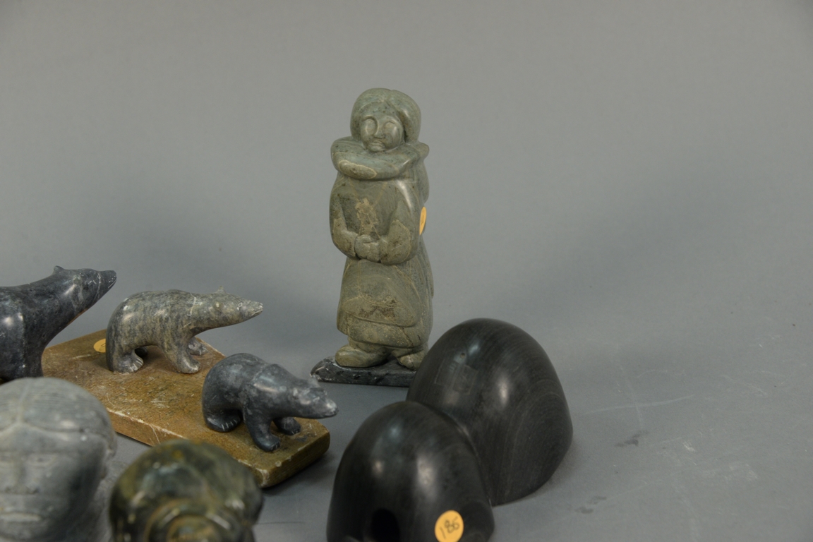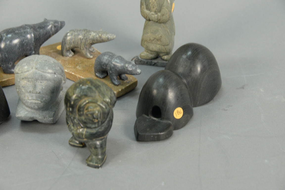 Ten Inuit Eskimo carved figures to include Arctic Quebec Winking Man, Lucassie Innuktaluk b. 1934 Sanikiluaq Sitting fishing Inuk 3 1/2, Moses Appaqaq b. 1946 Sanikiluaq Igloo, Rhoda Kayutak b. 1943 Kogiak Aklavik Inuk/Seal on Back 3 1/2, Mary Akana b.1936 Kuglutuk Inuk/Seal Woman 3 1/2, Moses Nakogee Arctic Quebec Bear & Two Cubs on Base, Coppermine grey soapstone Standing Woman with Kamik, Povirnituq grey soapstone Head of Woman, Paulosie Weetaluktuk b. 1938 Aklaviklnukjuak Inuk/Seal 4 1/2, and Rhoda Sala b. 1943 Sanikiluaq Inuk/Seal 3 1/2. ht. 2 1/2in. to 5 1/2in.