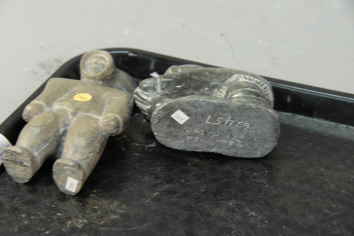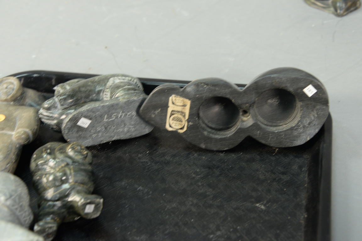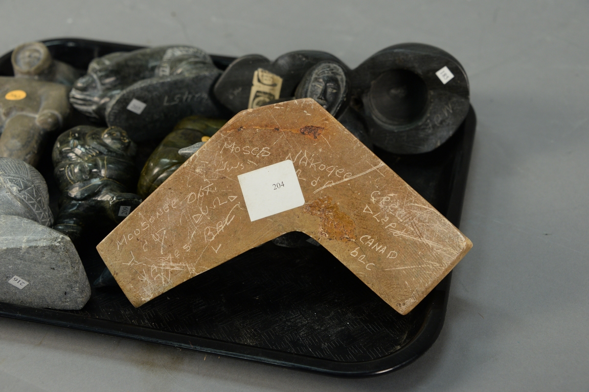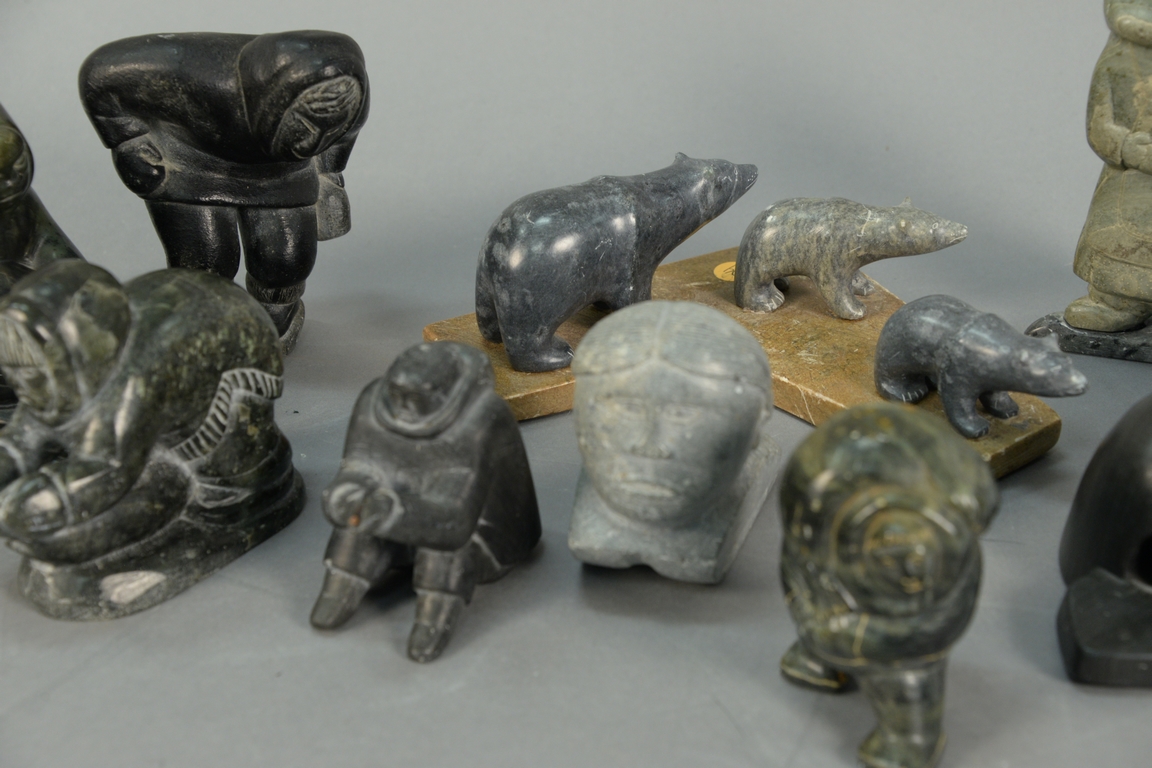 Ten Inuit Eskimo carved figures to include Arctic Quebec Winking Man, Lucassie Innuktaluk b. 1934 Sanikiluaq Sitting fishing Inuk 3 1/2, Moses Appaqaq b. 1946 Sanikiluaq Igloo, Rhoda Kayutak b. 1943 Kogiak Aklavik Inuk/Seal on Back 3 1/2, Mary Akana b.1936 Kuglutuk Inuk/Seal Woman 3 1/2, Moses Nakogee Arctic Quebec Bear & Two Cubs on Base, Coppermine grey soapstone Standing Woman with Kamik, Povirnituq grey soapstone Head of Woman, Paulosie Weetaluktuk b. 1938 Aklaviklnukjuak Inuk/Seal 4 1/2, and Rhoda Sala b. 1943 Sanikiluaq Inuk/Seal 3 1/2. ht. 2 1/2in. to 5 1/2in.