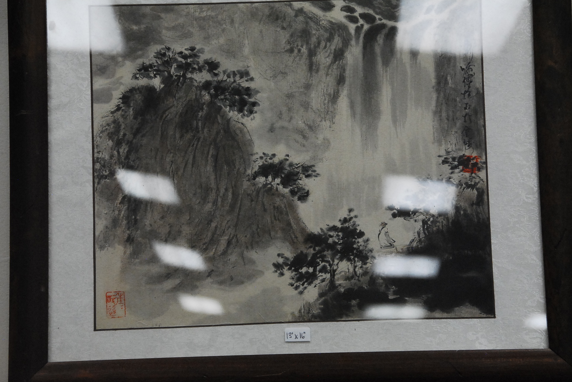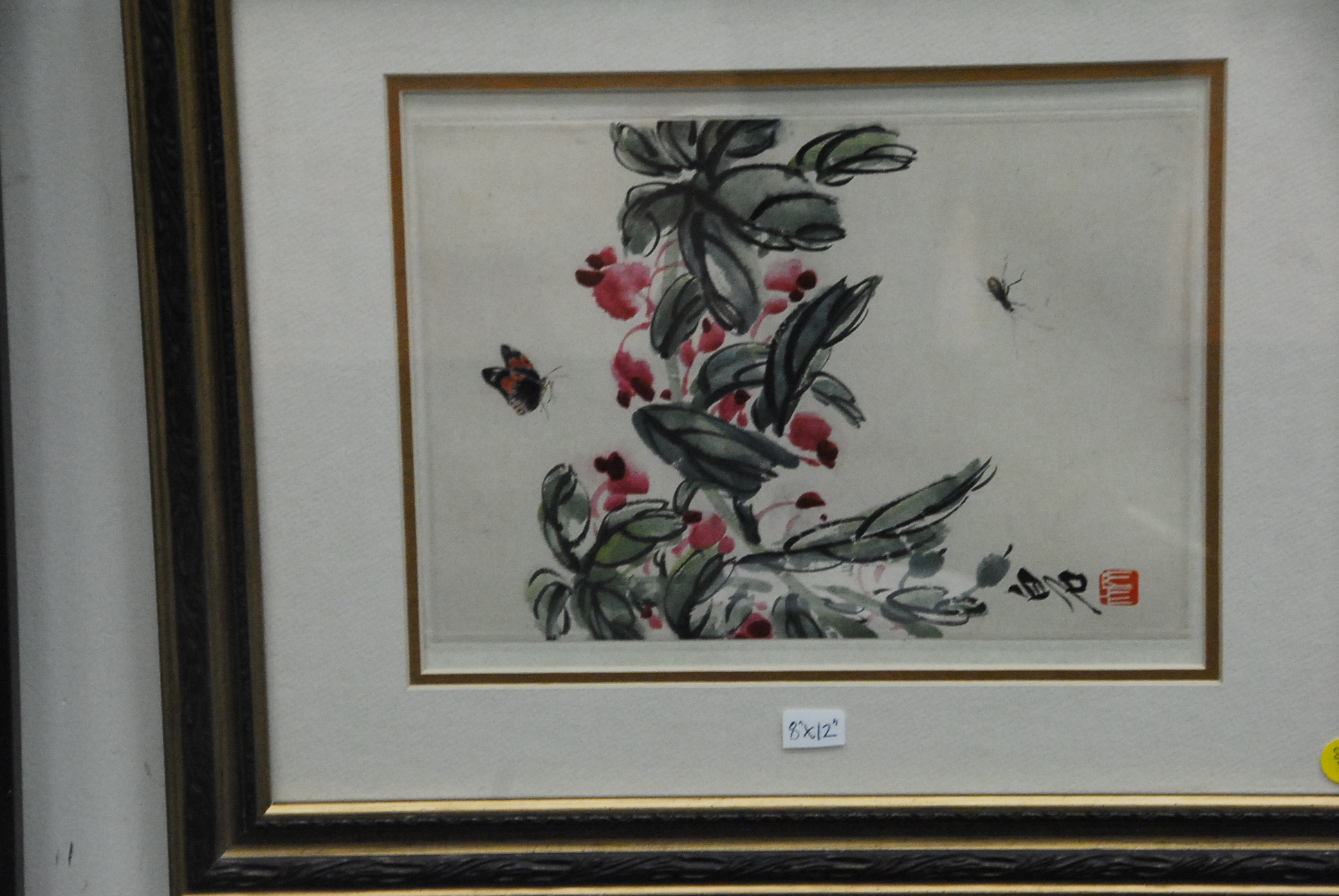 Three framed Oriental watercolors on paper landscape 13 x 16, bird perched on branch 18 x 19, and small trees and bugs 8 x 12.
