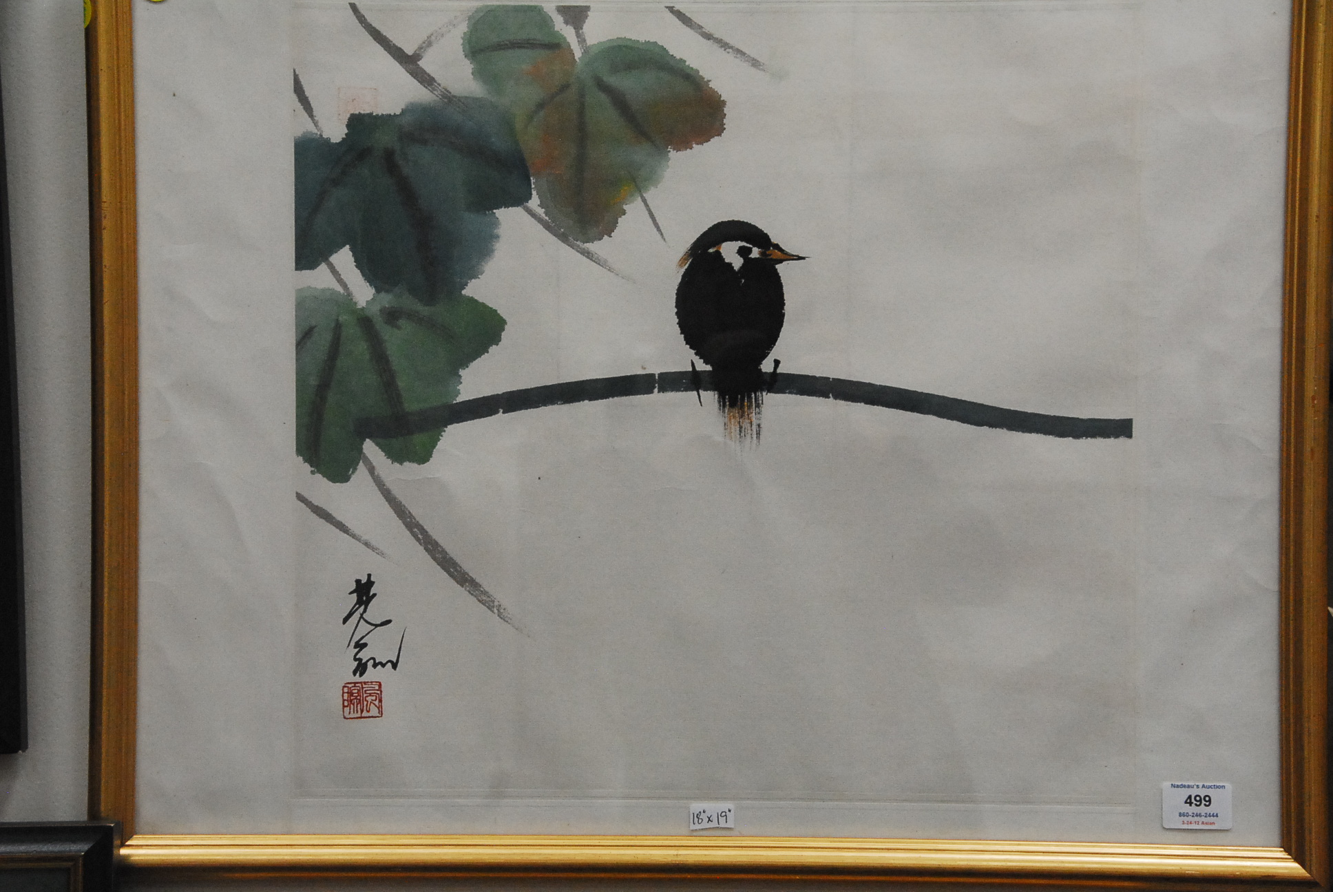 Lot 499: Three framed Oriental watercolors on paper landscape 13 x 16, bird perched on branch 18 x 19, and small trees and bugs 8 x 12.