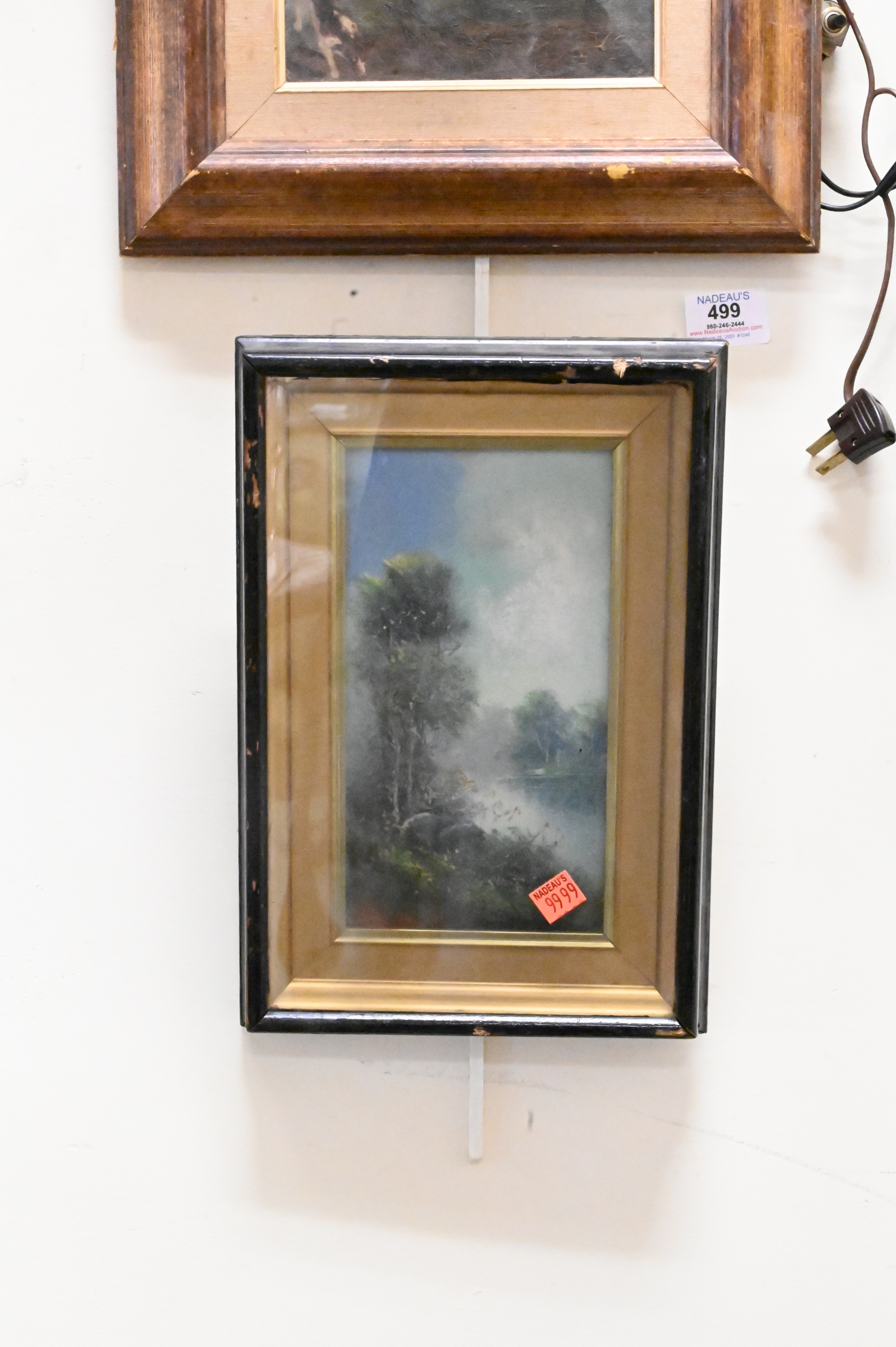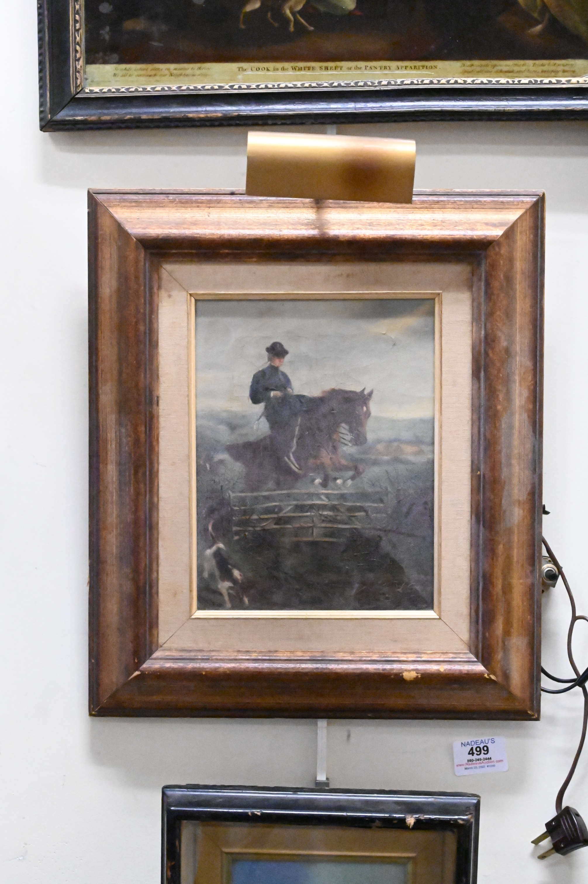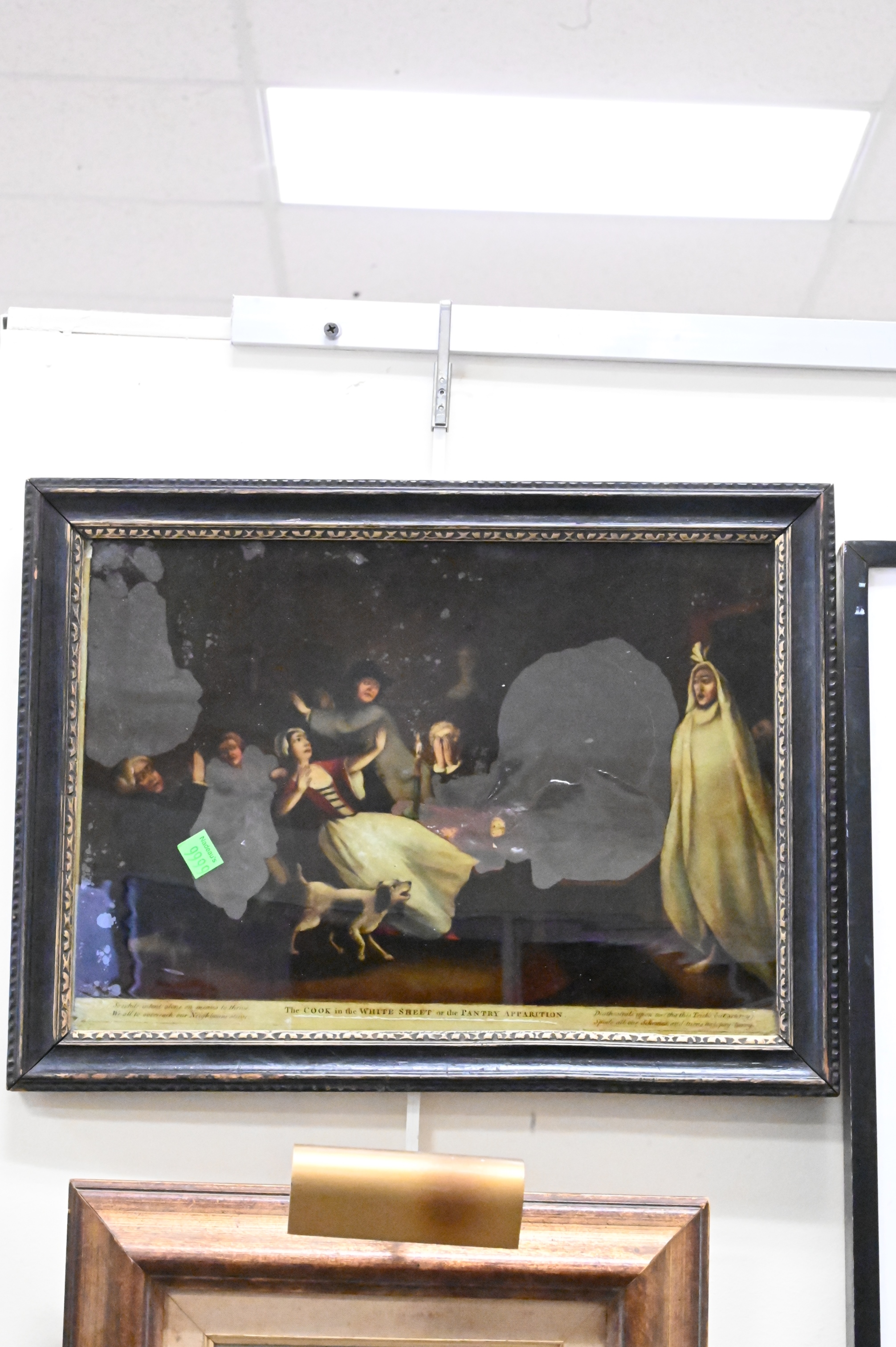 Three Framed Paintings, fox hunt, oil on canvas, 19th century, oil on canvas; a landscape with pond, oil on board; along with a reverse painting on glass, “The Cook in the White Sheet or The Pantry Apparition”; largest 10 1/4″ x 14″.