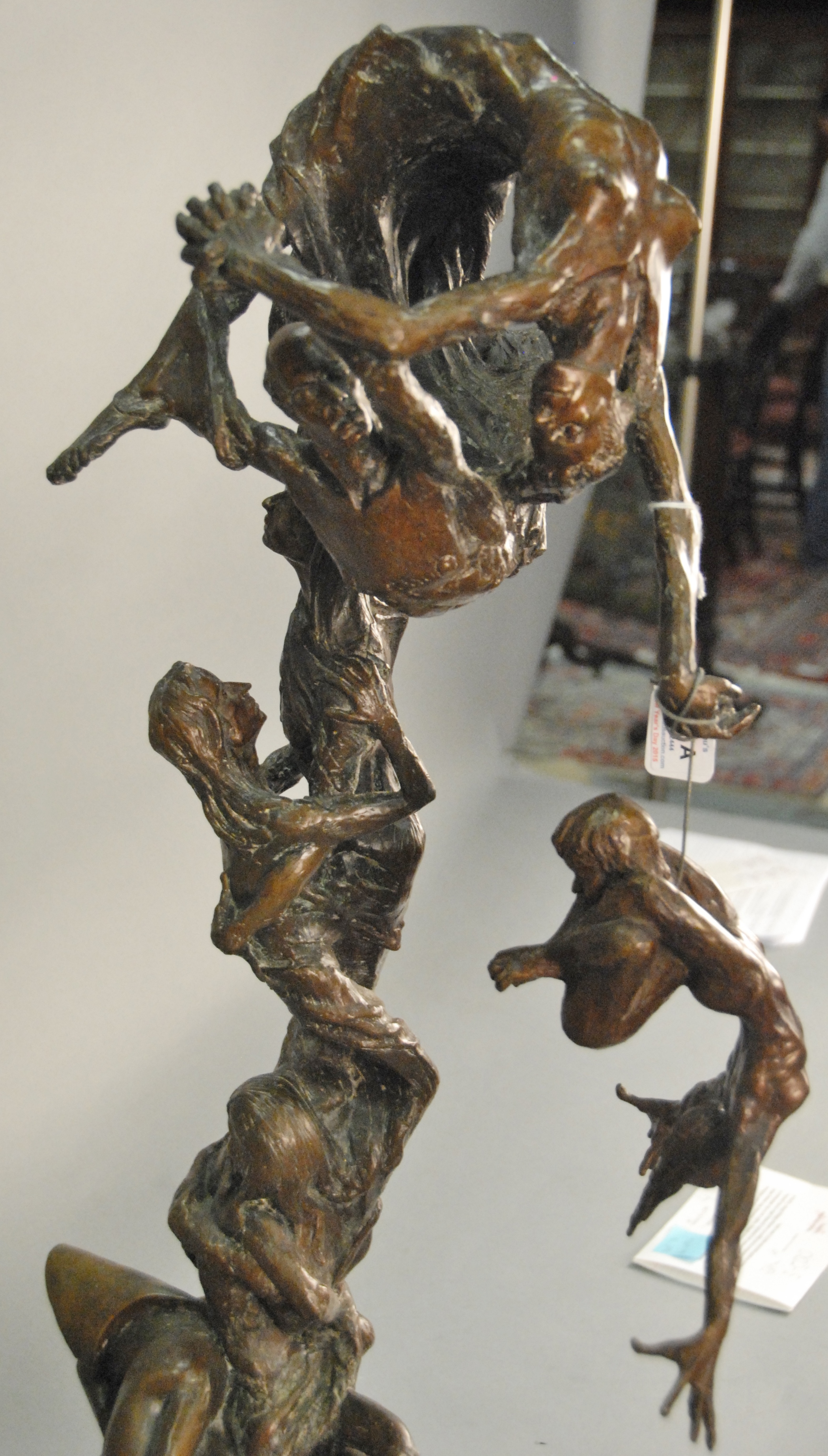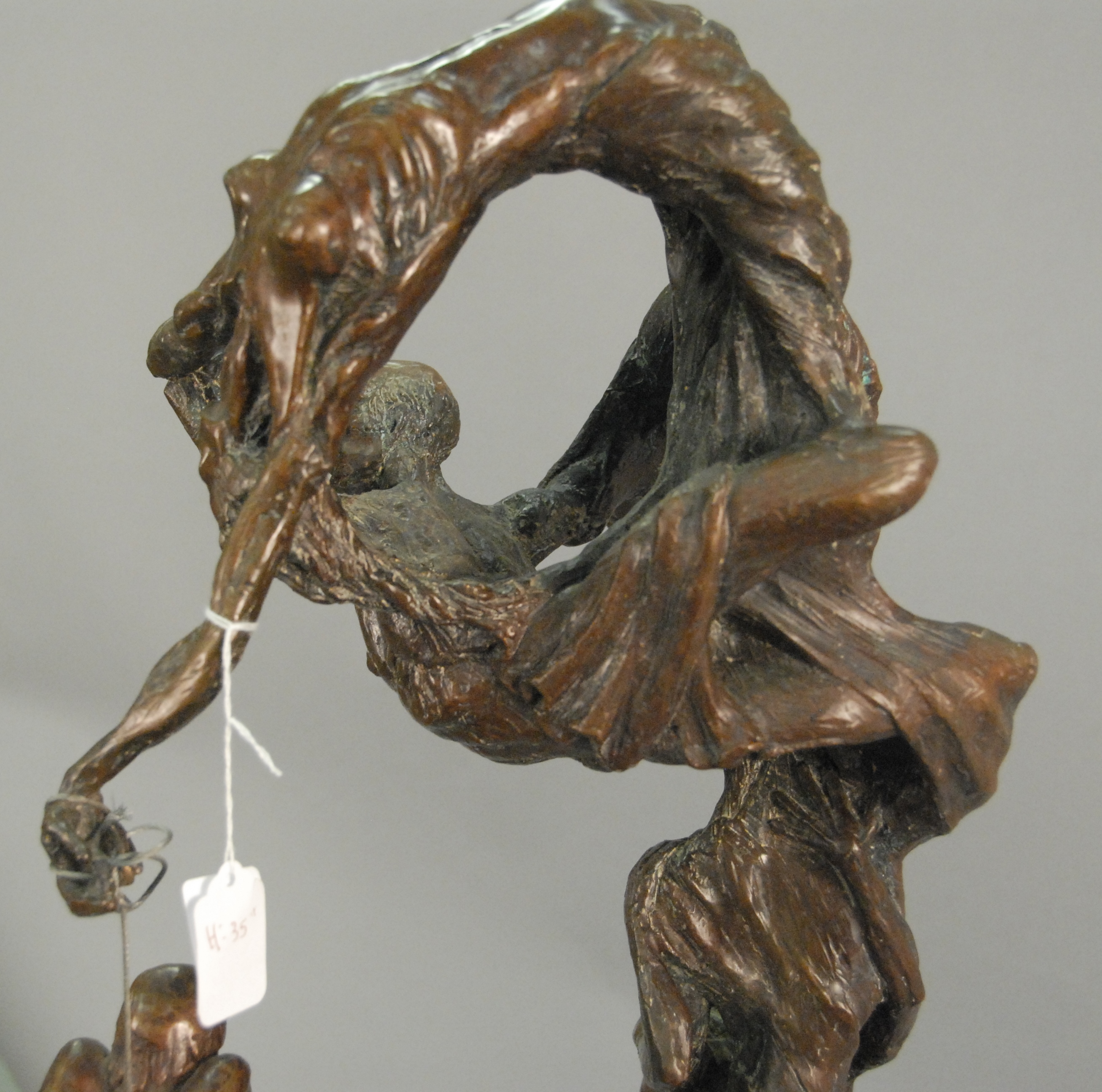 Michael Shacham CYCLE OF LIFE Bronze Sculpture Starting with the agony of childbearing, leading to birth and childhood. Continuing with children at play, gradually maturing into young adults coming together in an embrace, getting caught up in the whirlwind of life, being whipped around and gradually growing older in the process, until death, symbolized by the figure of a woman falling off the Cycle of Life which in itself holds the bud of a new cycle. ht. 35 in.