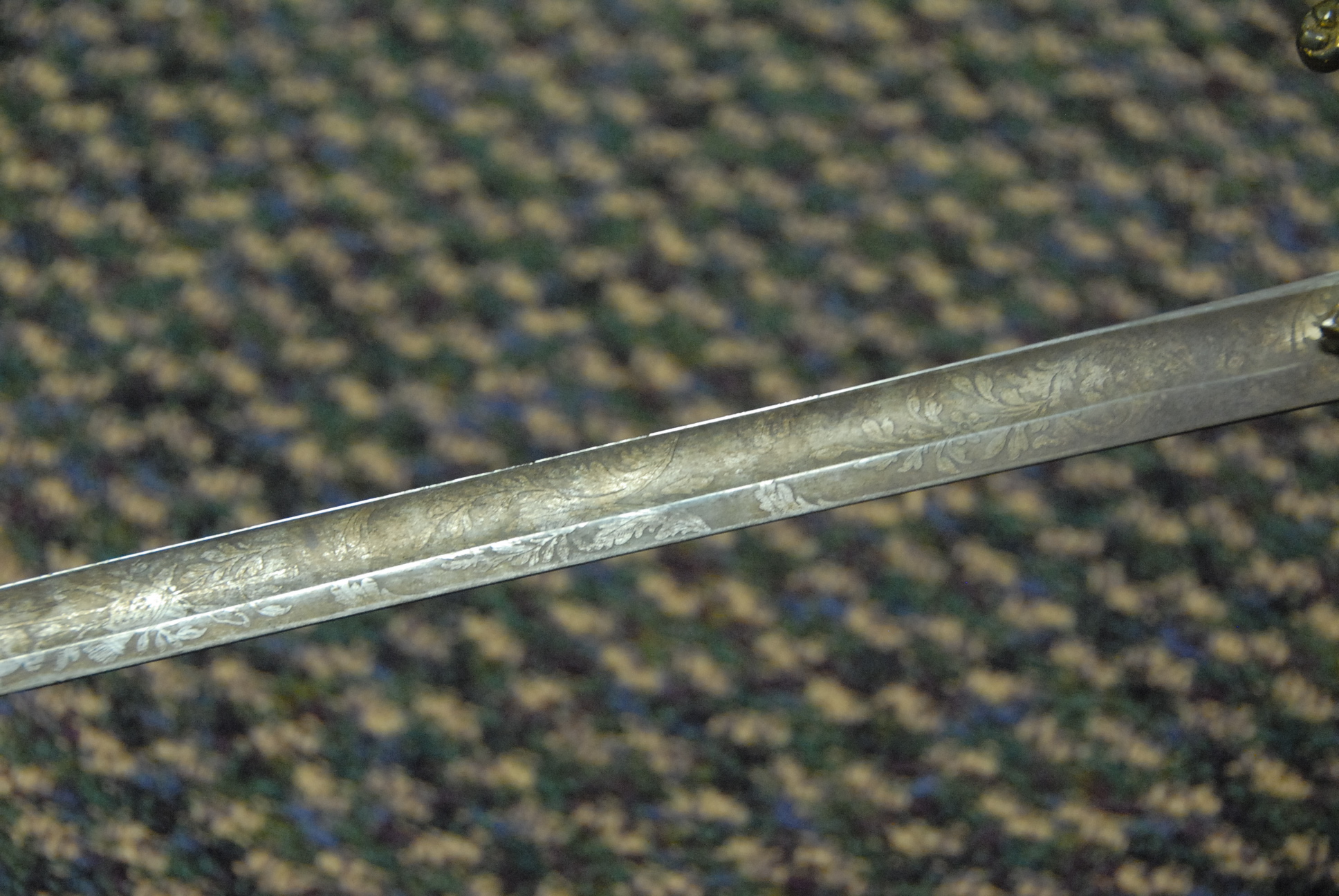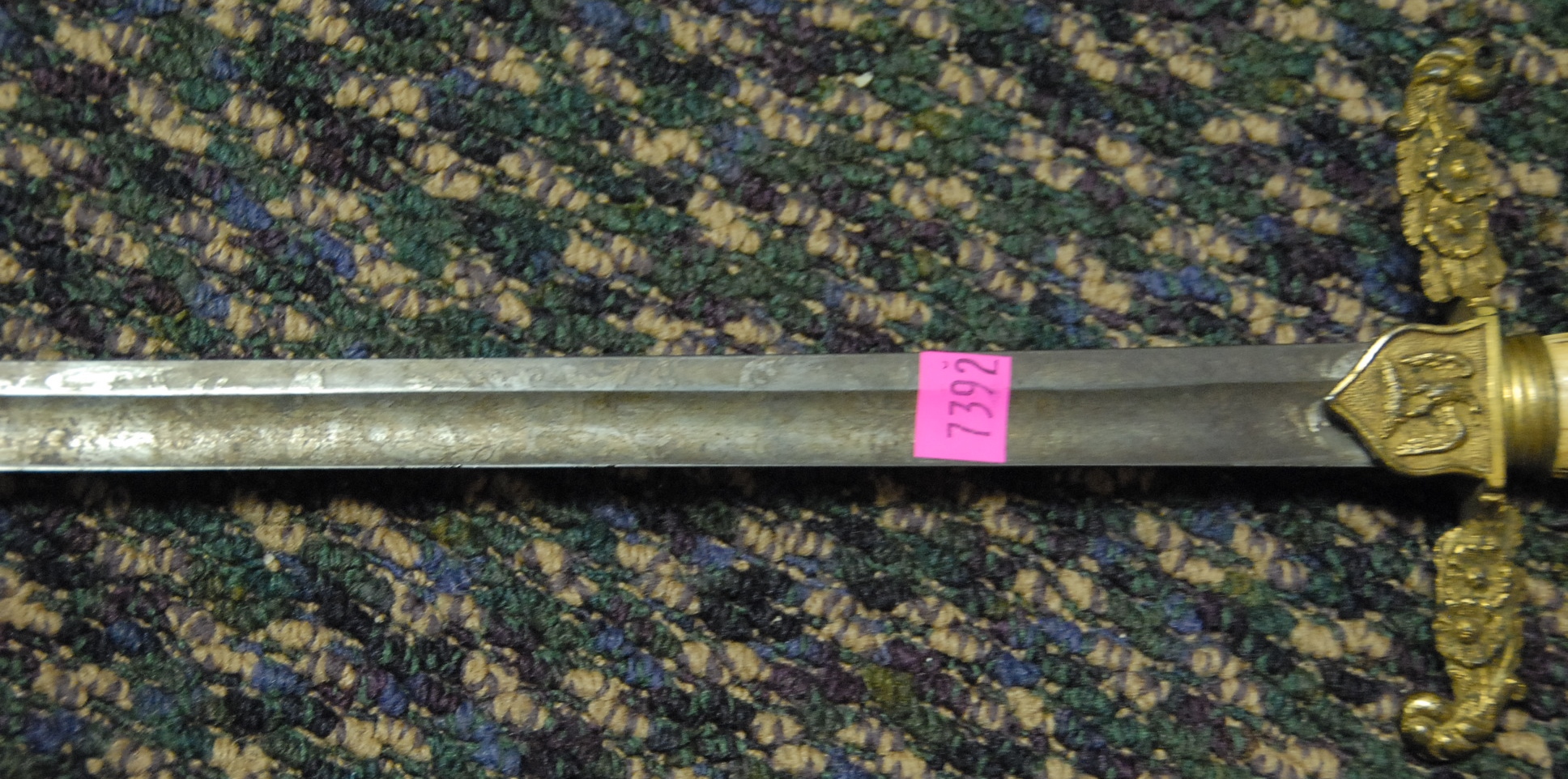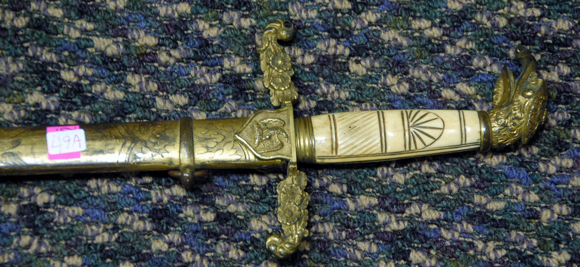 Lot 49A: Bone handle eagle-mounted sword with sheath, 30 1/2 inch blade with engravings on it.