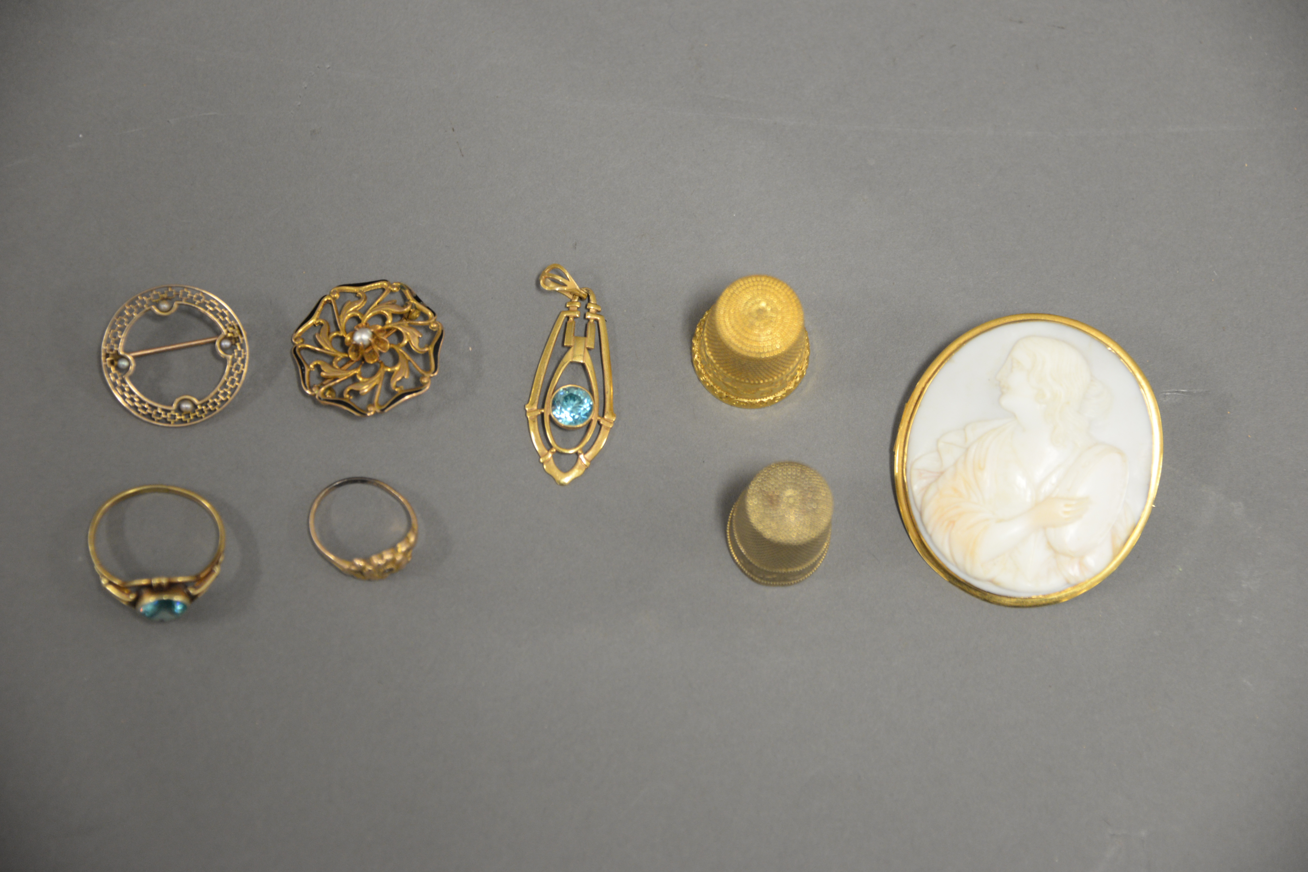 Jewelry lot to include shell cameo with gold mount, two thimbles, two gold pins with pearls, small gold ring, and gold ring and pendant each with blue stone.