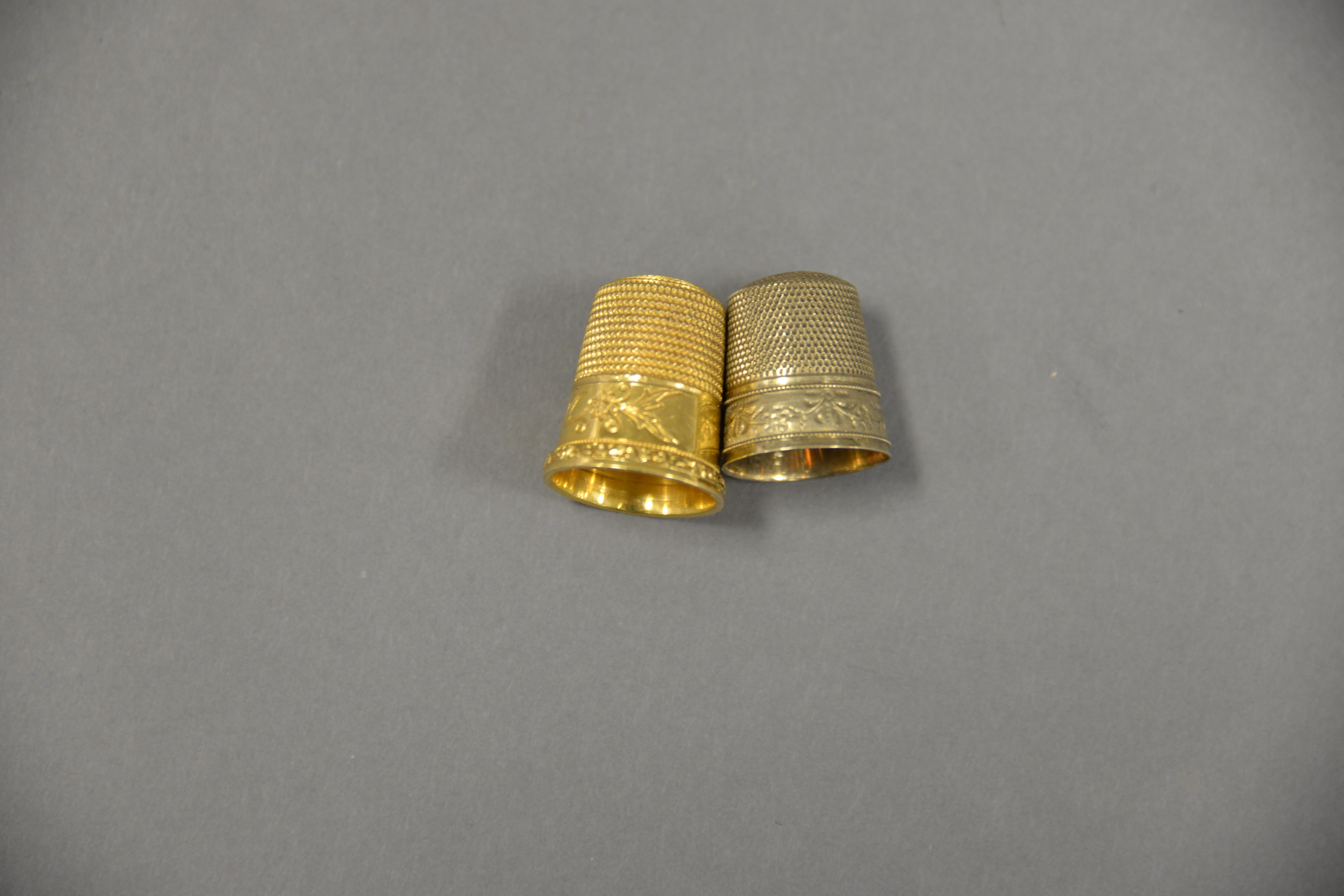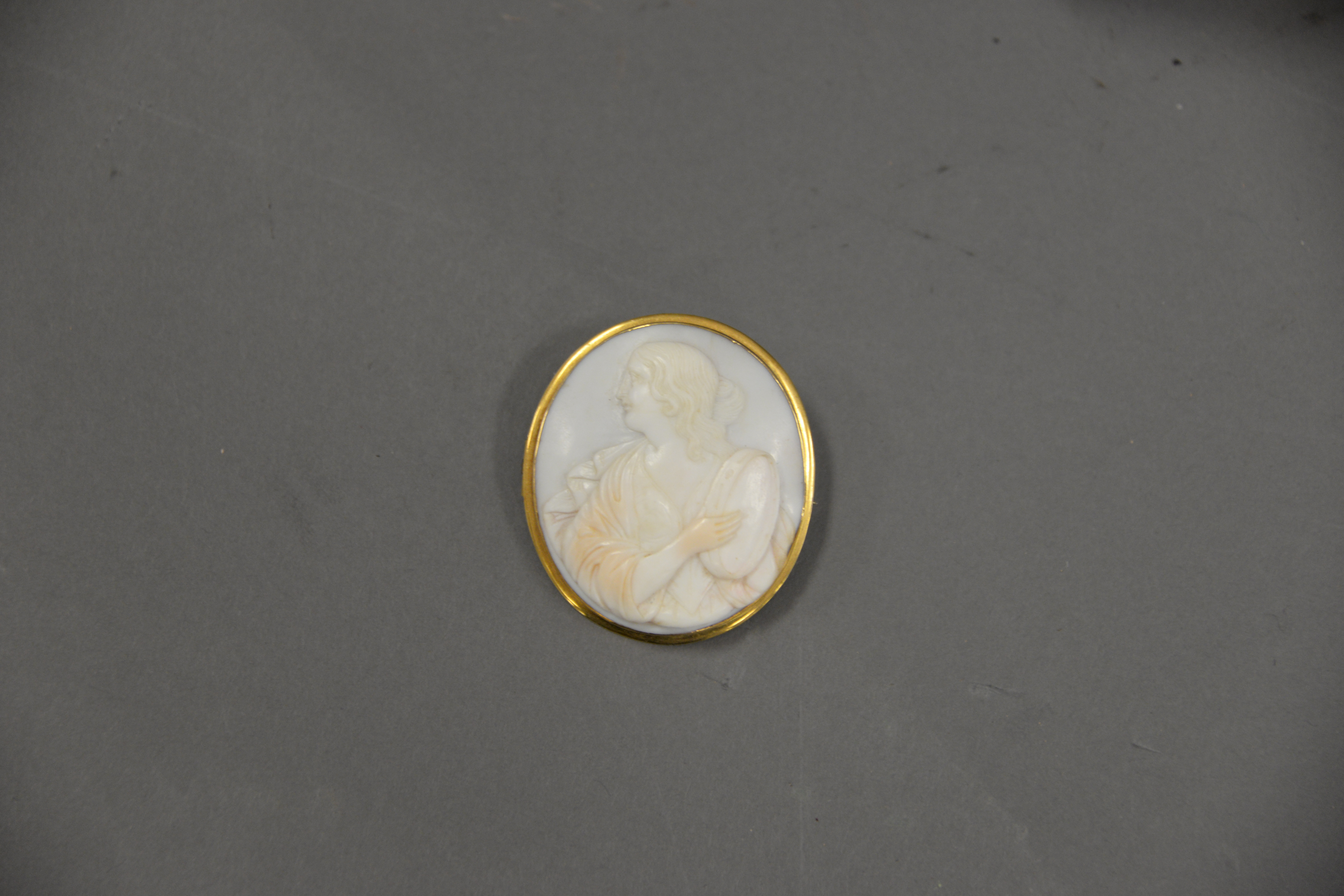 Lot 4A: Jewelry lot to include shell cameo with gold mount, two thimbles, two gold pins with pearls, small gold ring, and gold ring and pend…