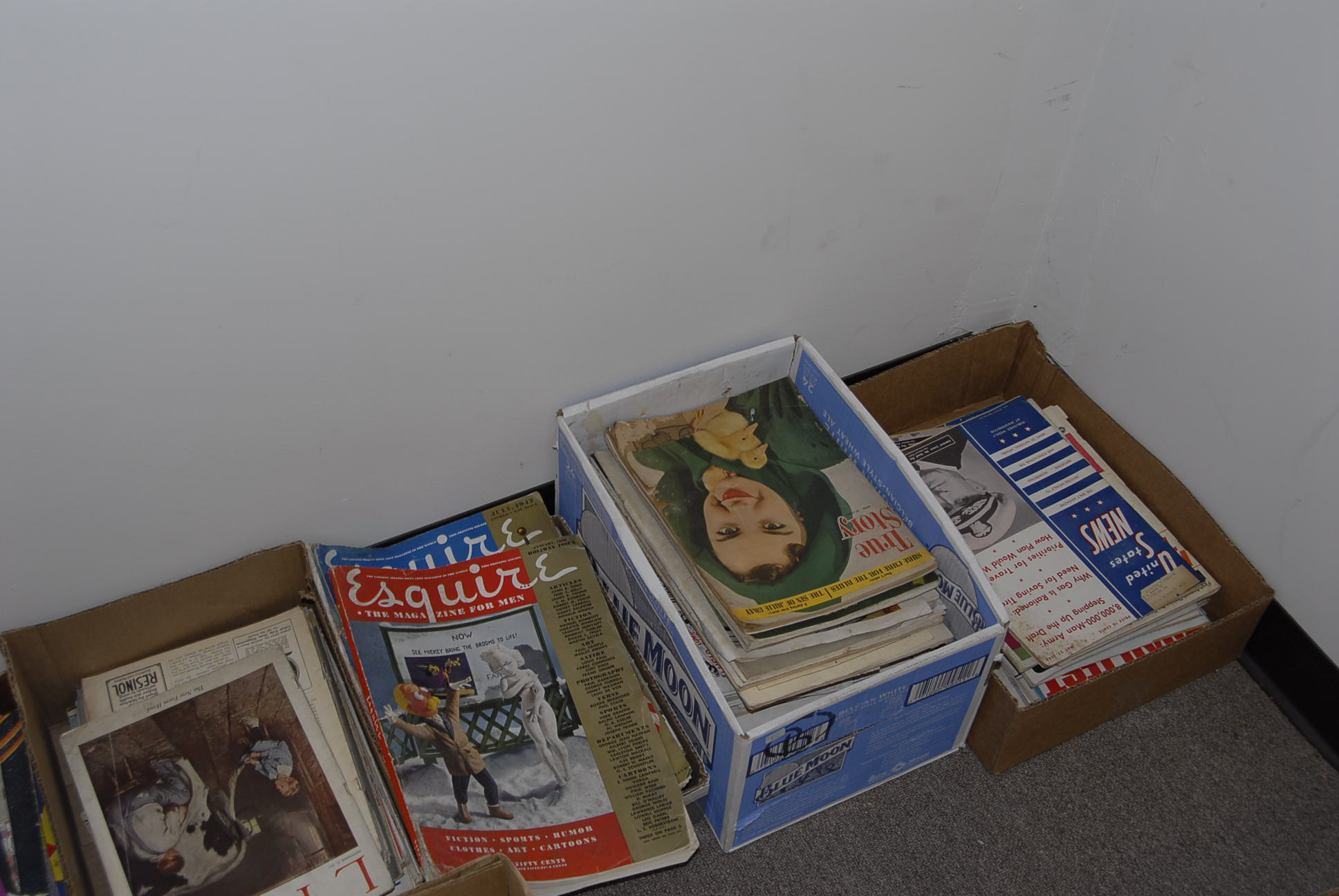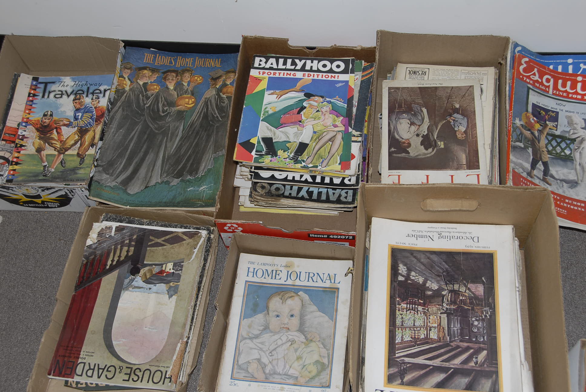 11 small box lots of early to mid-20th century magazines, including: Highway Traveler, Ladies Home Journal October 1905 Halloween edition, Ladies Home Journal 1905 group, Country Life 1929, Ballyhoo sporting edition, Esquire 1940s Vargas Girl pin-ups, College Humor, and more.