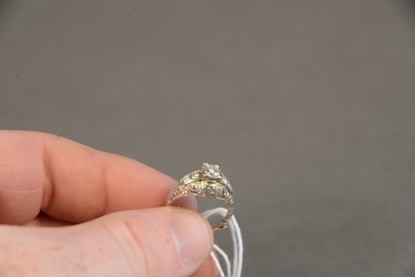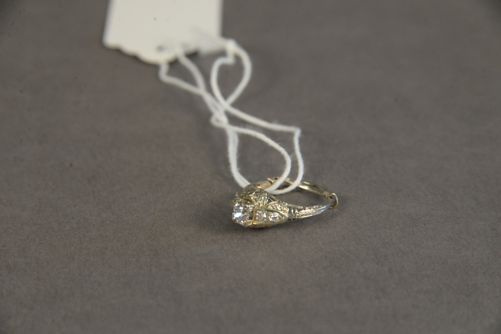 Lot 5: 14 Karat White Gold Filigree Ring, set with center diamond, approximately .40 carats, flanked by two diamonds on either side, size 5.