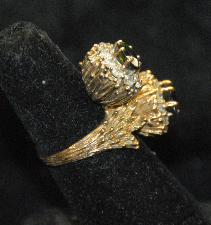 Lot 5: 14K gold cocktail ring set with two marquis shape tourmalines each surrounded by twelve diamonds. 13.1 grams