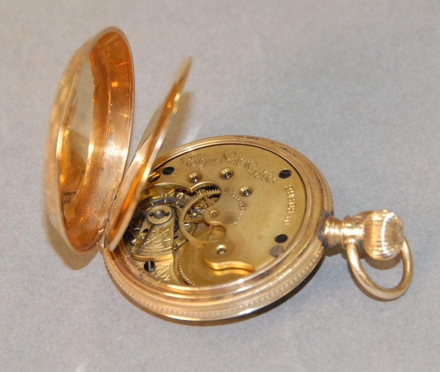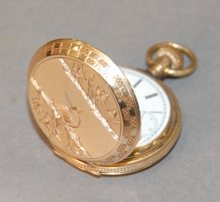 14kt gold hunting case pocket watch with etched bird in crisp condition. total weight 56.4 grams